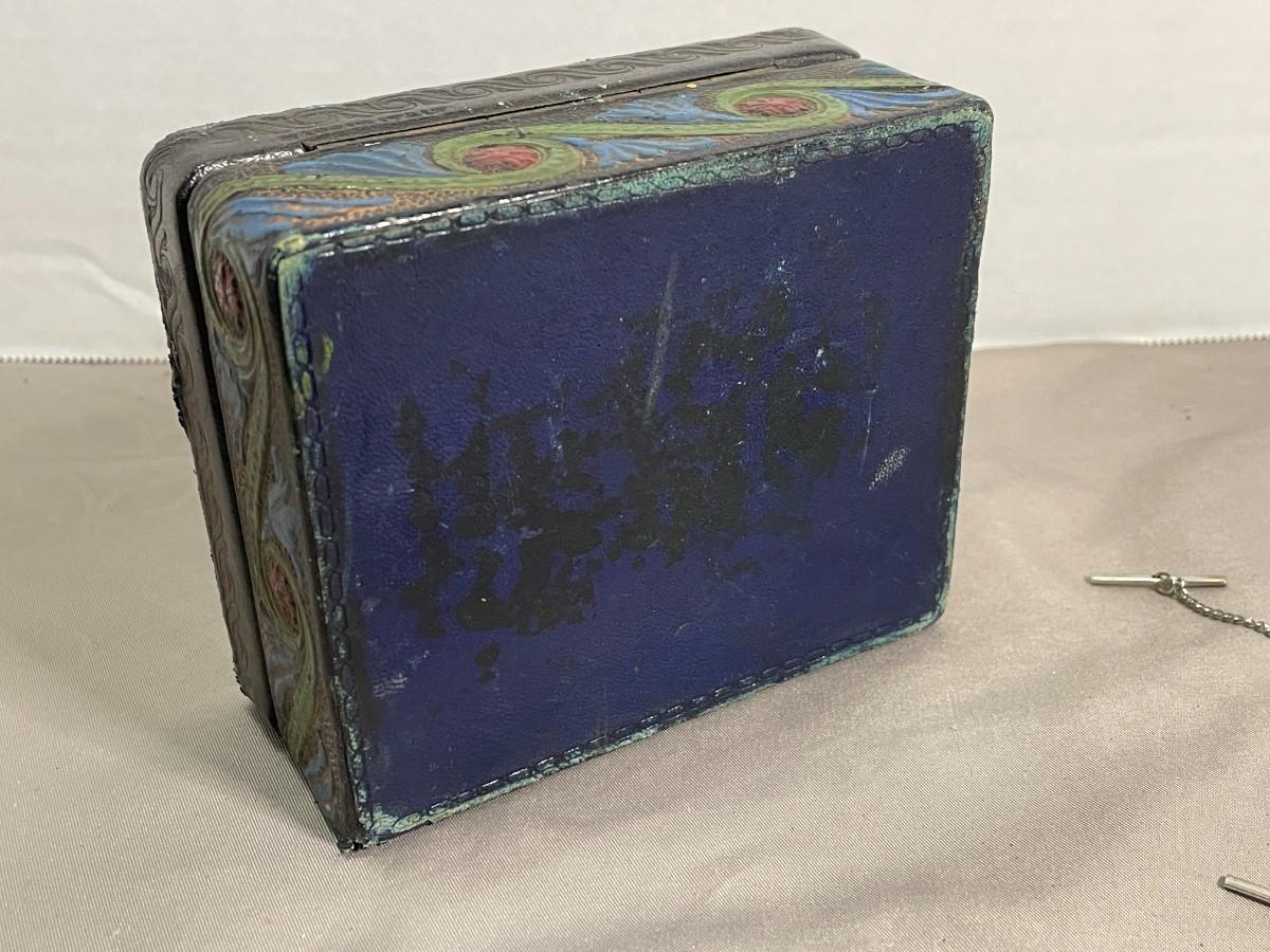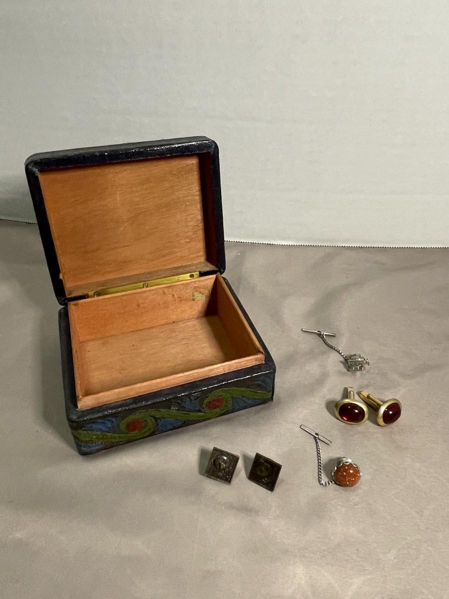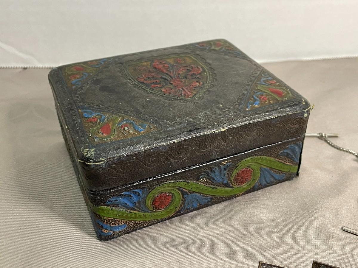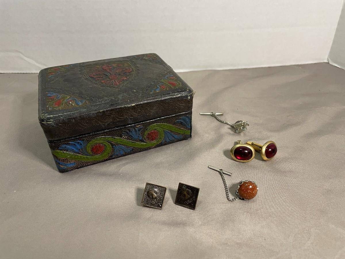 The leather covered box is about 3.5 inches by 4.5 inches and made of wood covered in a tooled leather. The men's jewelry is all unmarked.
