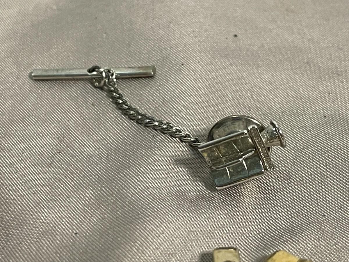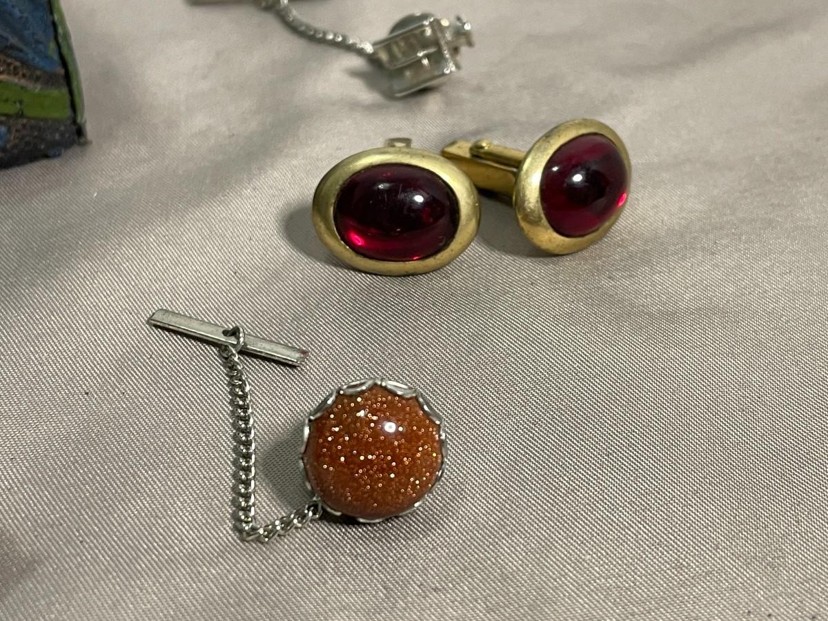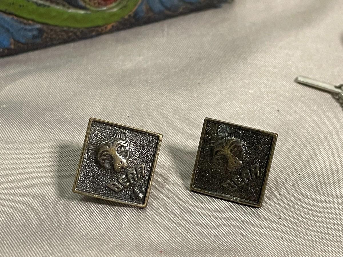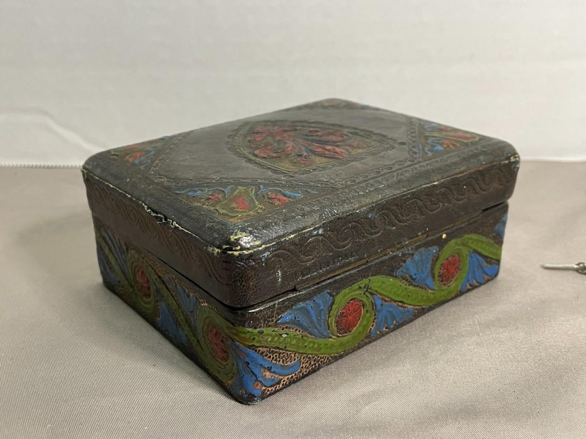 The leather covered box is about 3.5 inches by 4.5 inches and made of wood covered in a tooled leather. The men's jewelry is all unmarked.
