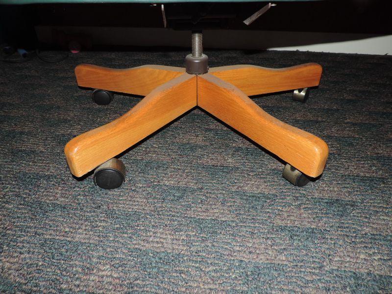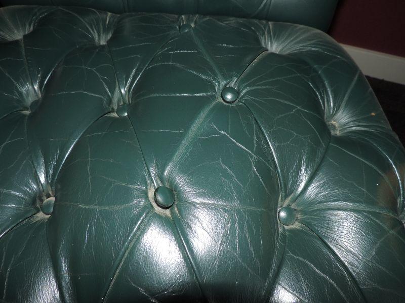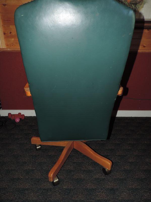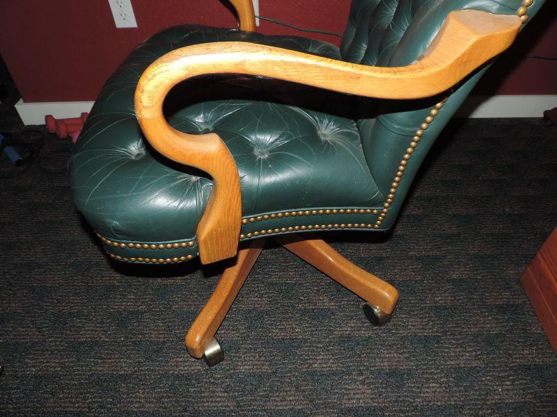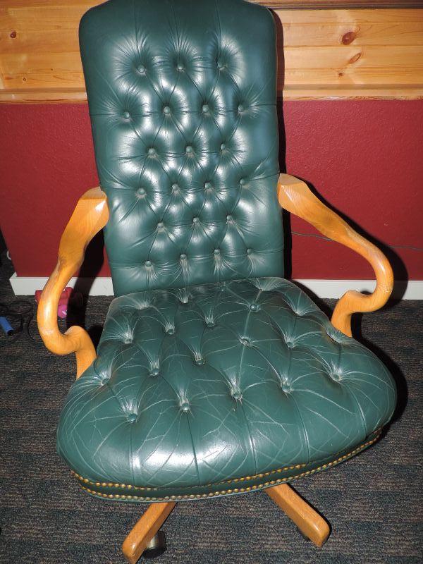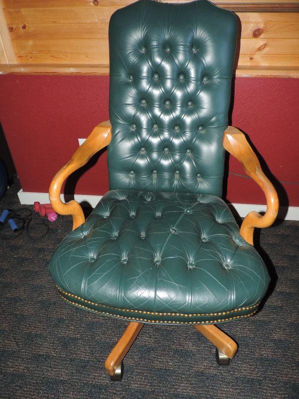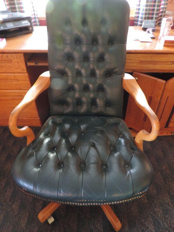 GREEN LEATHER WOOD BASE AND ARMS, ON CASTORS, THE SEAT HAS LOST A FEW BUTTONS OTHERWISE VERY NICE