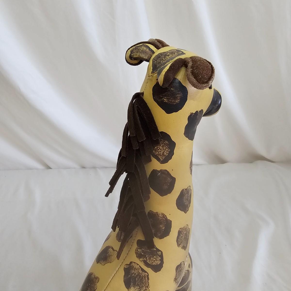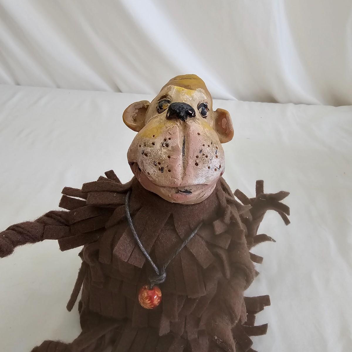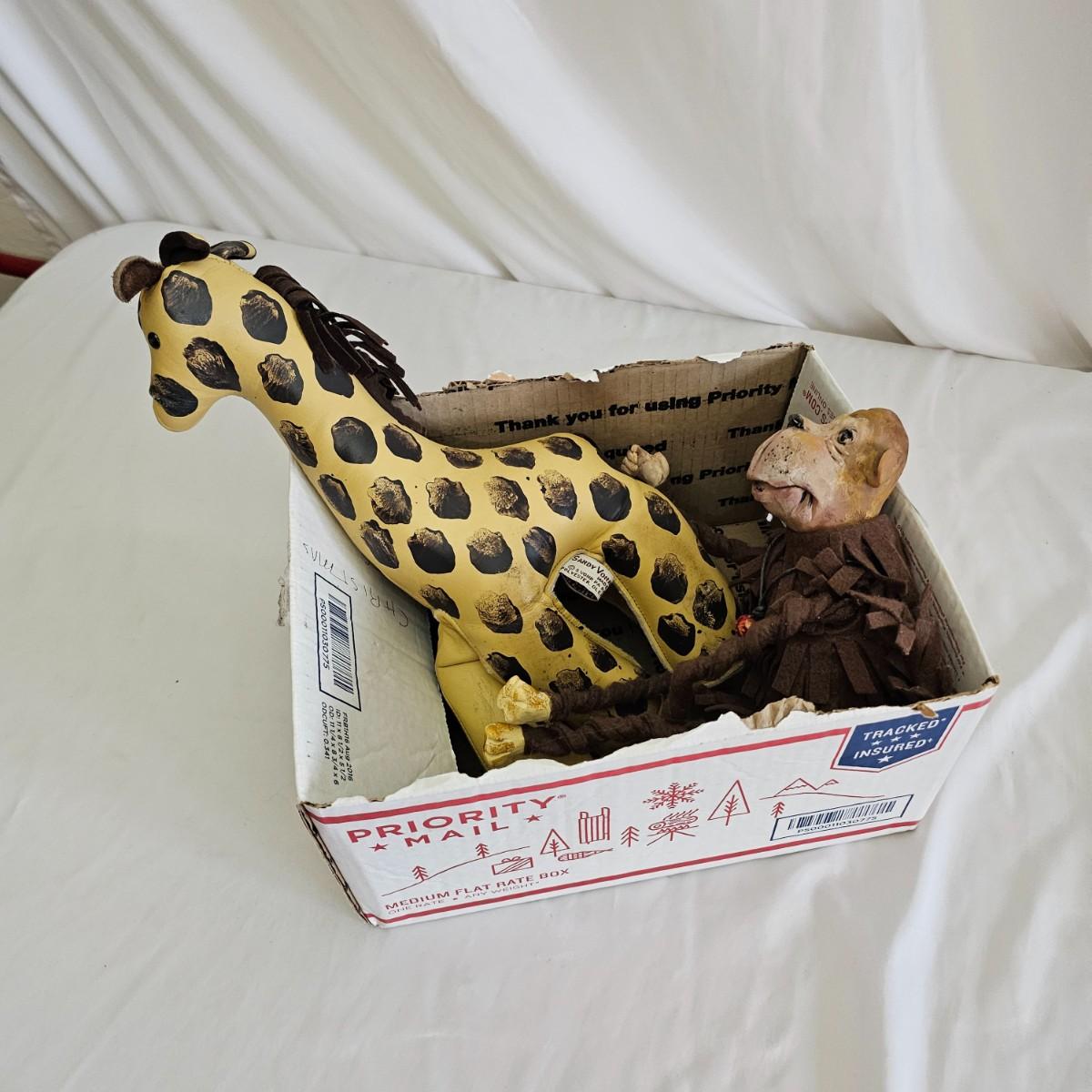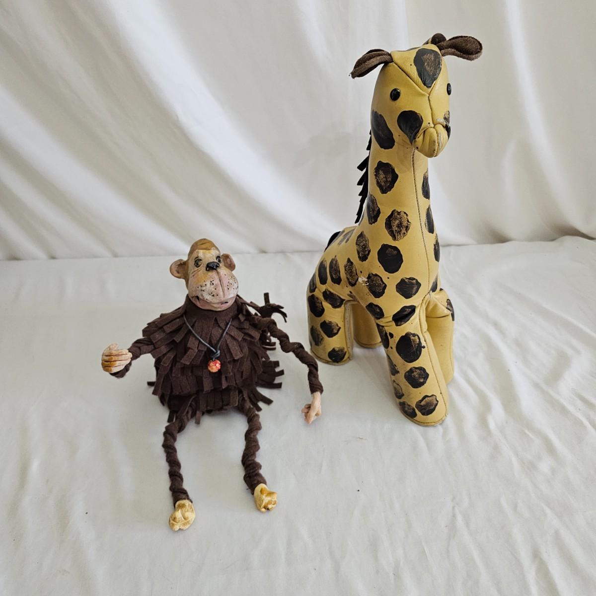 A sitting monkey and a standing giraffe figure. Giraffe is by Sandy Vohr's Leather Zoo, has leather body, mane and ears. Measures 4" x 8" x 14"H, is filled with something heavy to stand up. Monkeys body is felt fringe over a wire armature with wood head, feet and hands. Measures 7" x 9" x 6"H. Arms and legs are potable. See photos for details. Shipping available.