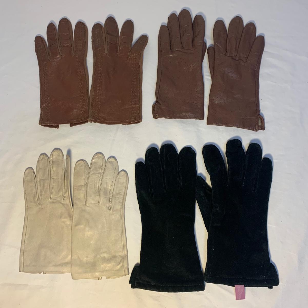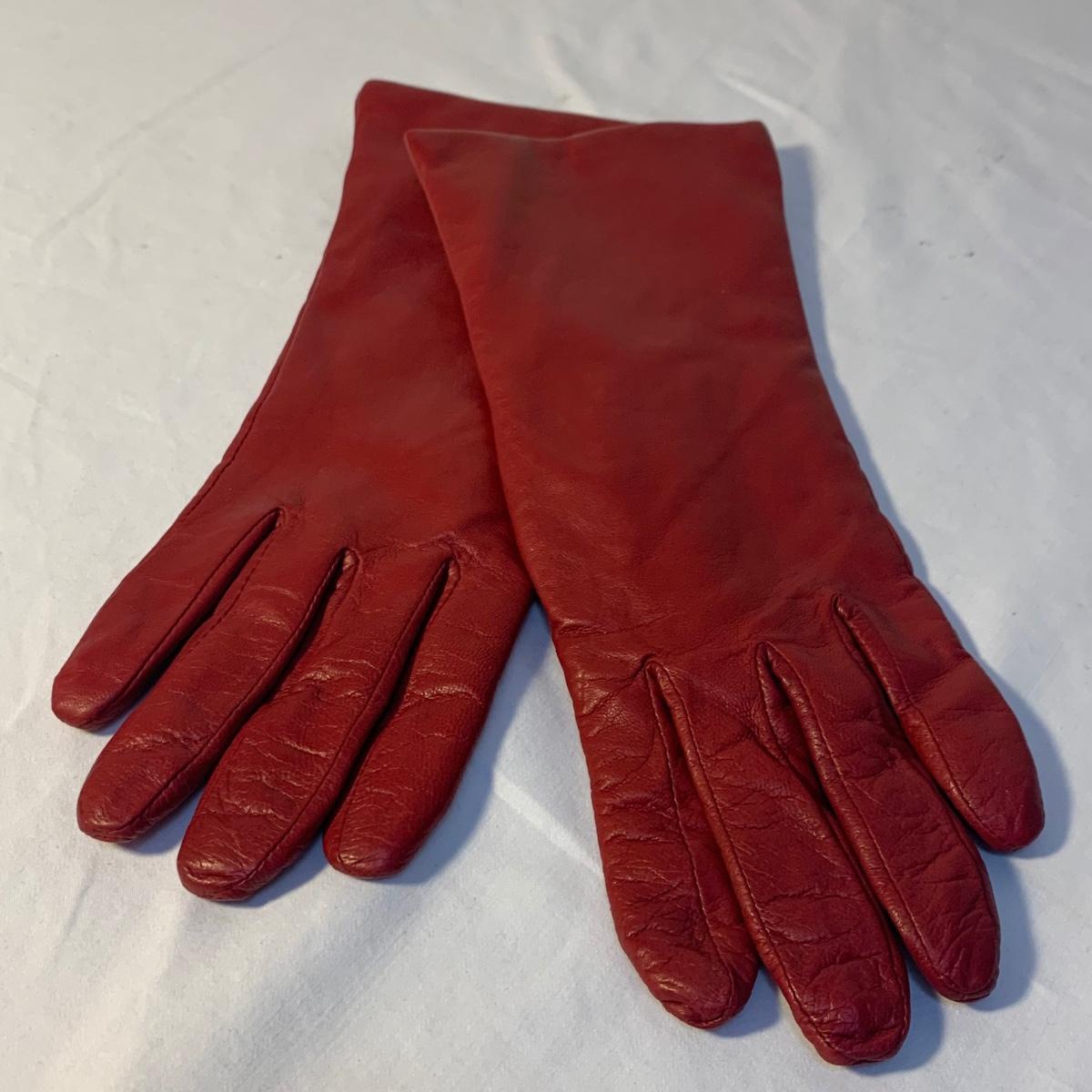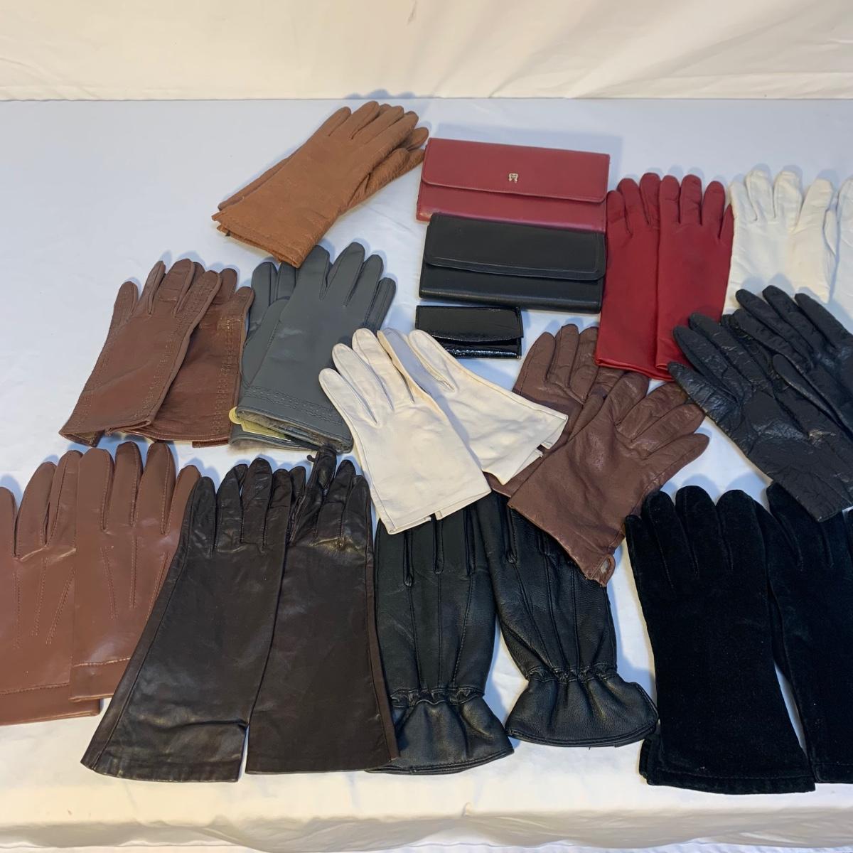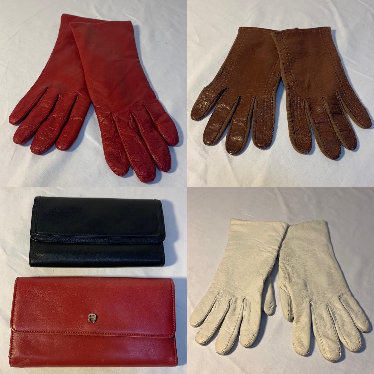 12 pairs of gloves, mostly leather or leather-like. Gloves fit mostly like a women’s size small or medium. Three leather wallets also are included. The red wallet is Etienne Aigner brand and is new with its tag. It has a little smudge on it that appears to be cleanable. It is approximately 7.5” x 4”. A couple items have wear; see photos.