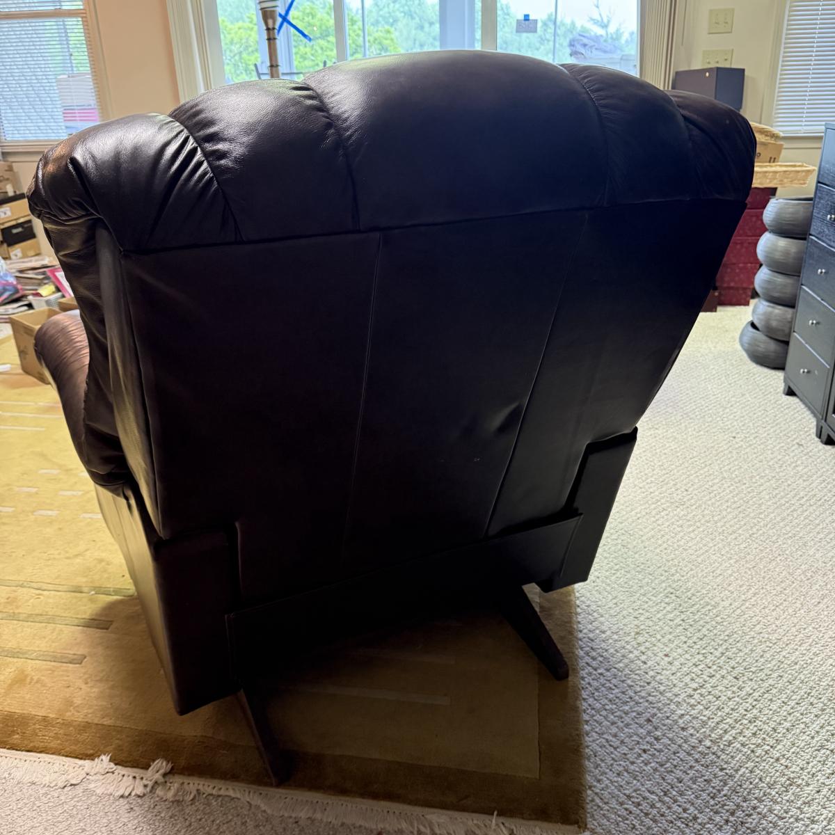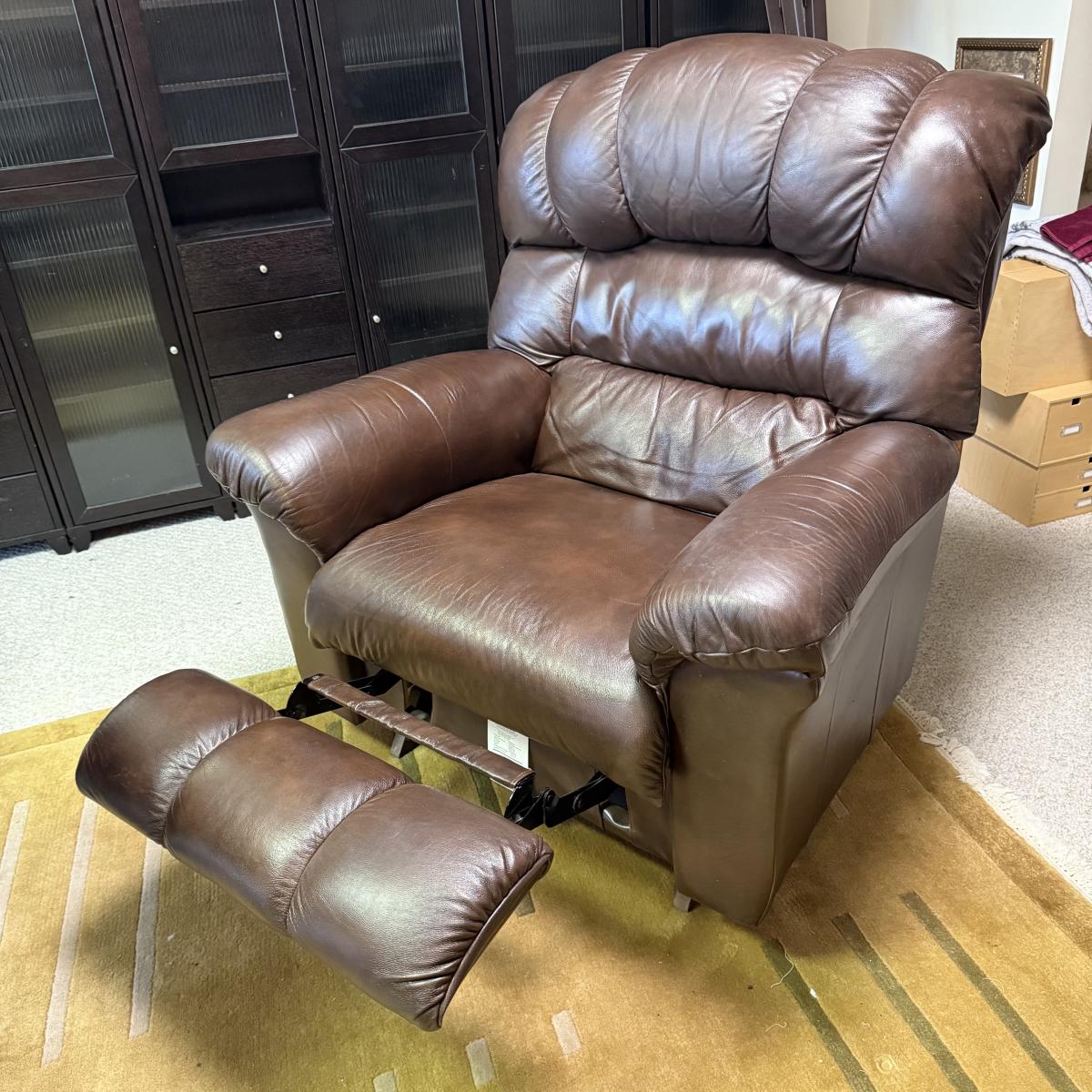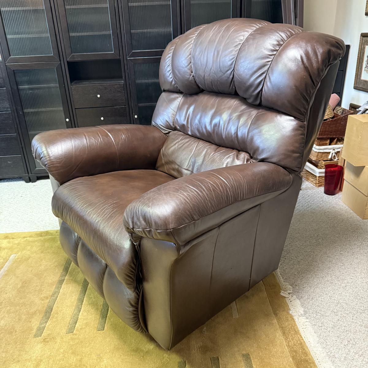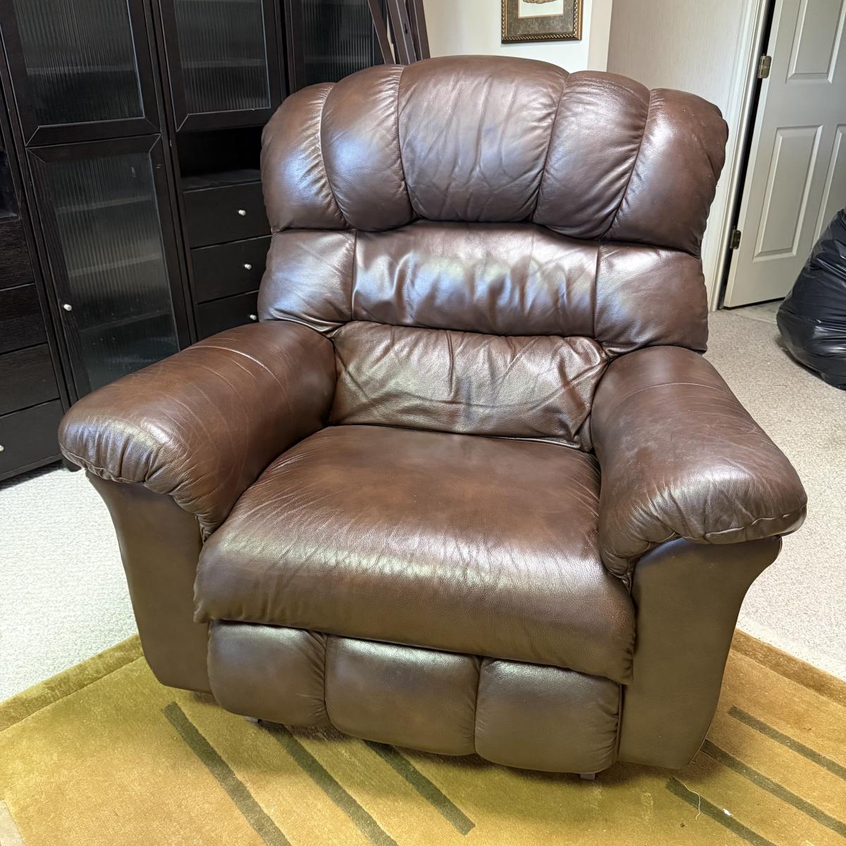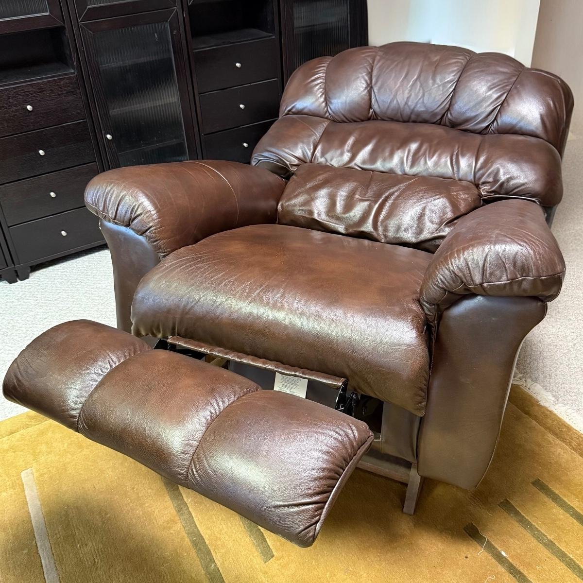 Oversized mahogany colored leather La-Z-Boy rocking recliner. Chair upright measures 45” x 35” x 43”H with a 19” seat height. The back, seat, armrests, and leg rests are ultra-padded and cozy. It reclines nearly horizontal. In fully reclined position the chair measures approximately 45” x 72” x 33”H. There is a small amount of white residue on the side by the lever that may be cleanable.