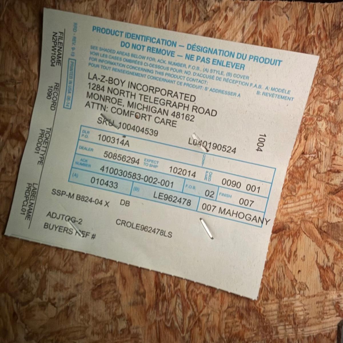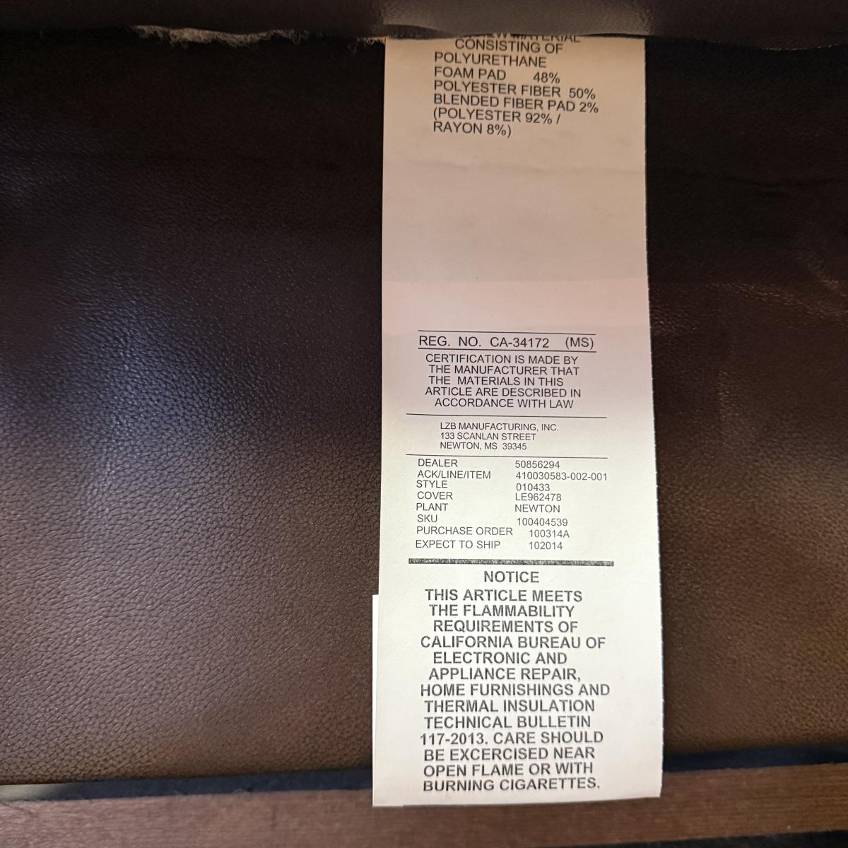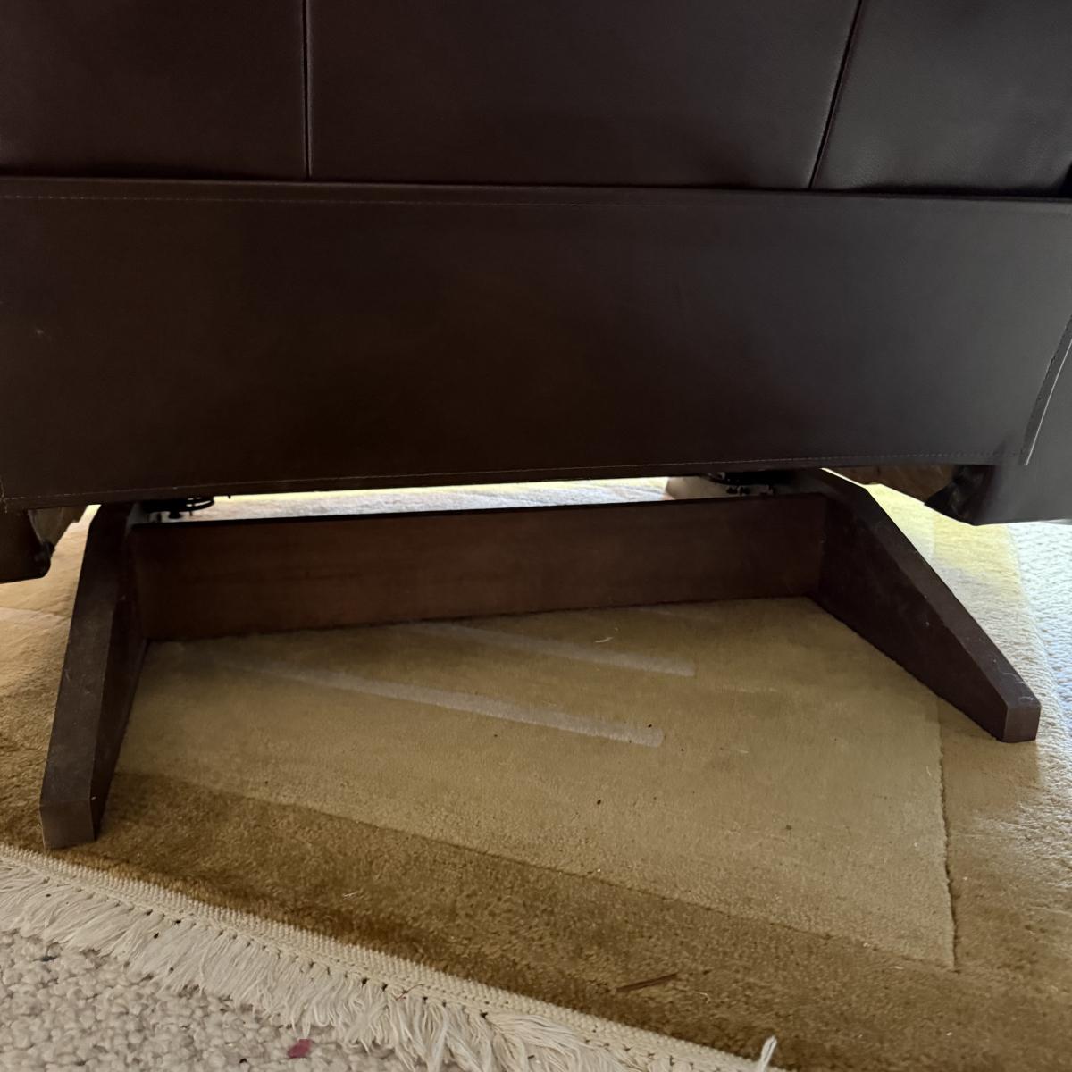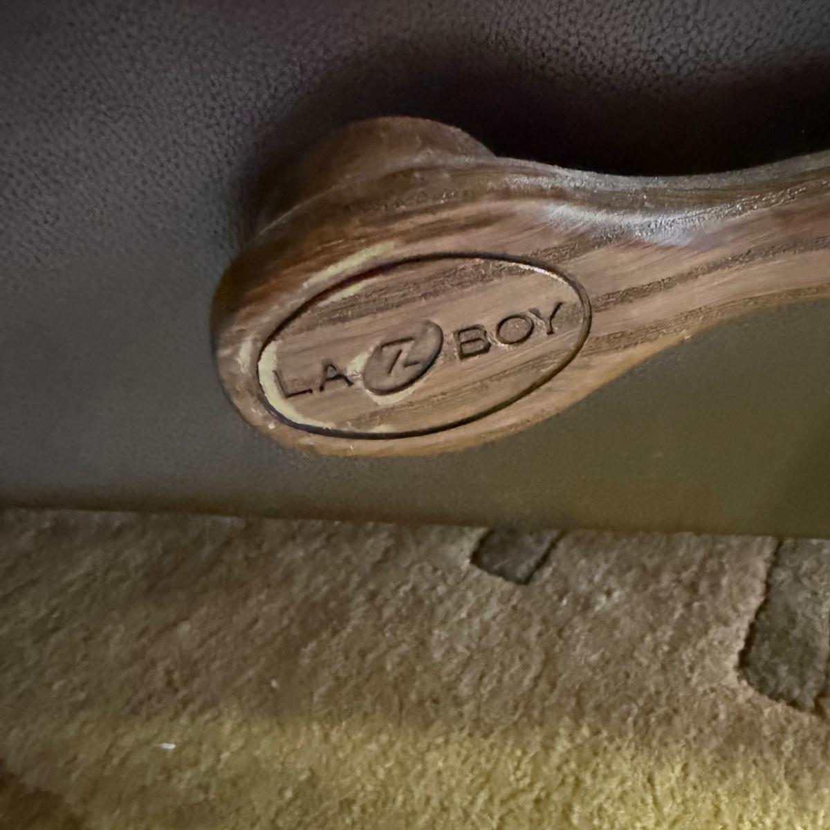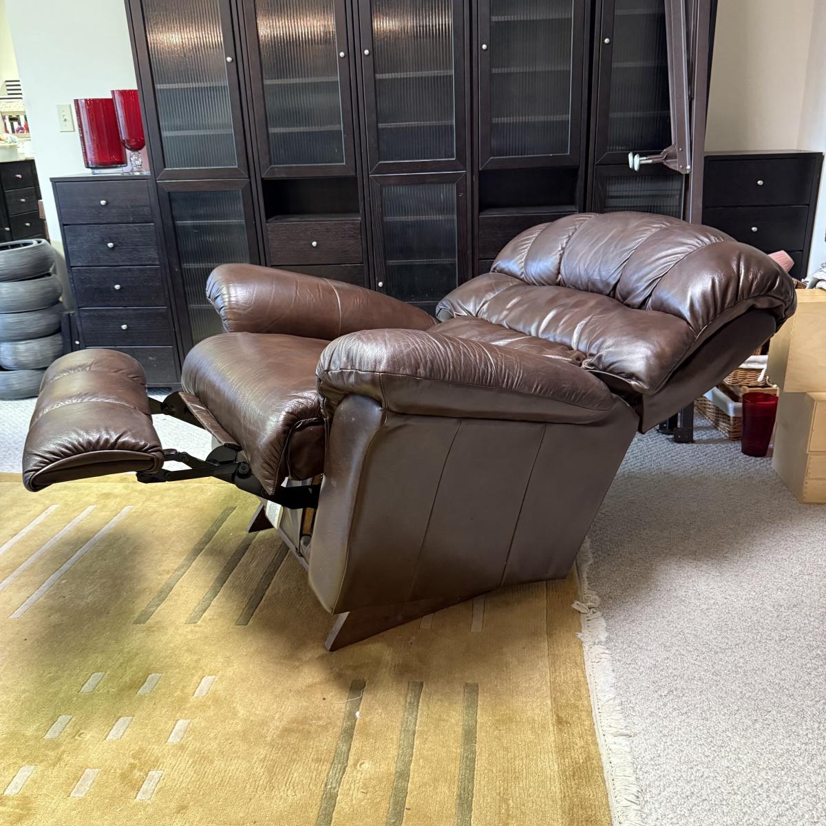 Oversized mahogany colored leather La-Z-Boy rocking recliner. Chair upright measures 45” x 35” x 43”H with a 19” seat height. The back, seat, armrests, and leg rests are ultra-padded and cozy. It reclines nearly horizontal. In fully reclined position the chair measures approximately 45” x 72” x 33”H. There is a small amount of white residue on the side by the lever that may be cleanable.