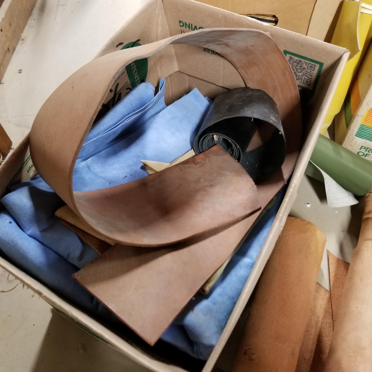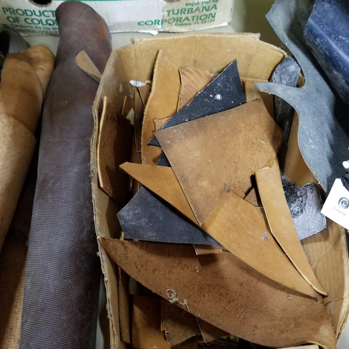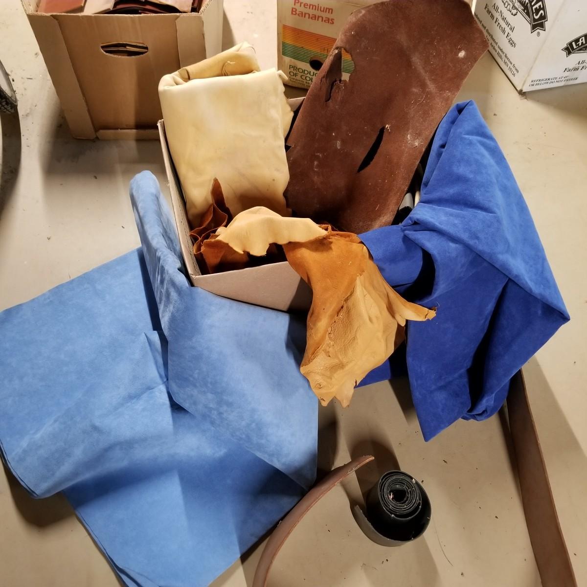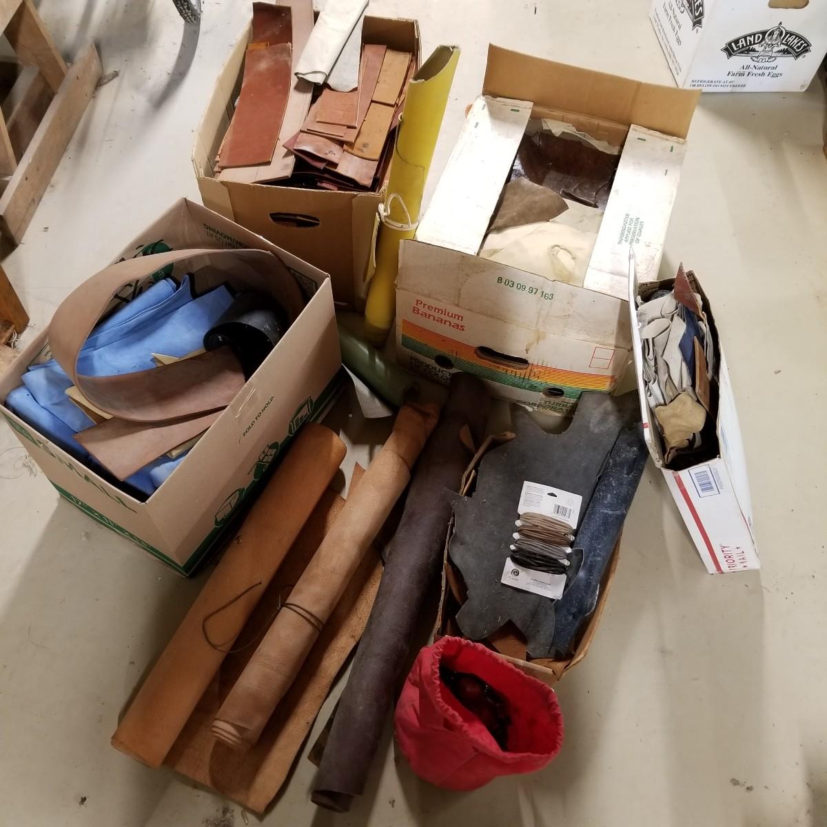 A crafters delight of leather.   Assorted pieces, rolls, scraps, strip.  Brown, black, tan, ochre, more.  Soft finish, suede, different shine finishes.  Thickness varies, most pieces 1/8" to 1/4".  Larger pieces thinner.  Includes bag of snaps and attachments for purses, etc.  Four boxes + several rolled pieces.  Boxes are very heavy, probably 50lb or more total. Local pickup only.