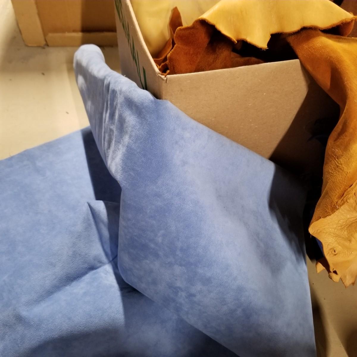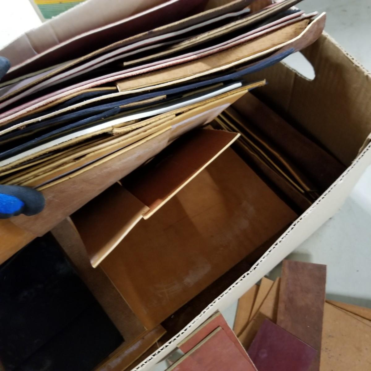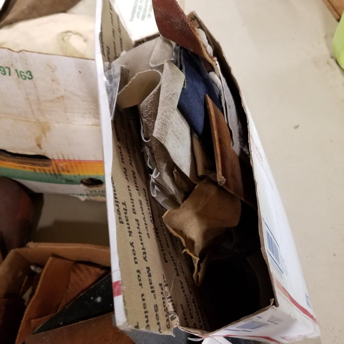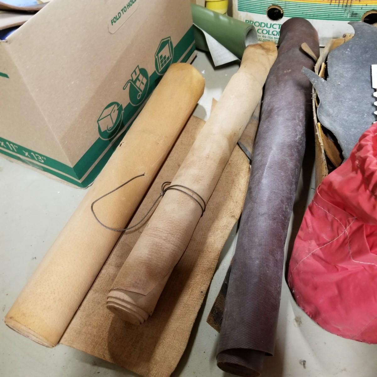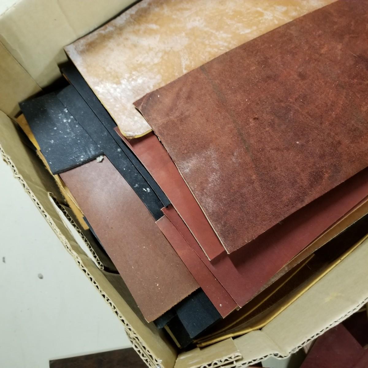 A crafters delight of leather.   Assorted pieces, rolls, scraps, strip.  Brown, black, tan, ochre, more.  Soft finish, suede, different shine finishes.  Thickness varies, most pieces 1/8" to 1/4".  Larger pieces thinner.  Includes bag of snaps and attachments for purses, etc.  Four boxes + several rolled pieces.  Boxes are very heavy, probably 50lb or more total. Local pickup only.
