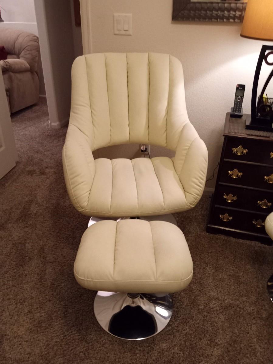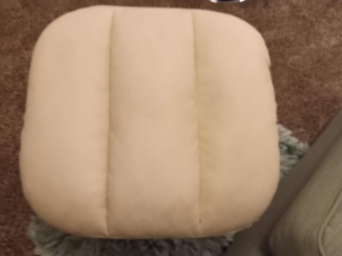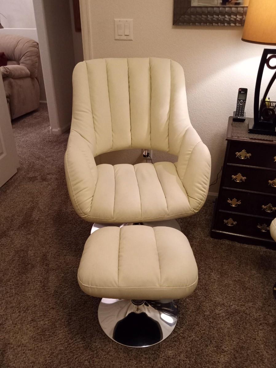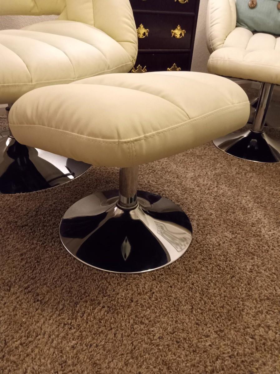 THE TAGS HAVE ALL BEEN REMOVED SO I CAN;T GUARANTEE THAT THIS IS REAL LEATHER BUT IT SURE LOOKS AND FEELS LIKE LEATHER, IT IS CREAM COLORED, THE OTTOMAN IS A LITTLE SOILED