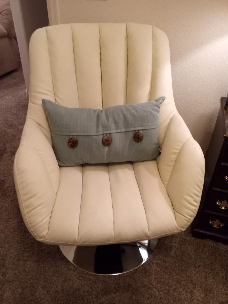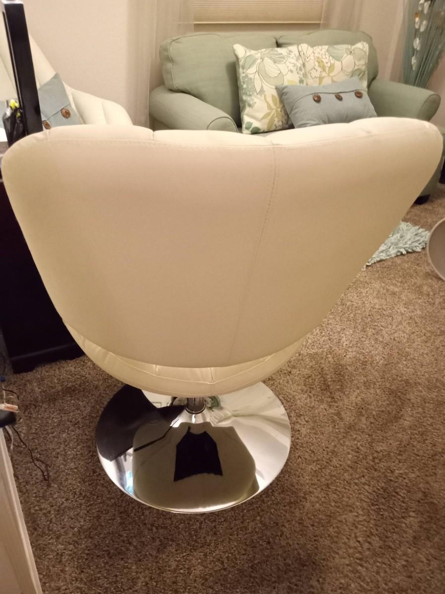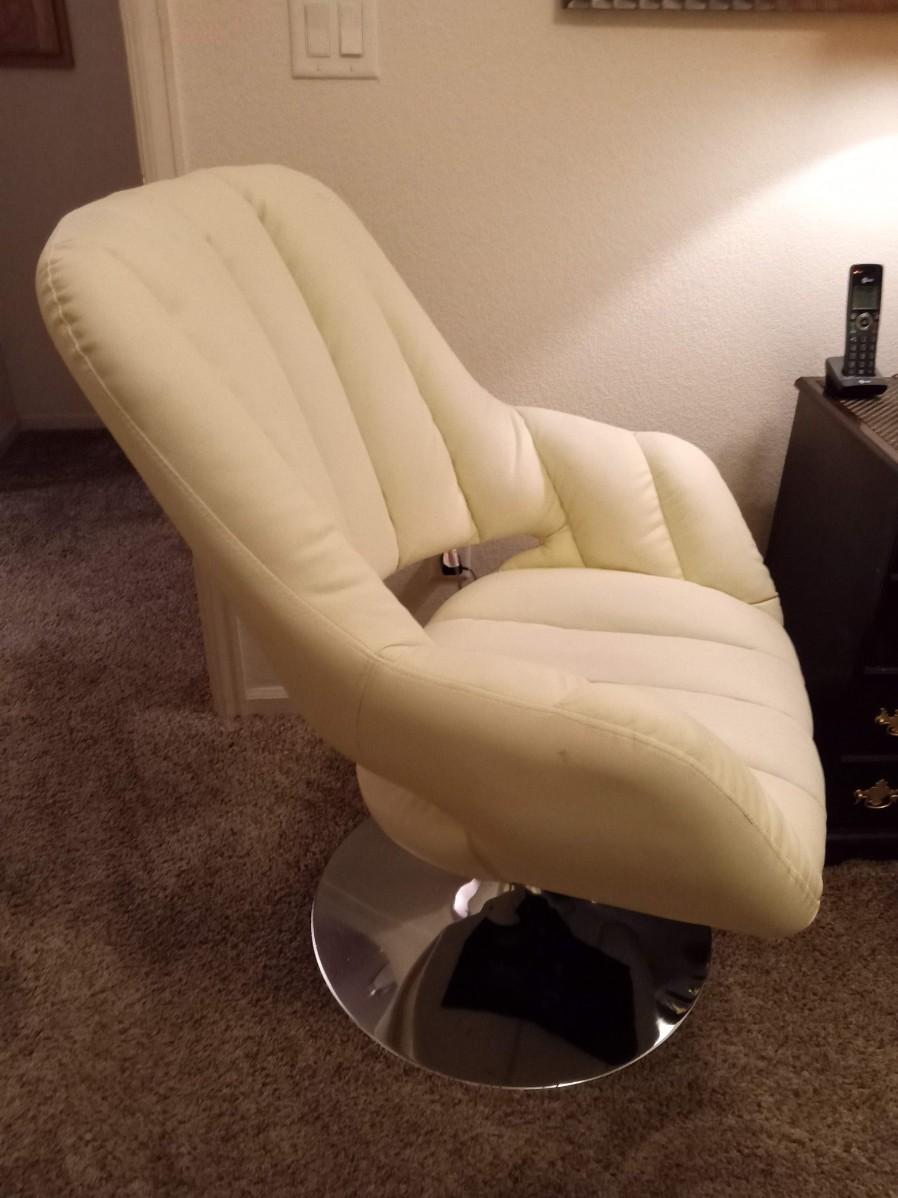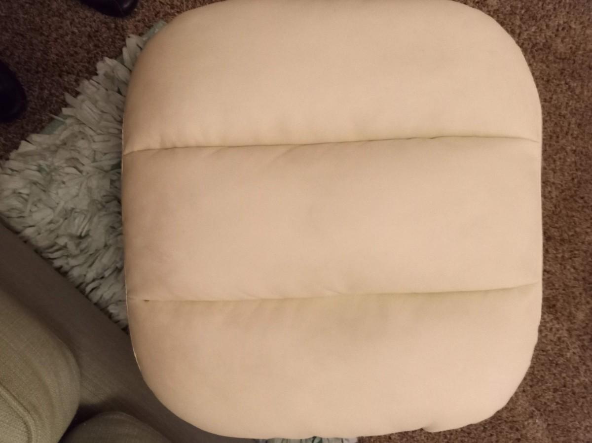 THE TAGS HAVE ALL BEEN REMOVED SO I CAN;T GUARANTEE THAT THIS IS REAL LEATHER BUT IT SURE LOOKS AND FEELS LIKE LEATHER, IT IS CREAM COLORED, THE OTTOMAN IS A LITTLE SOILED