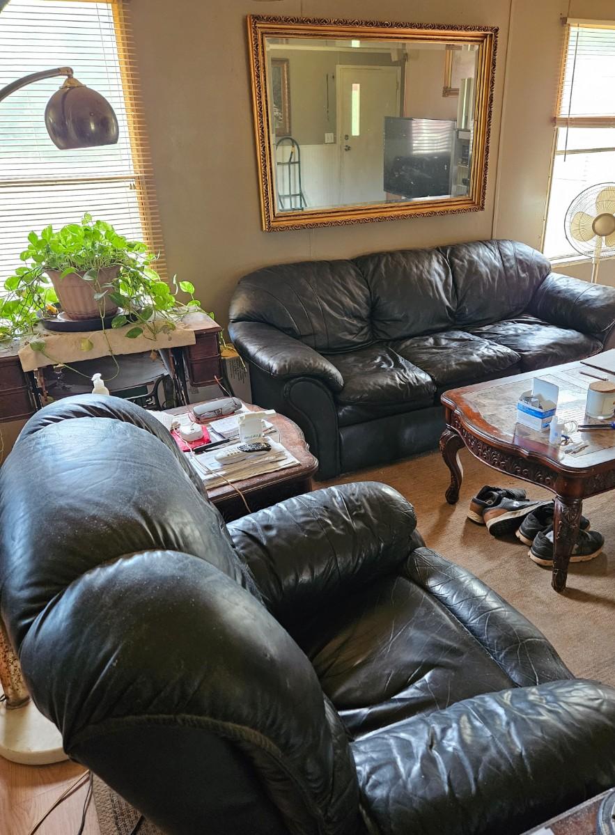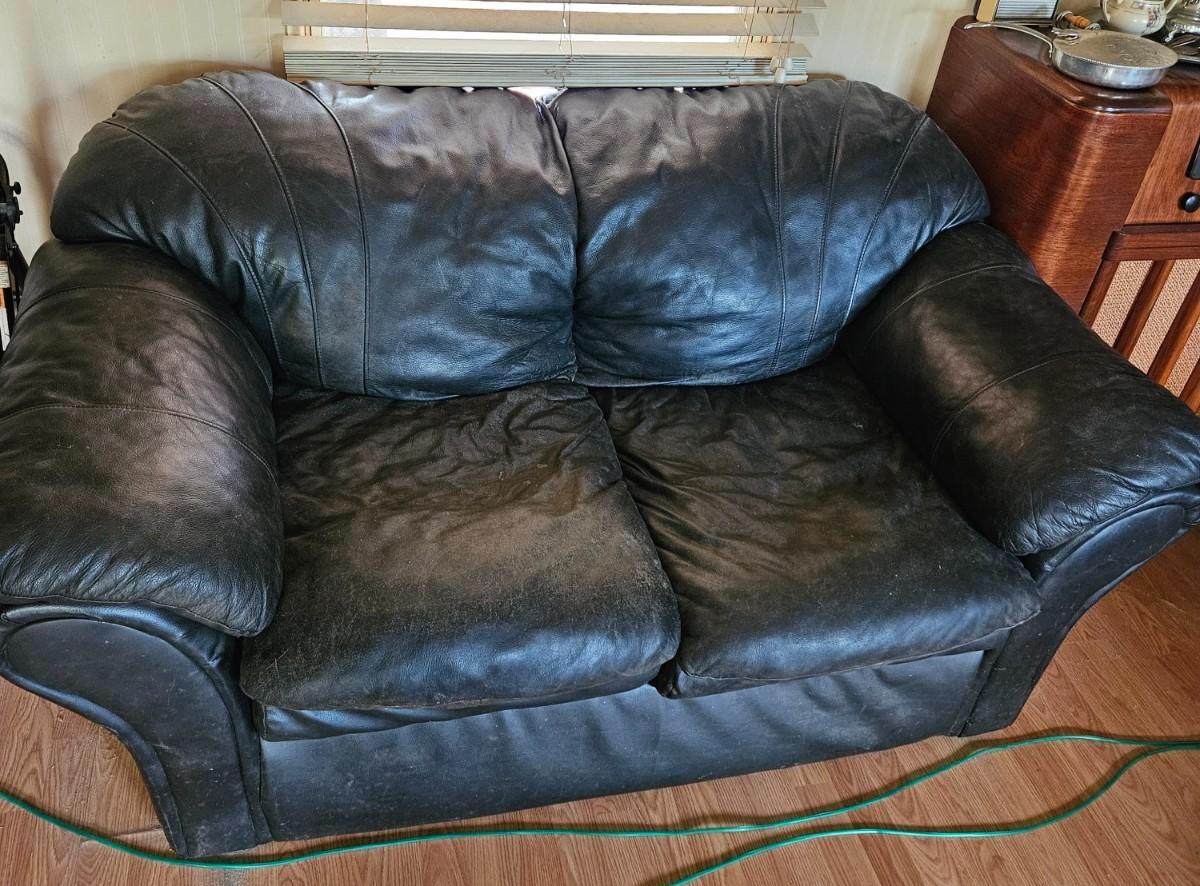 Black leather Sofa, loveseat and recliner. Nice, no tips, tears, or worn spots that I could see. Recliner was the only thing used daily.