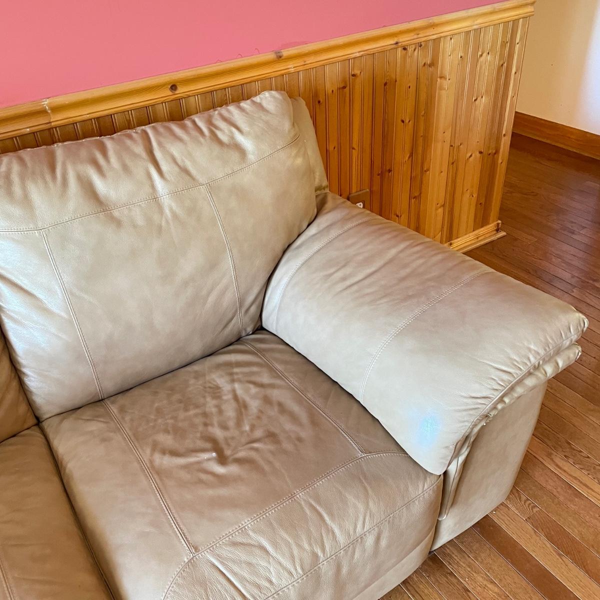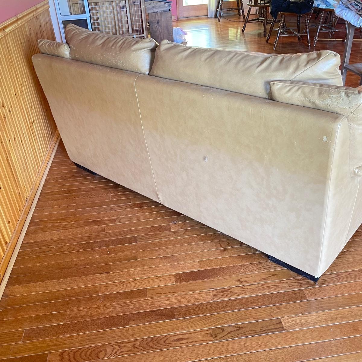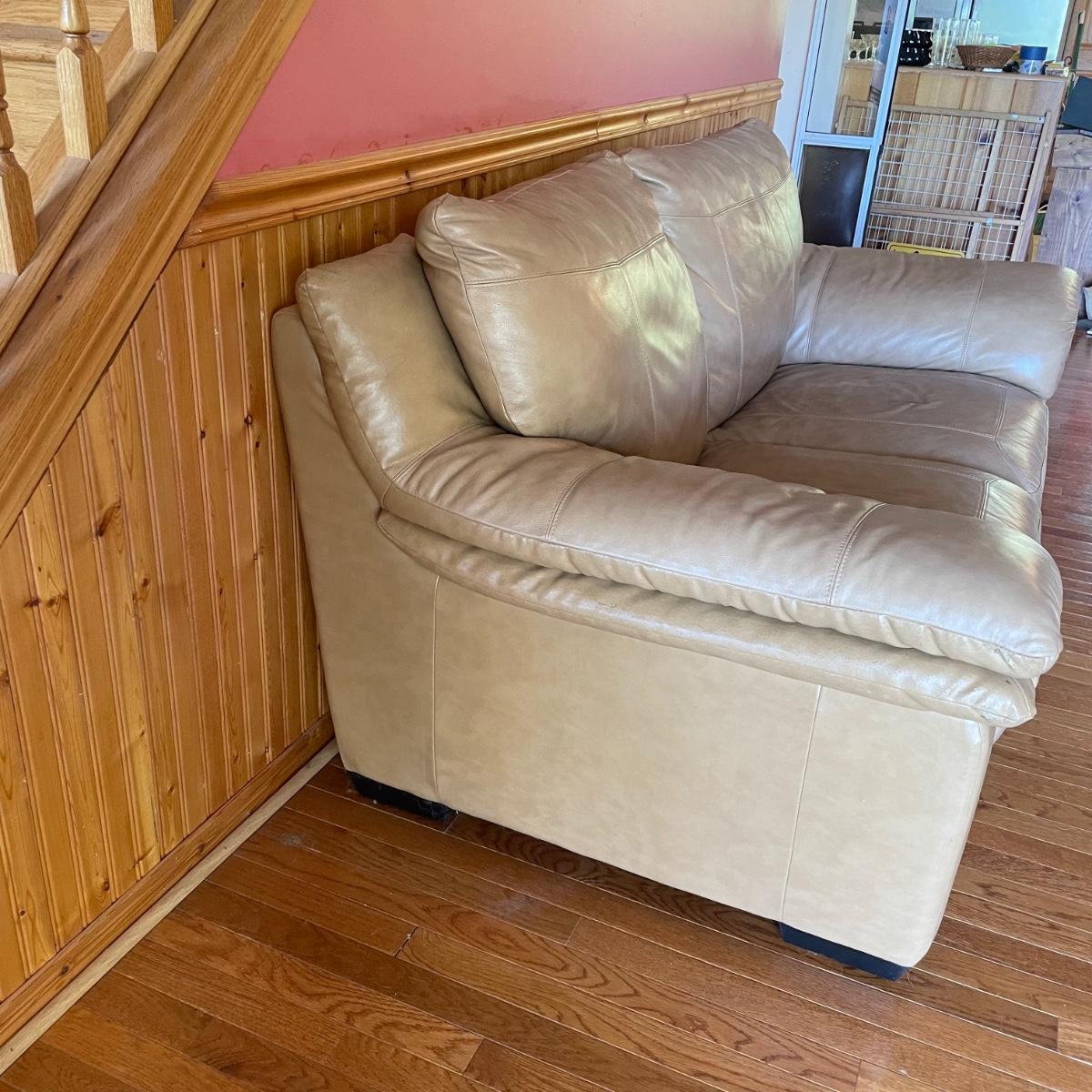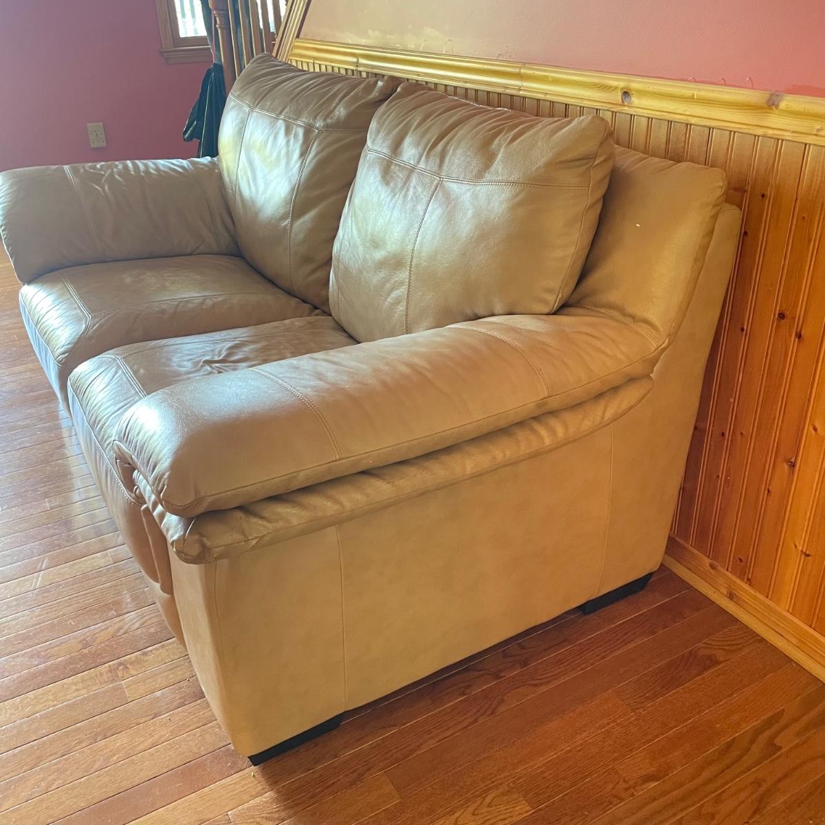 Tan faux leather loveseat with all cushions sewn together. The loveseat measures 67” x 37” x 32” with a seat height around 17.5”. Seat and back of sofa are in great condition. There is wear showing on the back top of the sofa and in the nooks of the arms. Couch has some animal hair present. See images. Local pick up only.