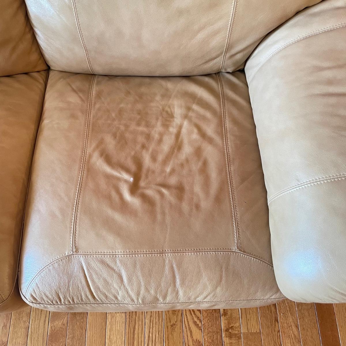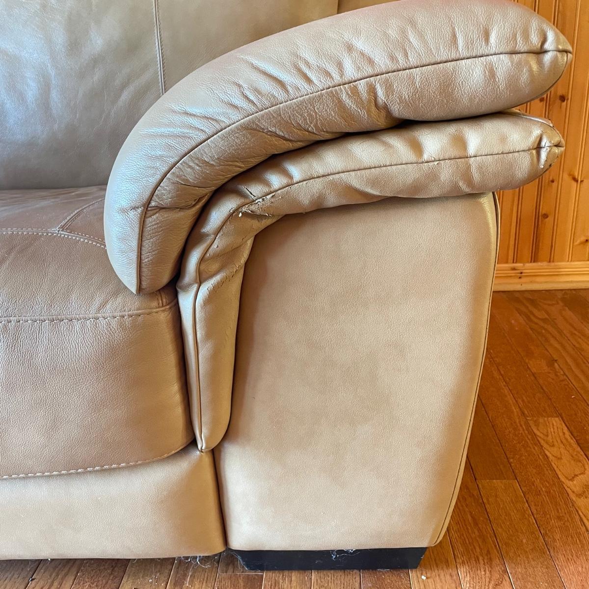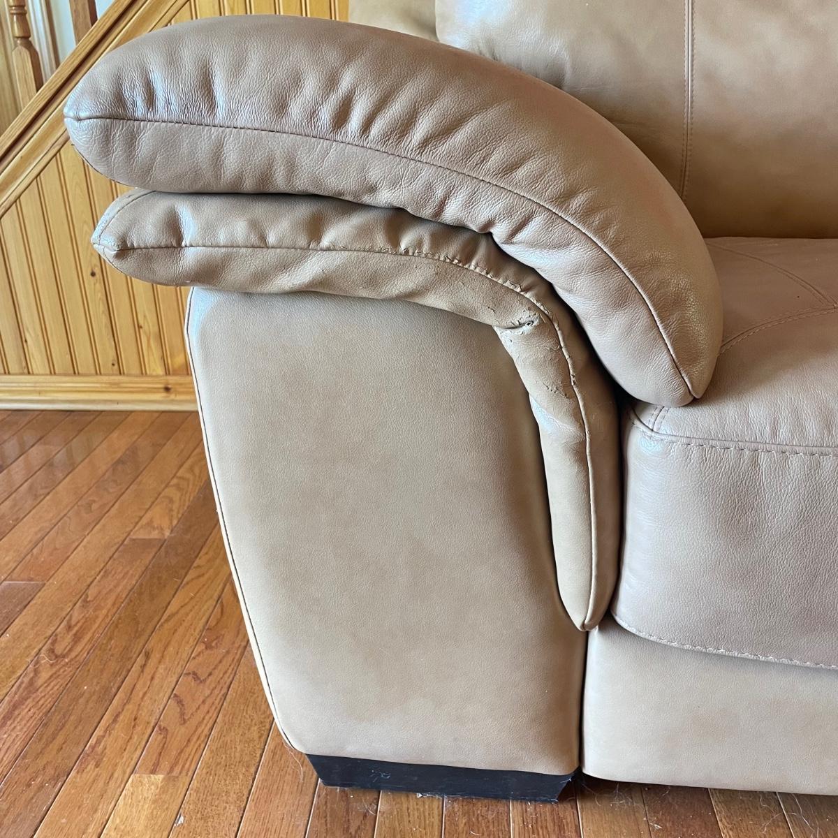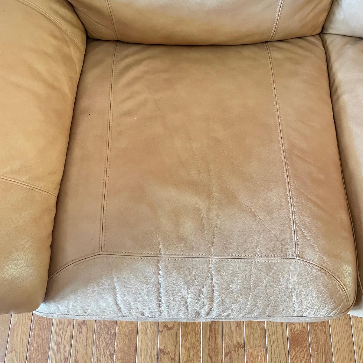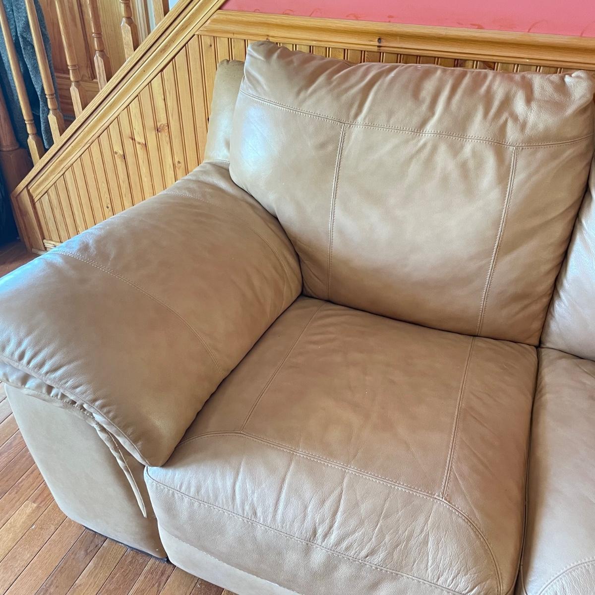 Tan faux leather loveseat with all cushions sewn together. The loveseat measures 67” x 37” x 32” with a seat height around 17.5”. Seat and back of sofa are in great condition. There is wear showing on the back top of the sofa and in the nooks of the arms. Couch has some animal hair present. See images. Local pick up only.