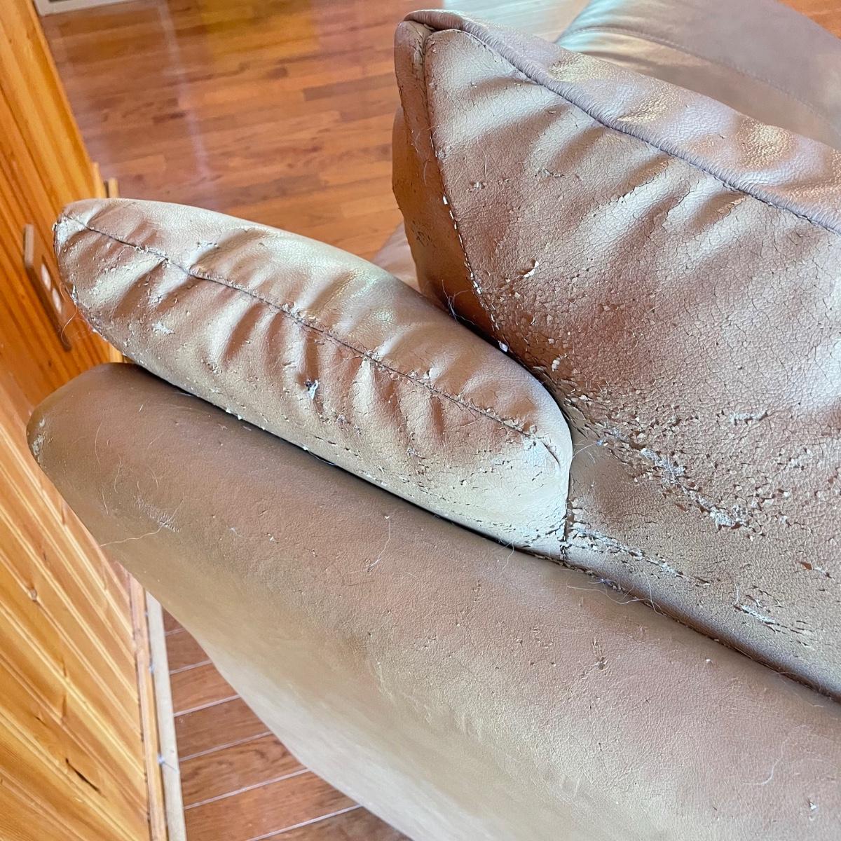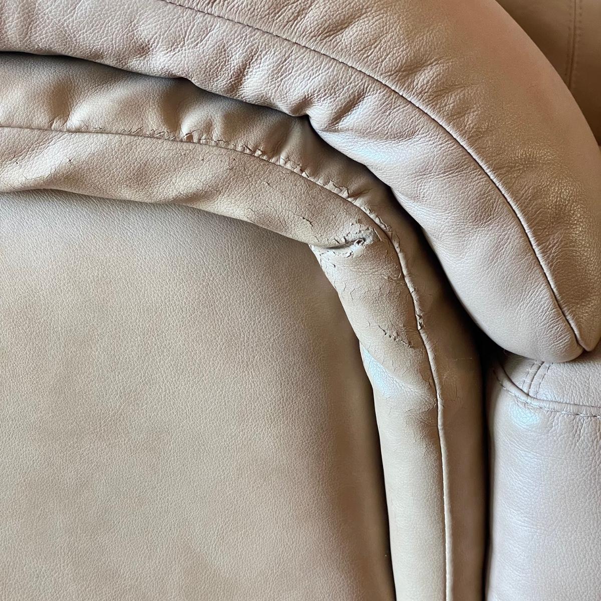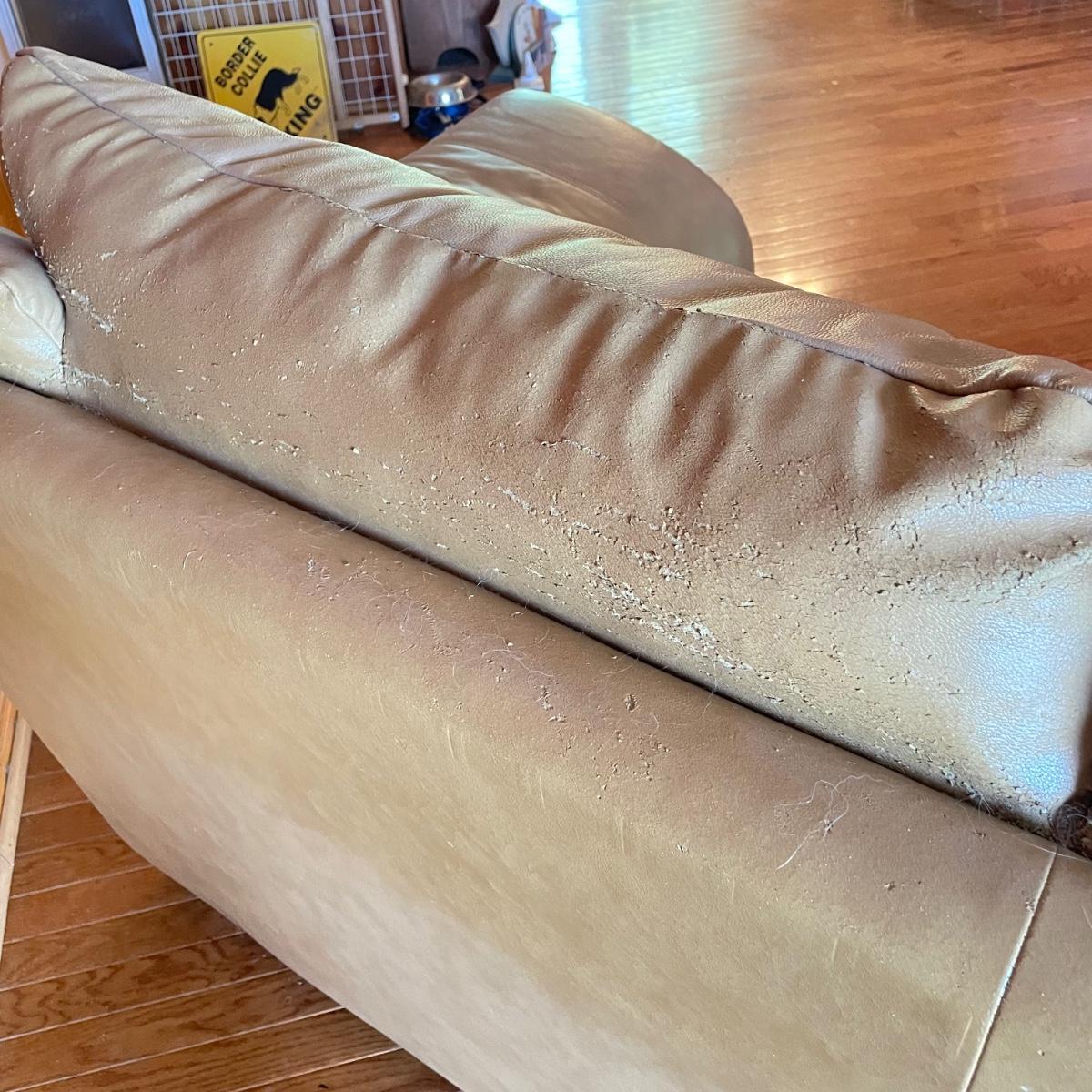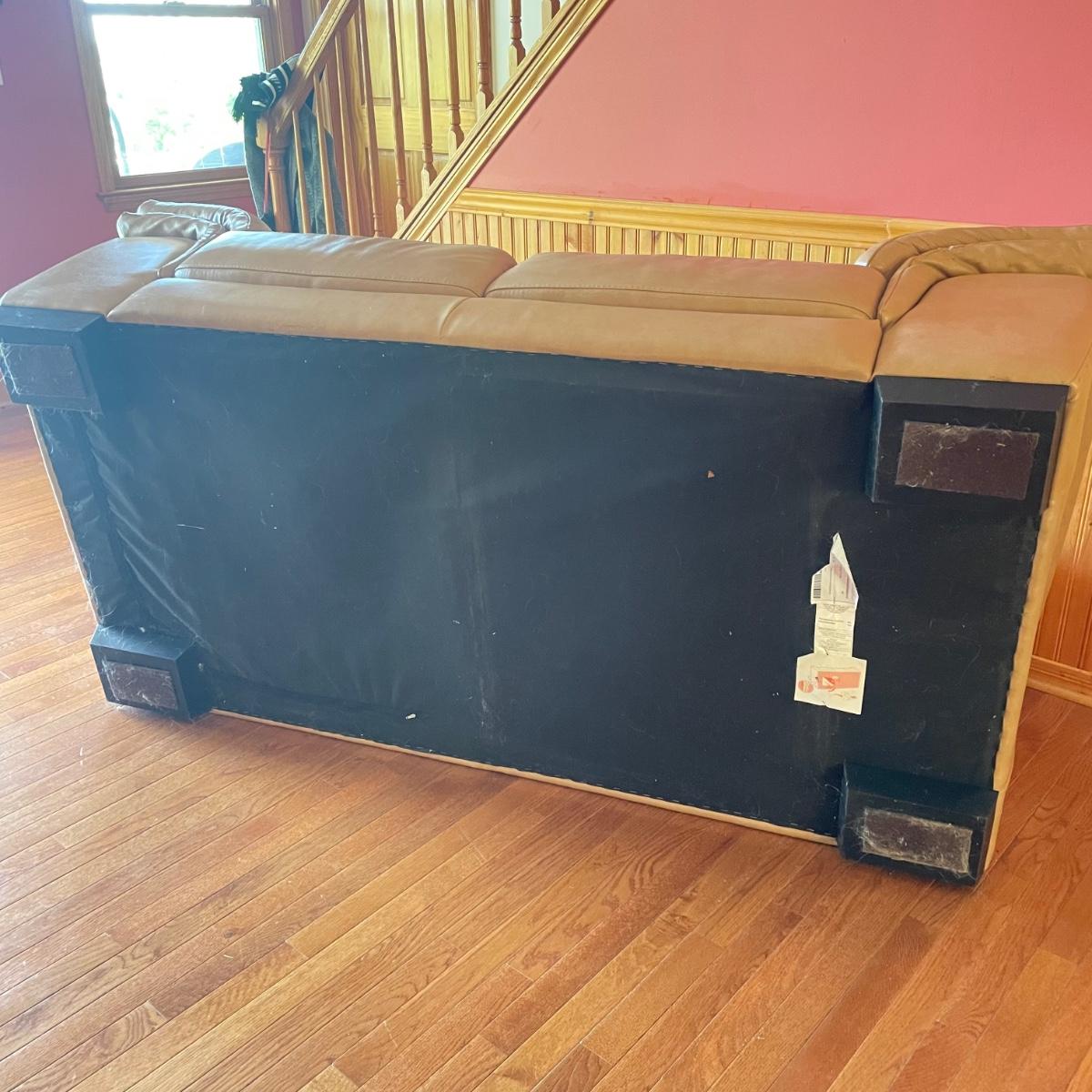 Tan faux leather loveseat with all cushions sewn together. The loveseat measures 67” x 37” x 32” with a seat height around 17.5”. Seat and back of sofa are in great condition. There is wear showing on the back top of the sofa and in the nooks of the arms. Couch has some animal hair present. See images. Local pick up only.