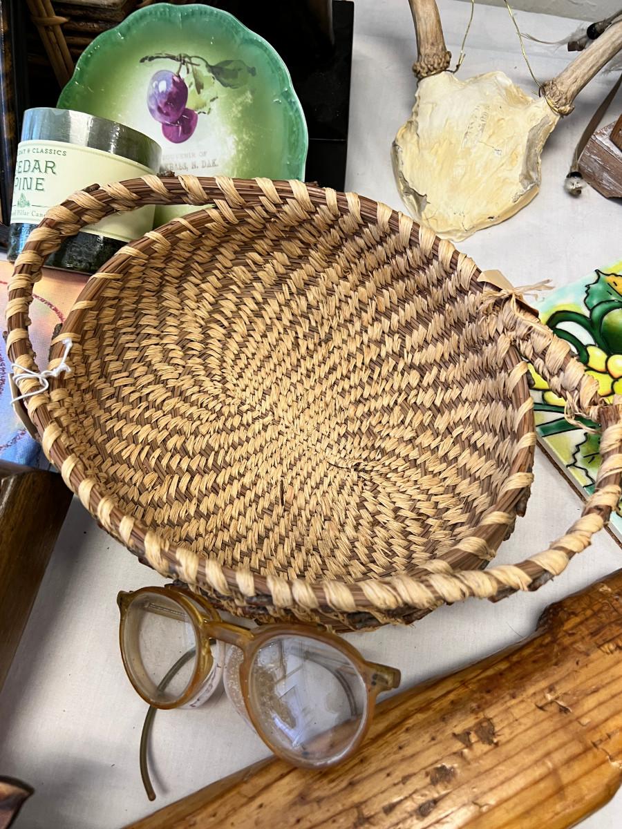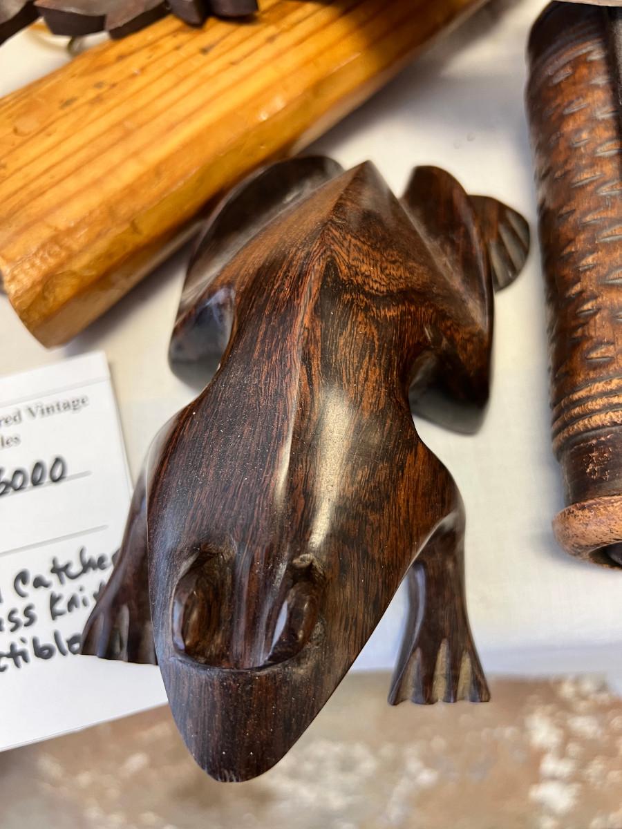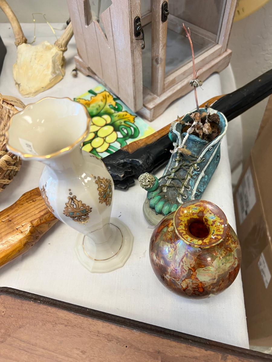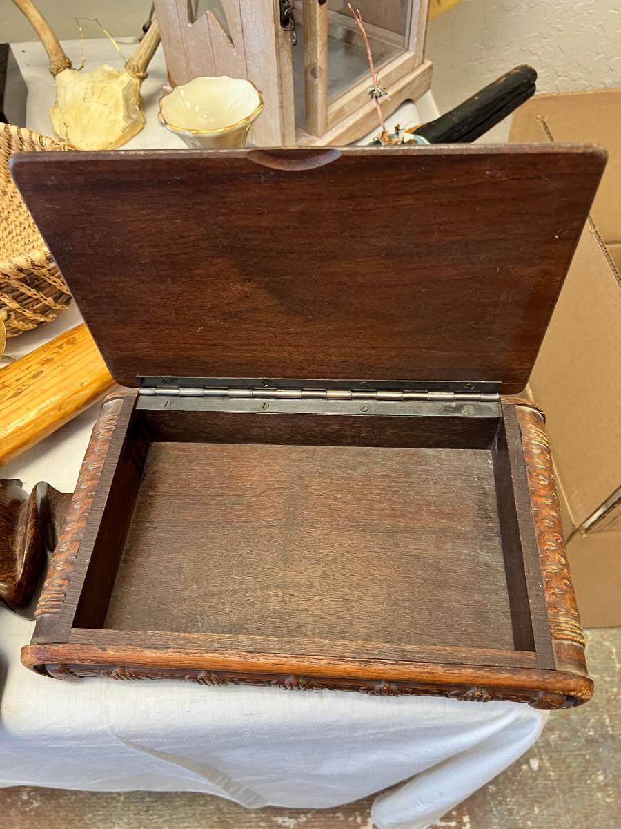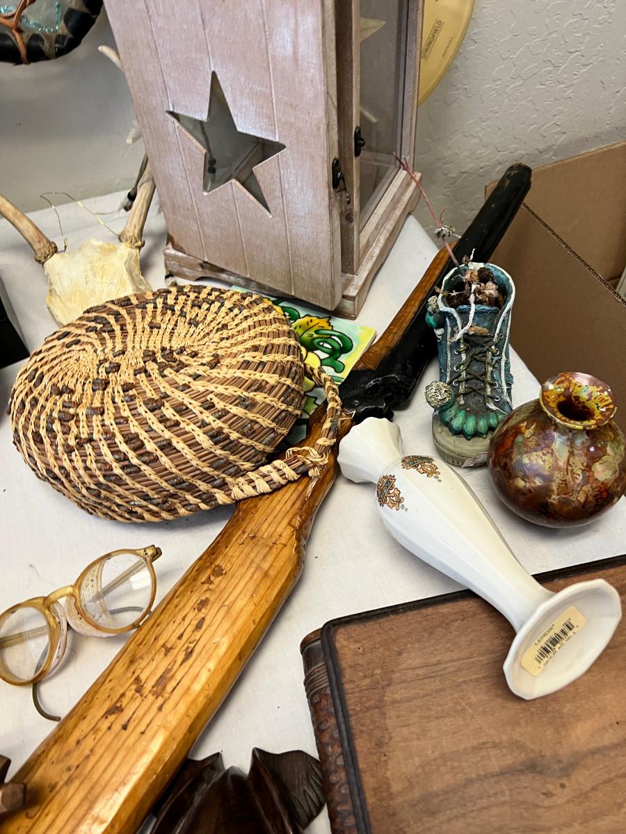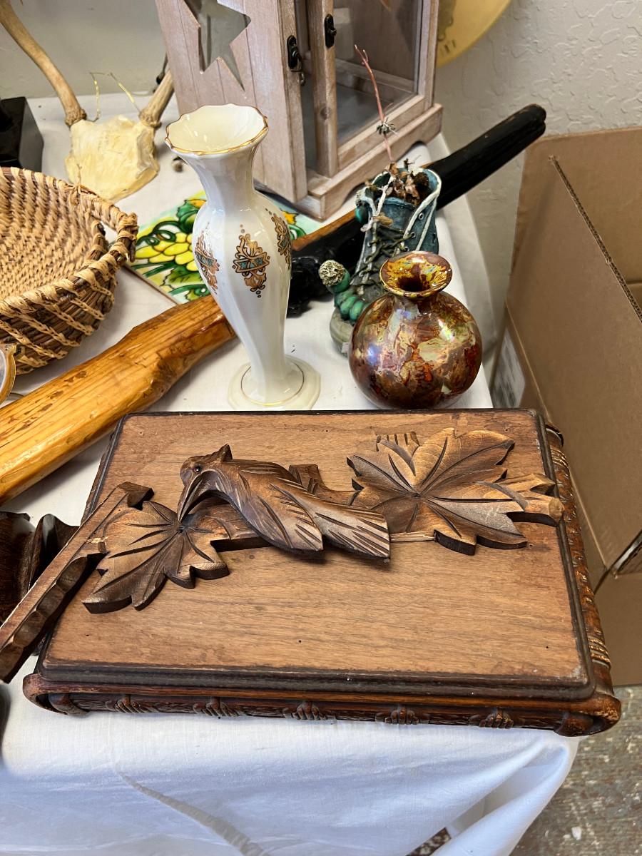 Wooden opening star box with metal roof and glass sides. Inlaid Greek plate, Lenox vase, unusual wooden cigar box , vintage reed box , carved wooden toy rifle, Raffia pine needle basket, carved ironwood ( heavy) frog.
