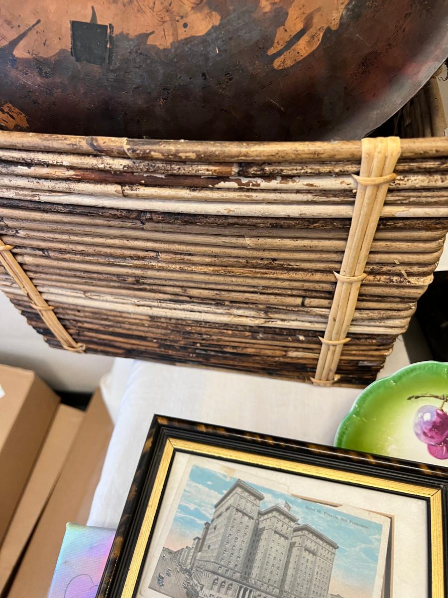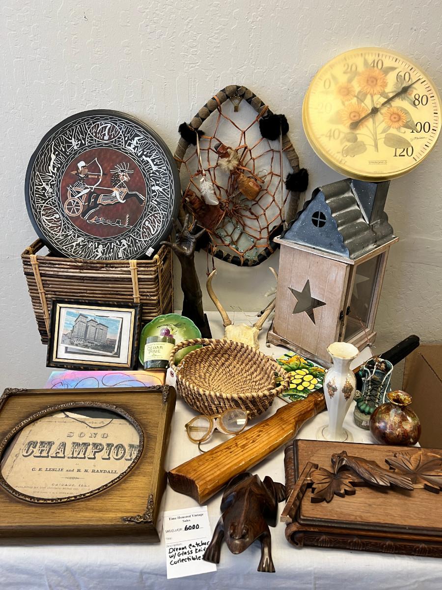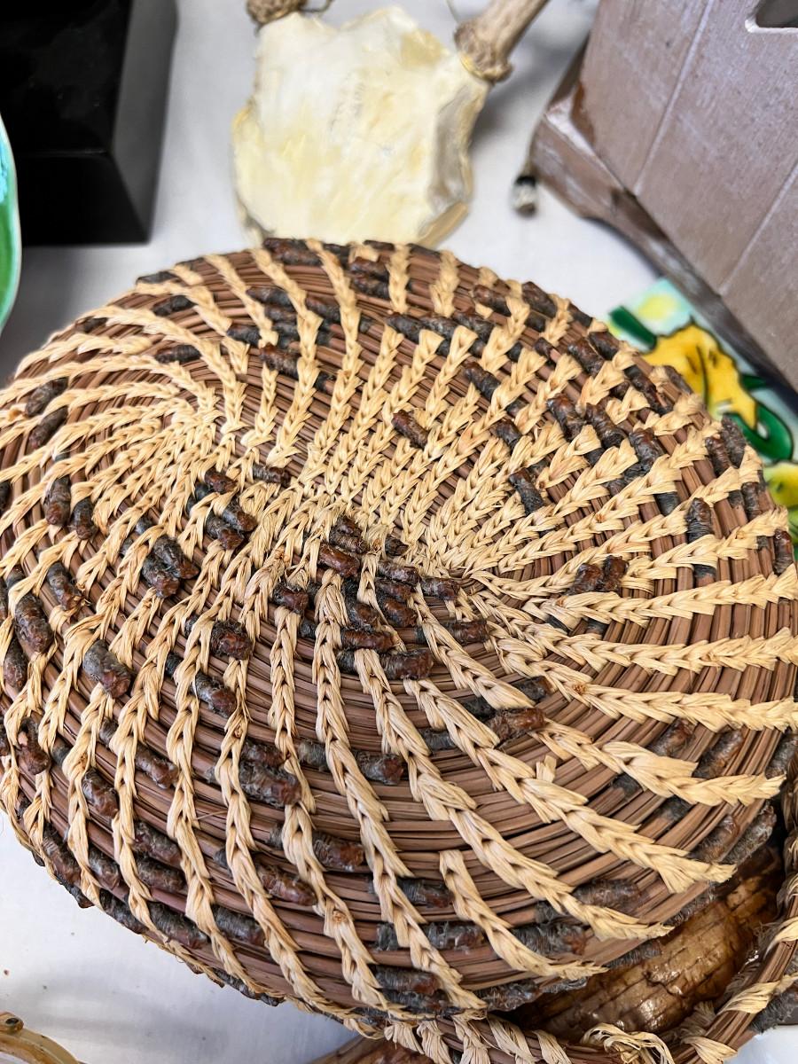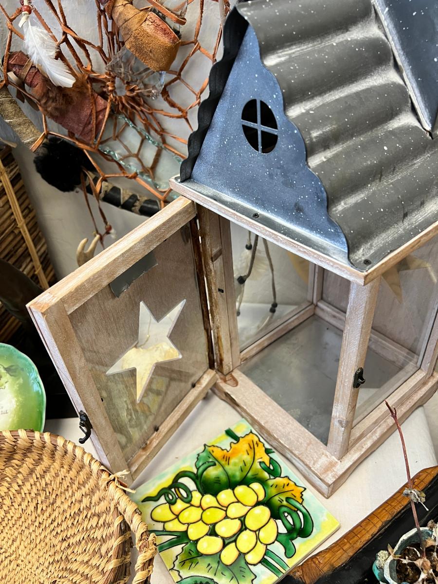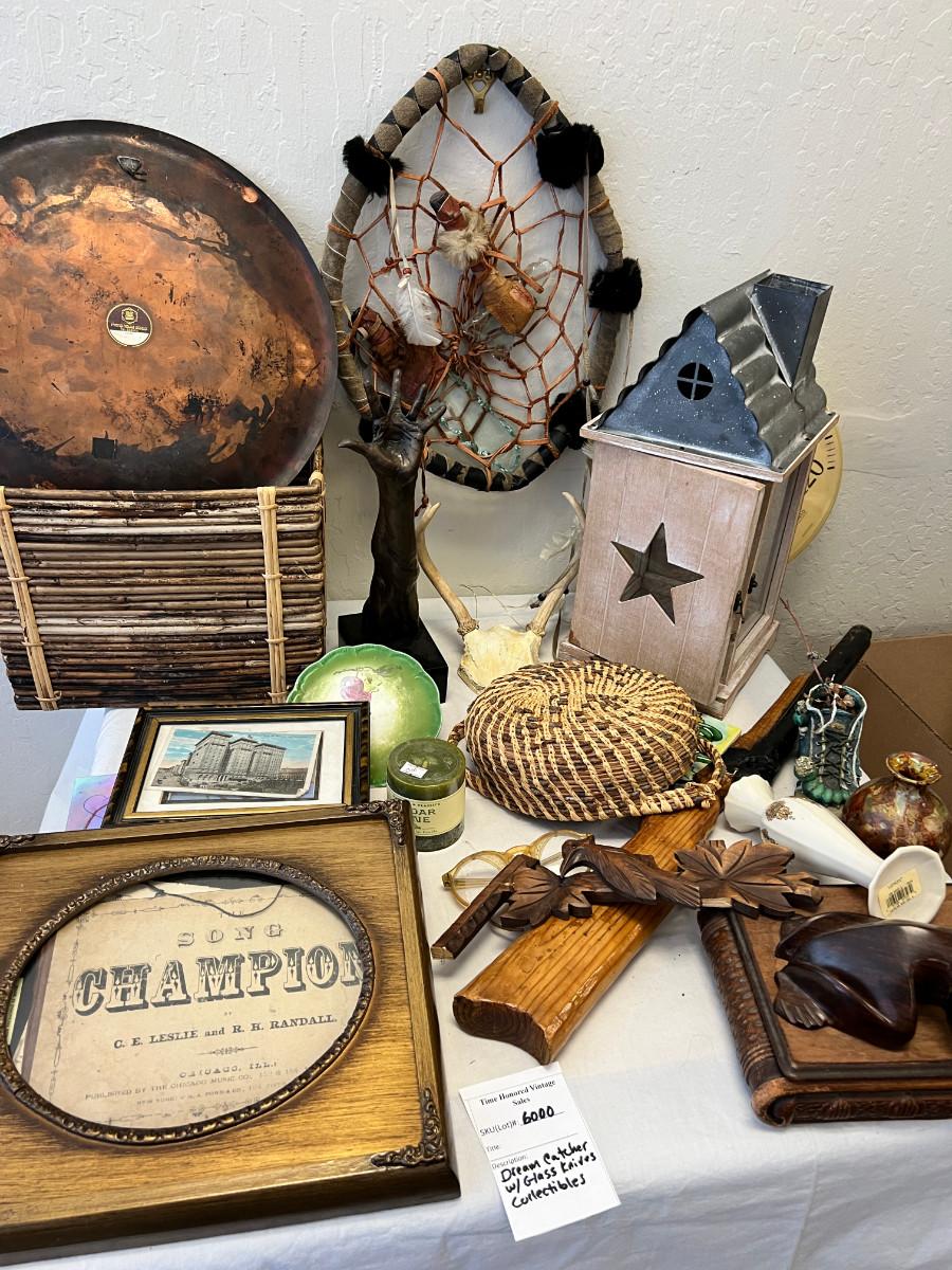 Wooden opening star box with metal roof and glass sides. Inlaid Greek plate, Lenox vase, unusual wooden cigar box , vintage reed box , carved wooden toy rifle, Raffia pine needle basket, carved ironwood ( heavy) frog.
