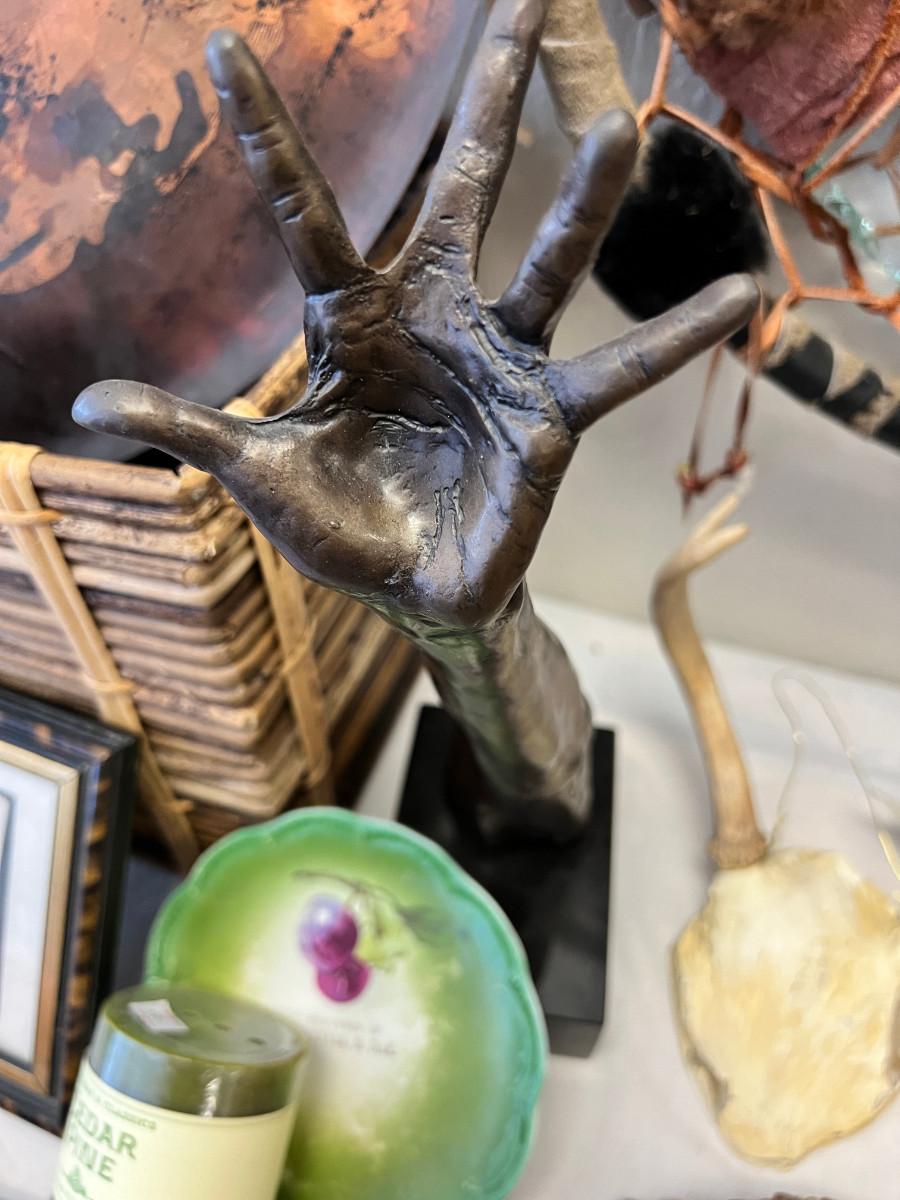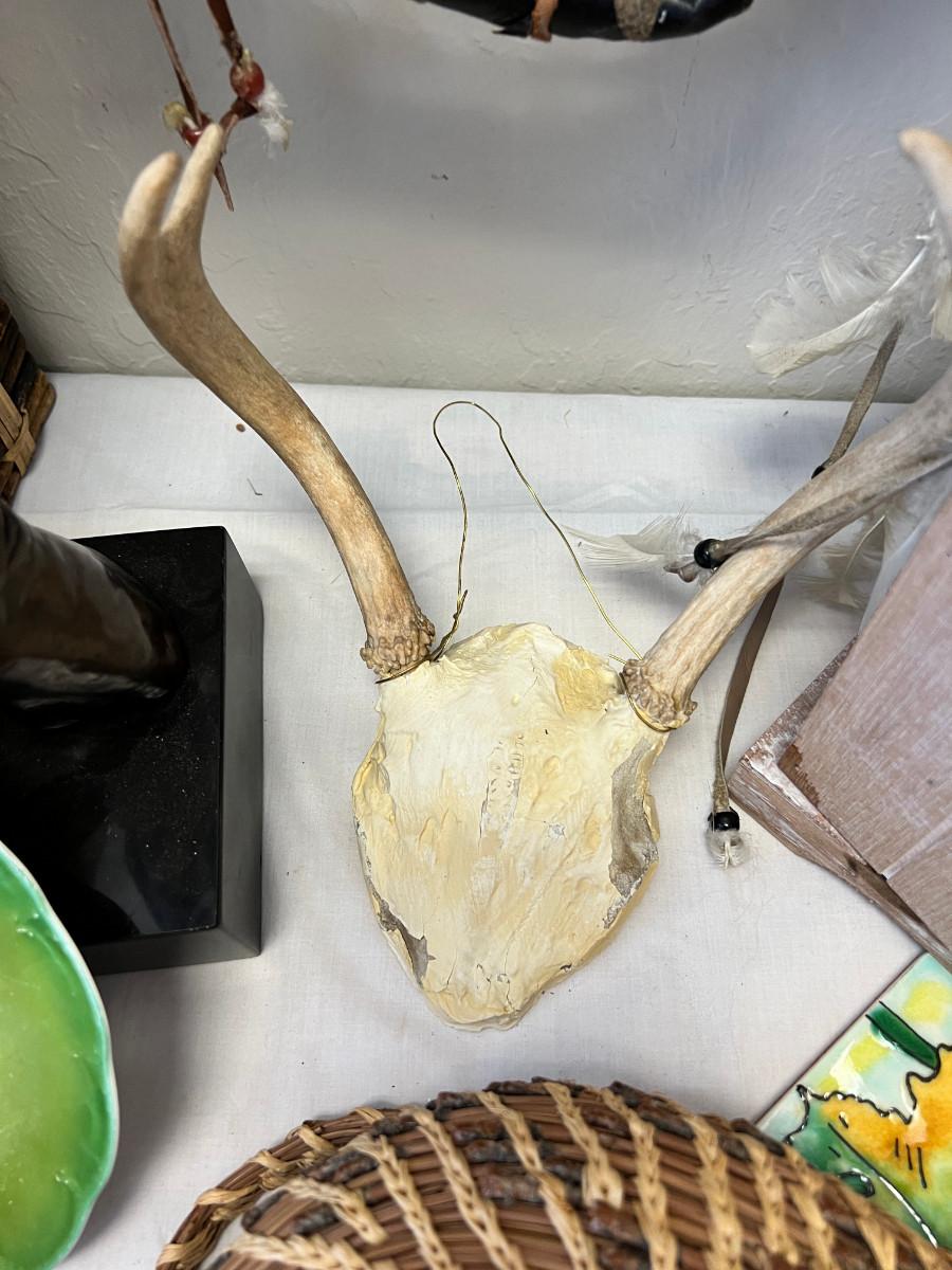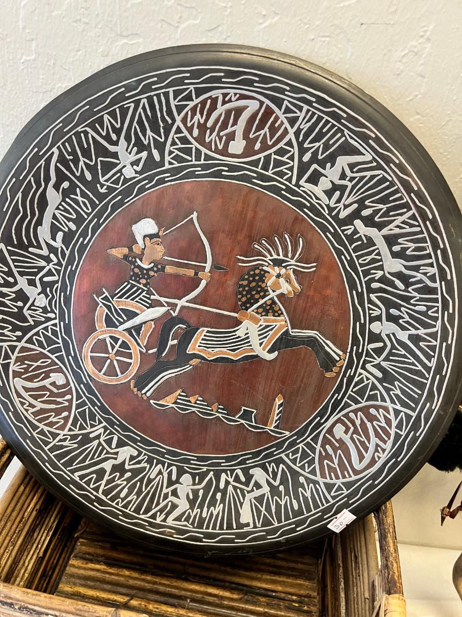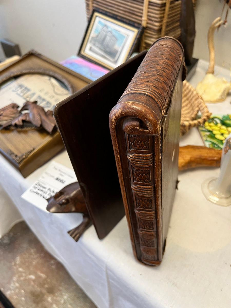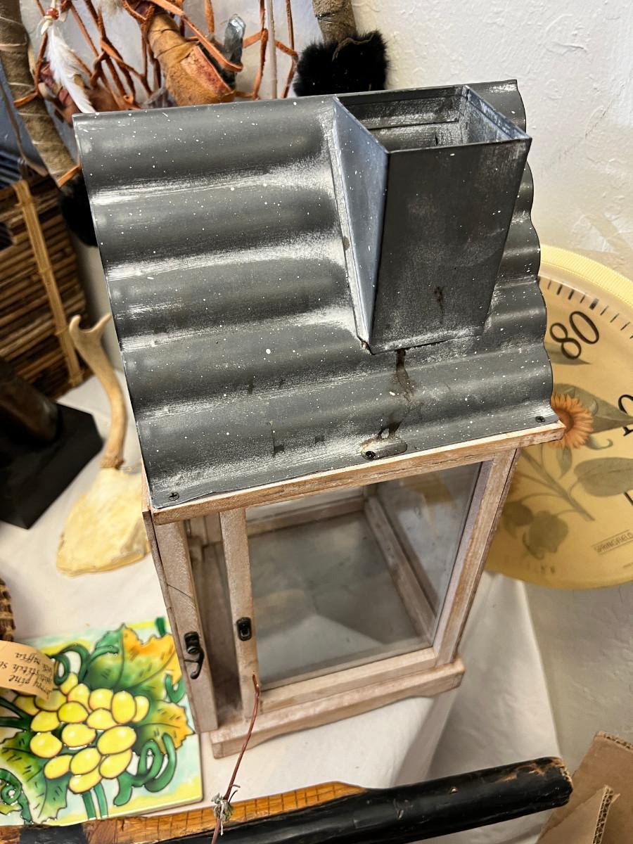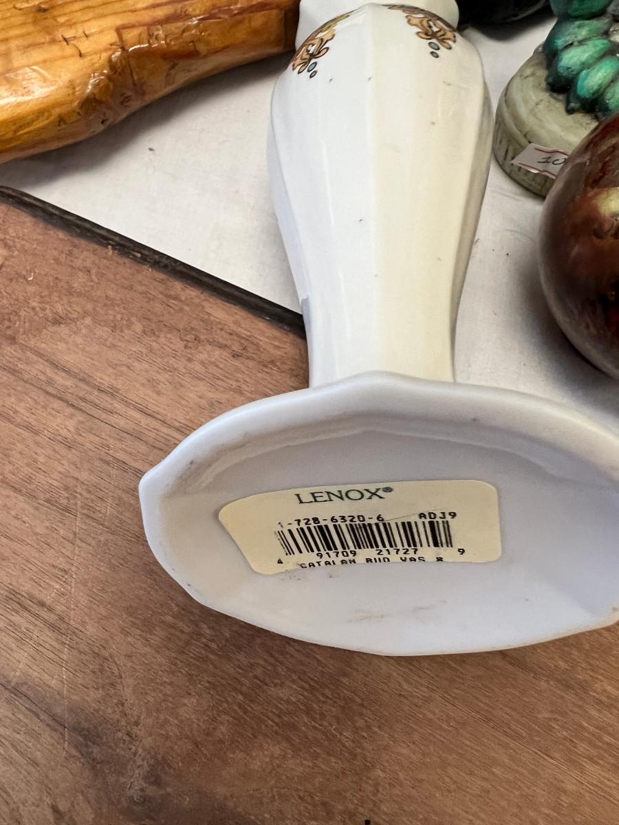 Wooden opening star box with metal roof and glass sides. Inlaid Greek plate, Lenox vase, unusual wooden cigar box , vintage reed box , carved wooden toy rifle, Raffia pine needle basket, carved ironwood ( heavy) frog.
