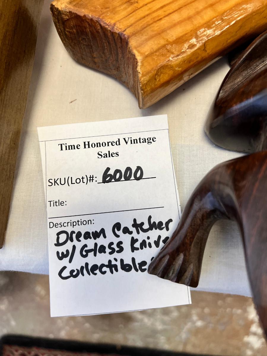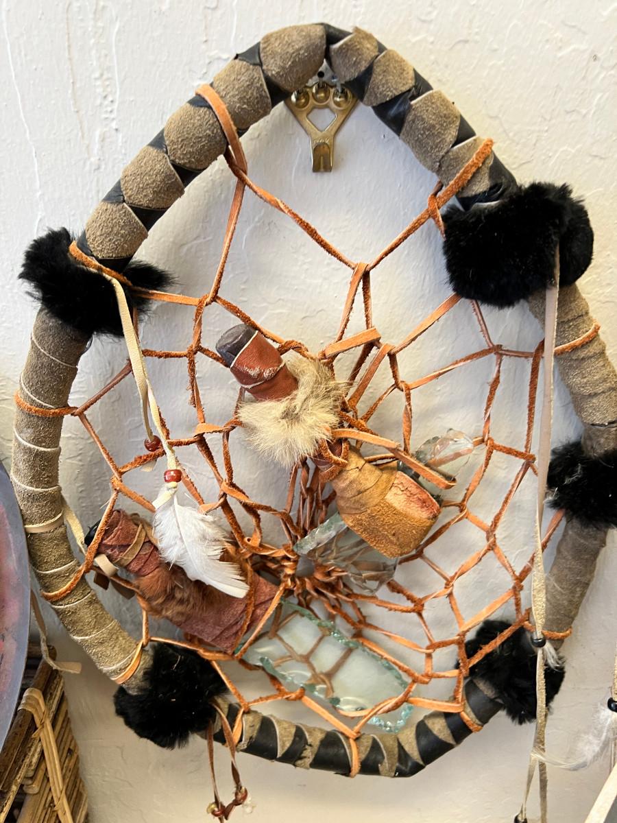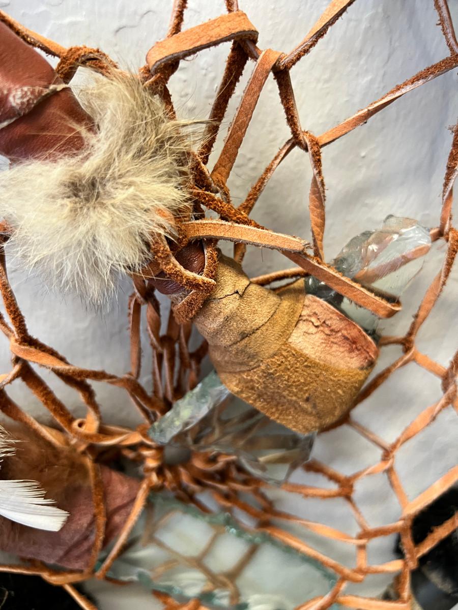 Leather wrapped Dreamcatcher with carved glass, Basket, inlay plate