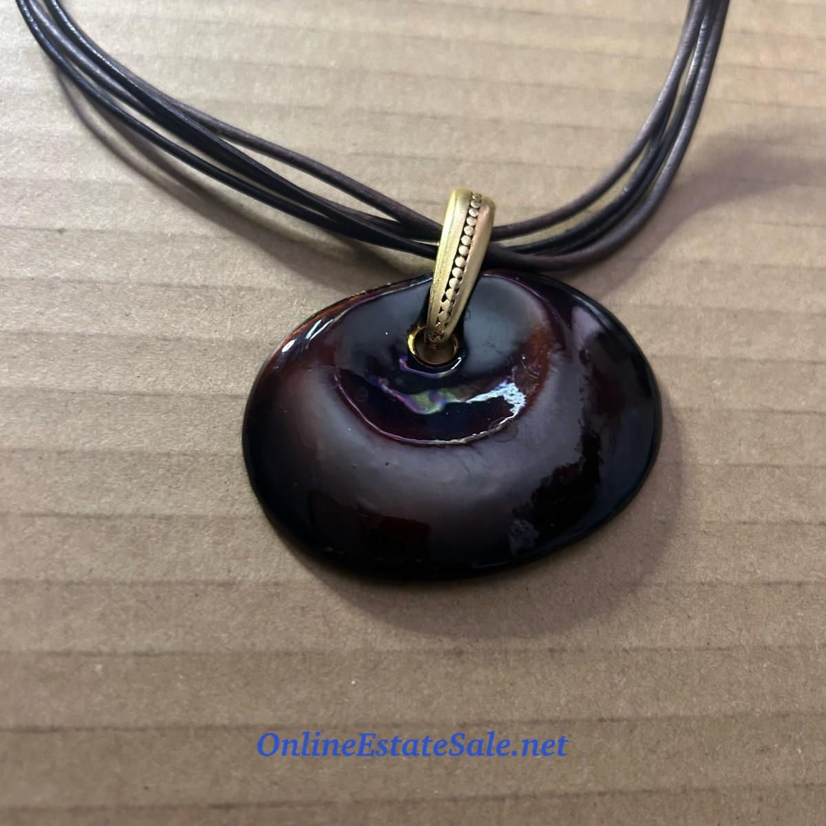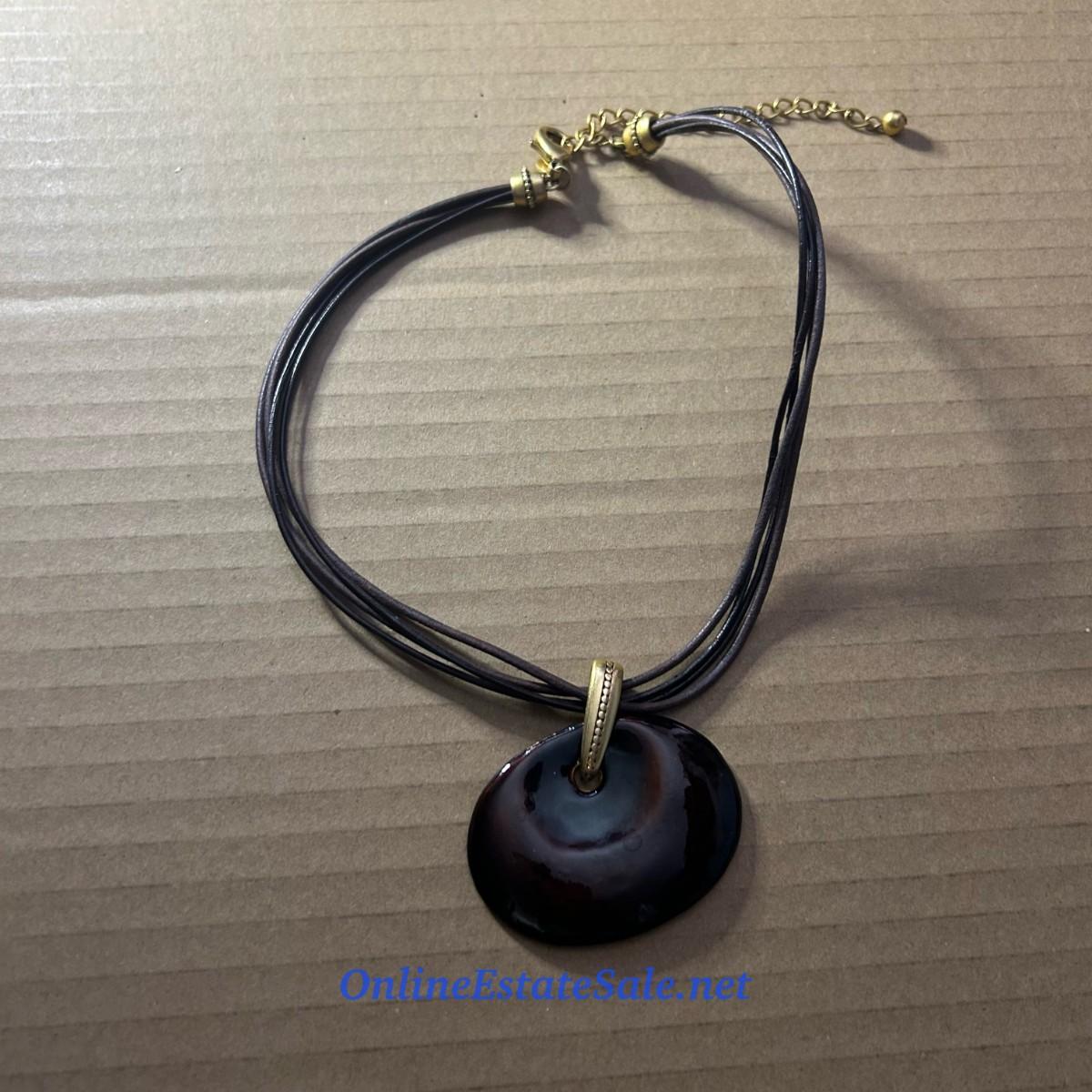 16in Brown Leather Tri-Strand Necklace with Brown Stone and Gold Colored Pendant with Lobster Claw Clasp