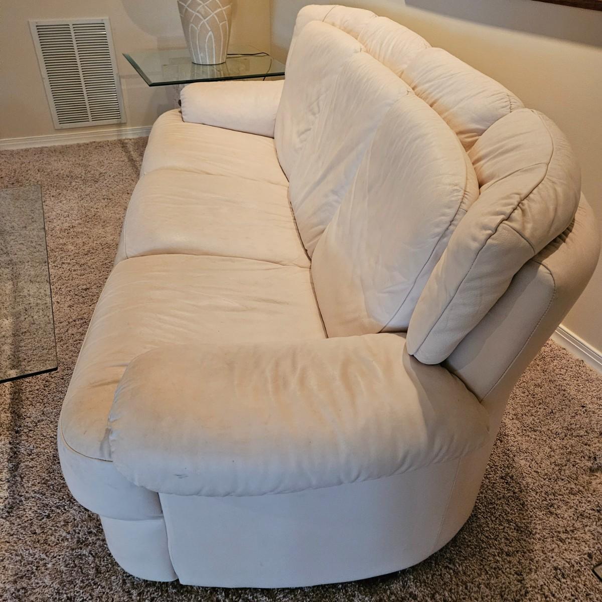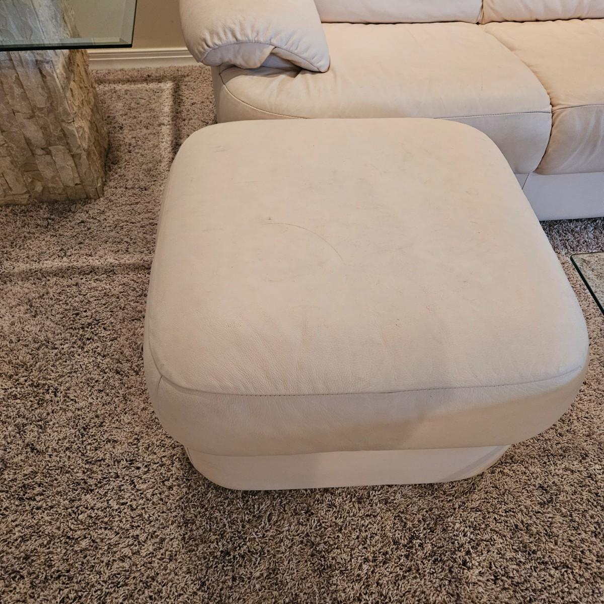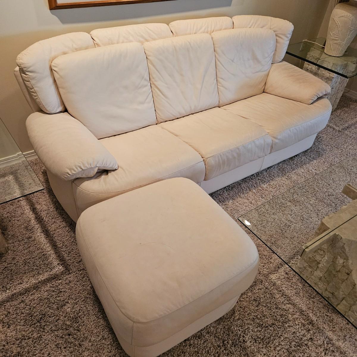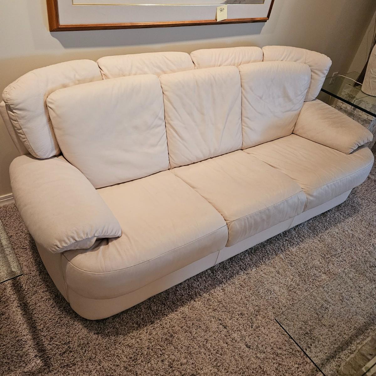 A leather couch and matching ottoman that is off white with a hint of mauve undertone. It measures approximately 82" x 36" x x 33"H with a seat height of 16". The cover photo is very close to its actual color. A matching loveseat and chair are available in other lots in this sale. There is some staining see attached pictures for more detail. Winning bidder must bring assistance to help move and load this item due to its weight and/or size.