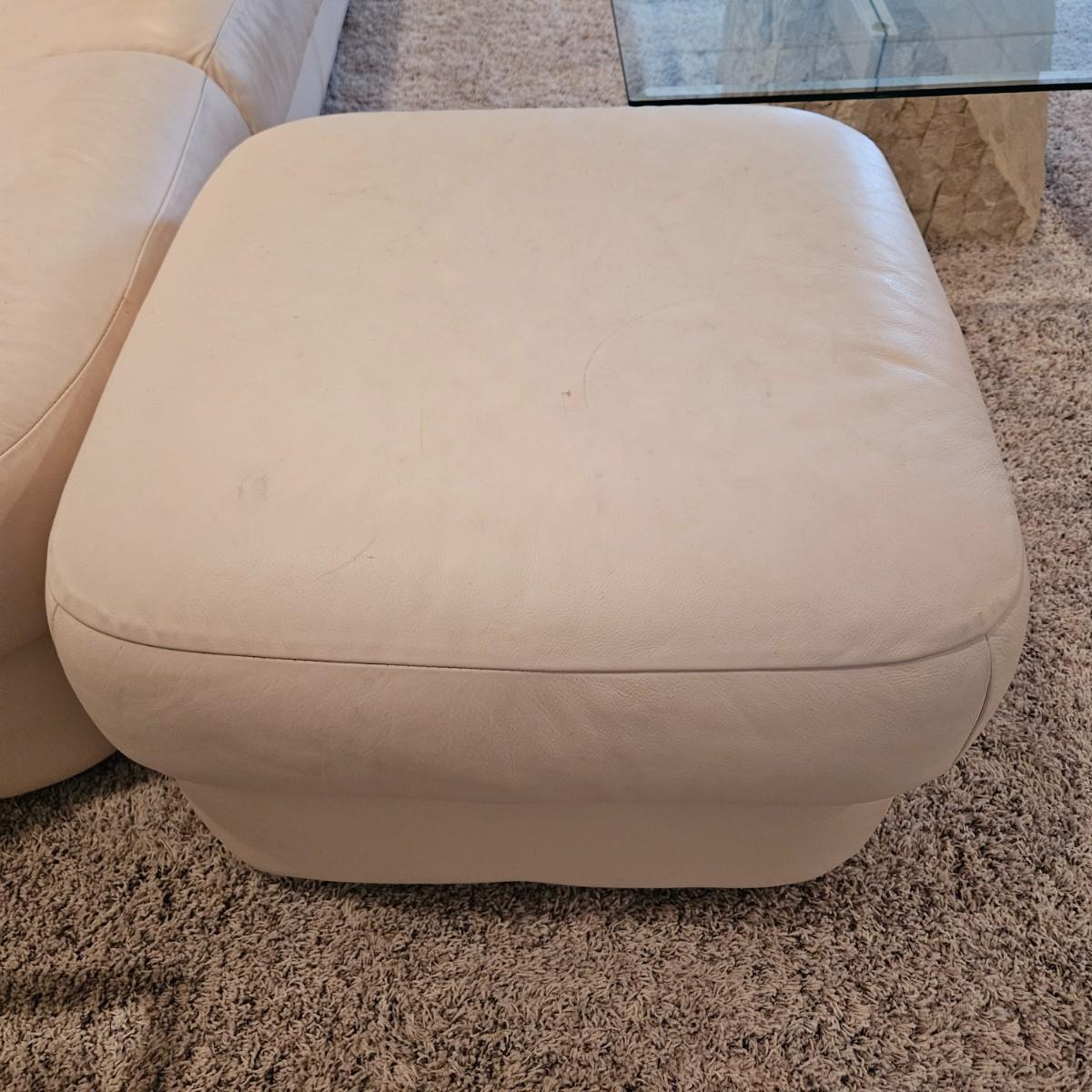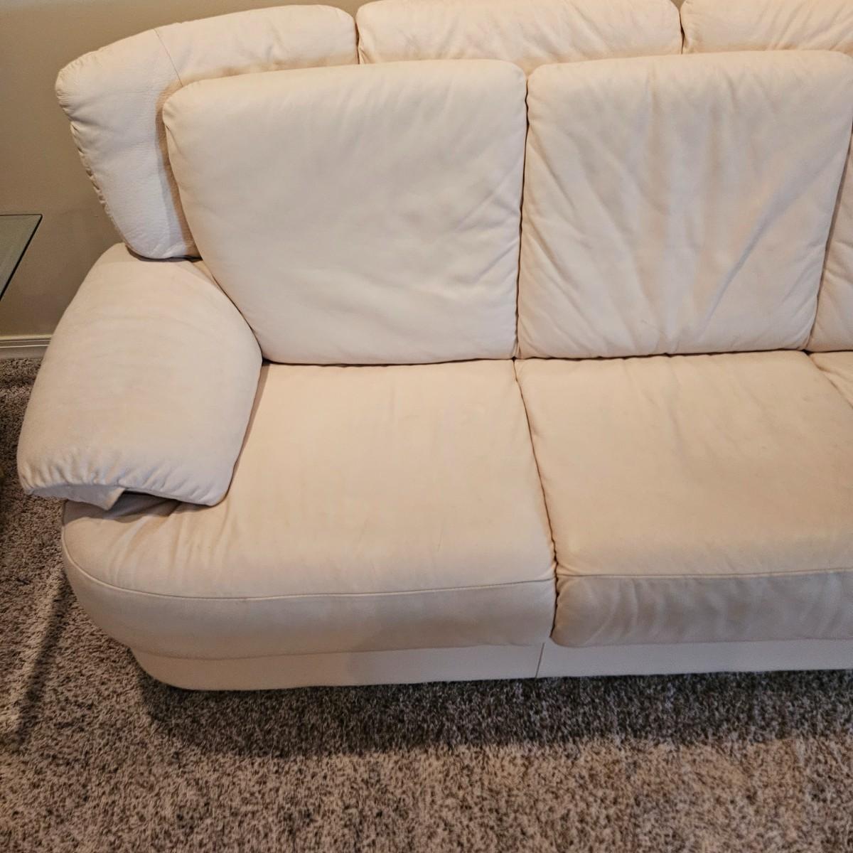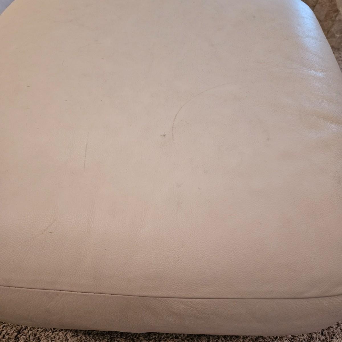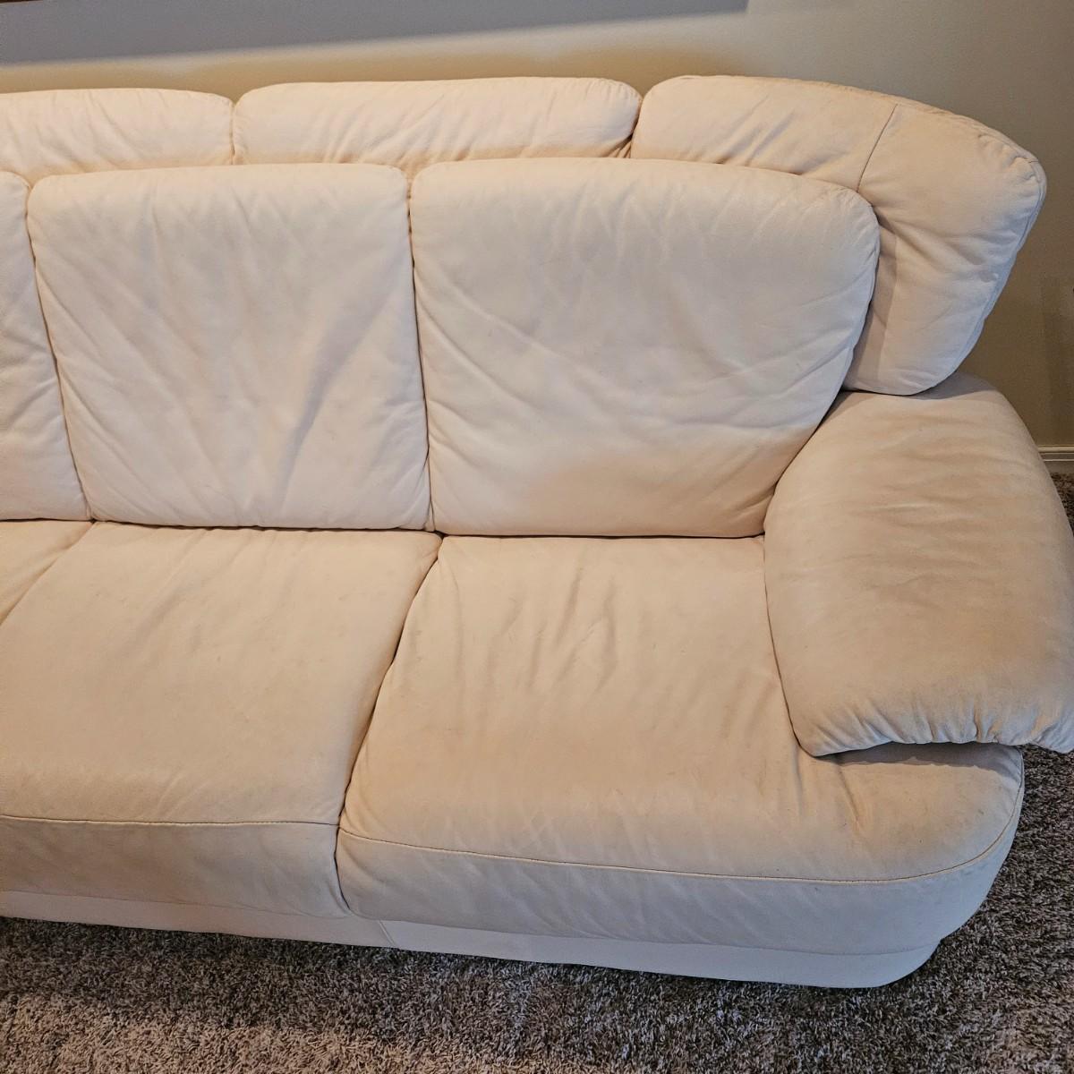 A leather couch and matching ottoman that is off white with a hint of mauve undertone. It measures approximately 82" x 36" x x 33"H with a seat height of 16". The cover photo is very close to its actual color. A matching loveseat and chair are available in other lots in this sale. There is some staining see attached pictures for more detail. Winning bidder must bring assistance to help move and load this item due to its weight and/or size.