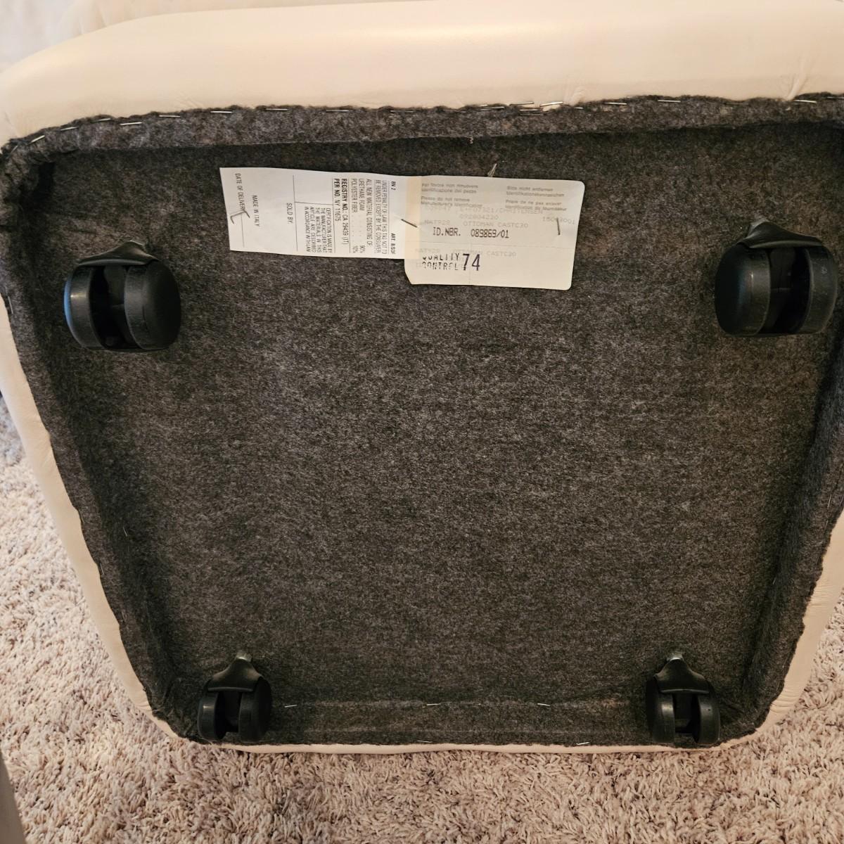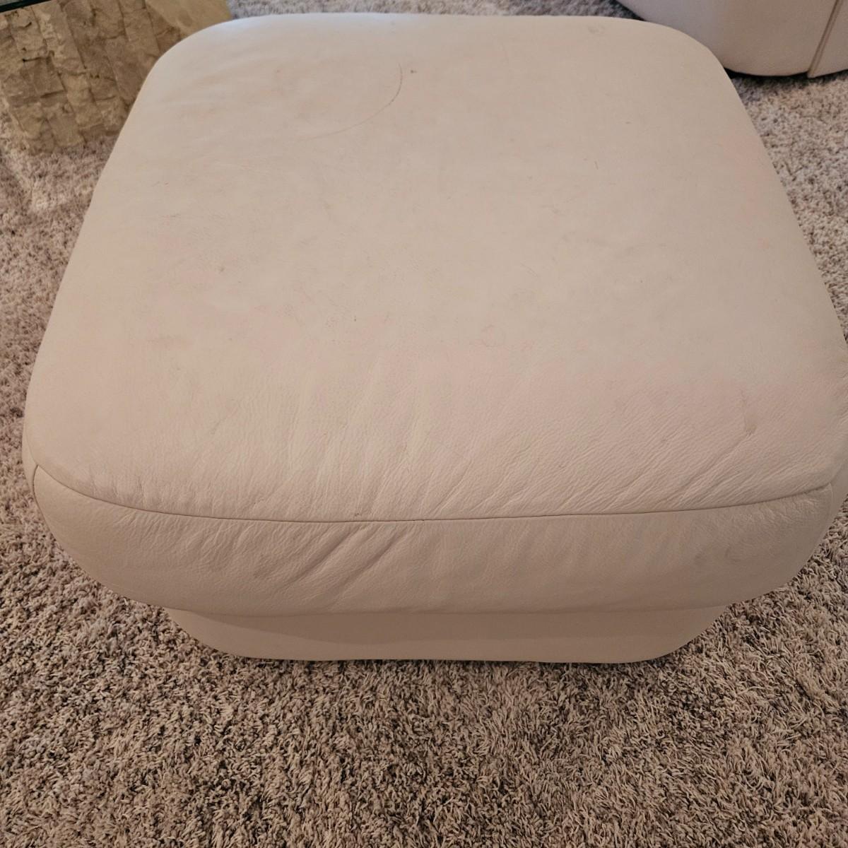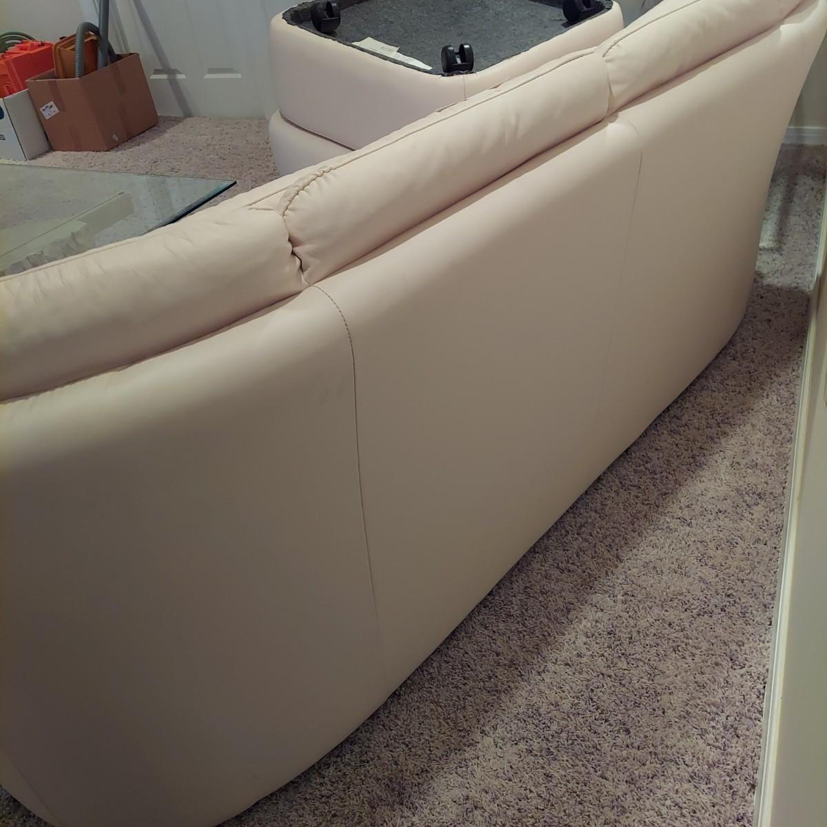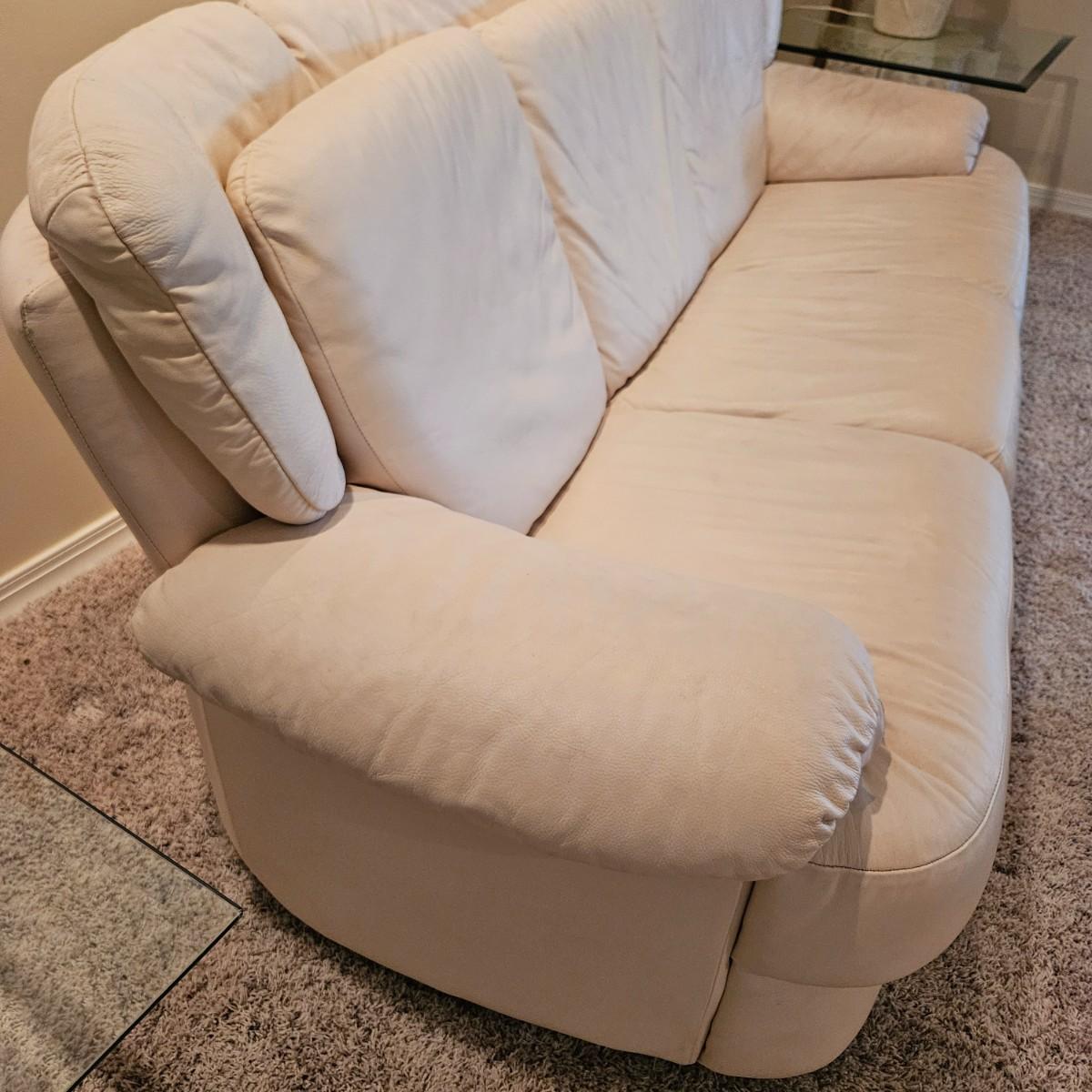 A leather couch and matching ottoman that is off white with a hint of mauve undertone. It measures approximately 82" x 36" x x 33"H with a seat height of 16". The cover photo is very close to its actual color. A matching loveseat and chair are available in other lots in this sale. There is some staining see attached pictures for more detail. Winning bidder must bring assistance to help move and load this item due to its weight and/or size.