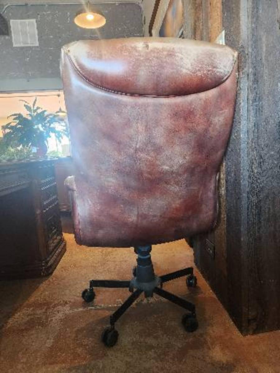Leather office chair featuring a padded seat, backrest, and armrests. The chair is upholstered in a distressed leather finish with nailhead trim detail. It includes a rolling base with five casters and an adjustable height mechanism for comfort and functionality. Suitable for office or study use. Condition appears to show light wear consistent with usage.