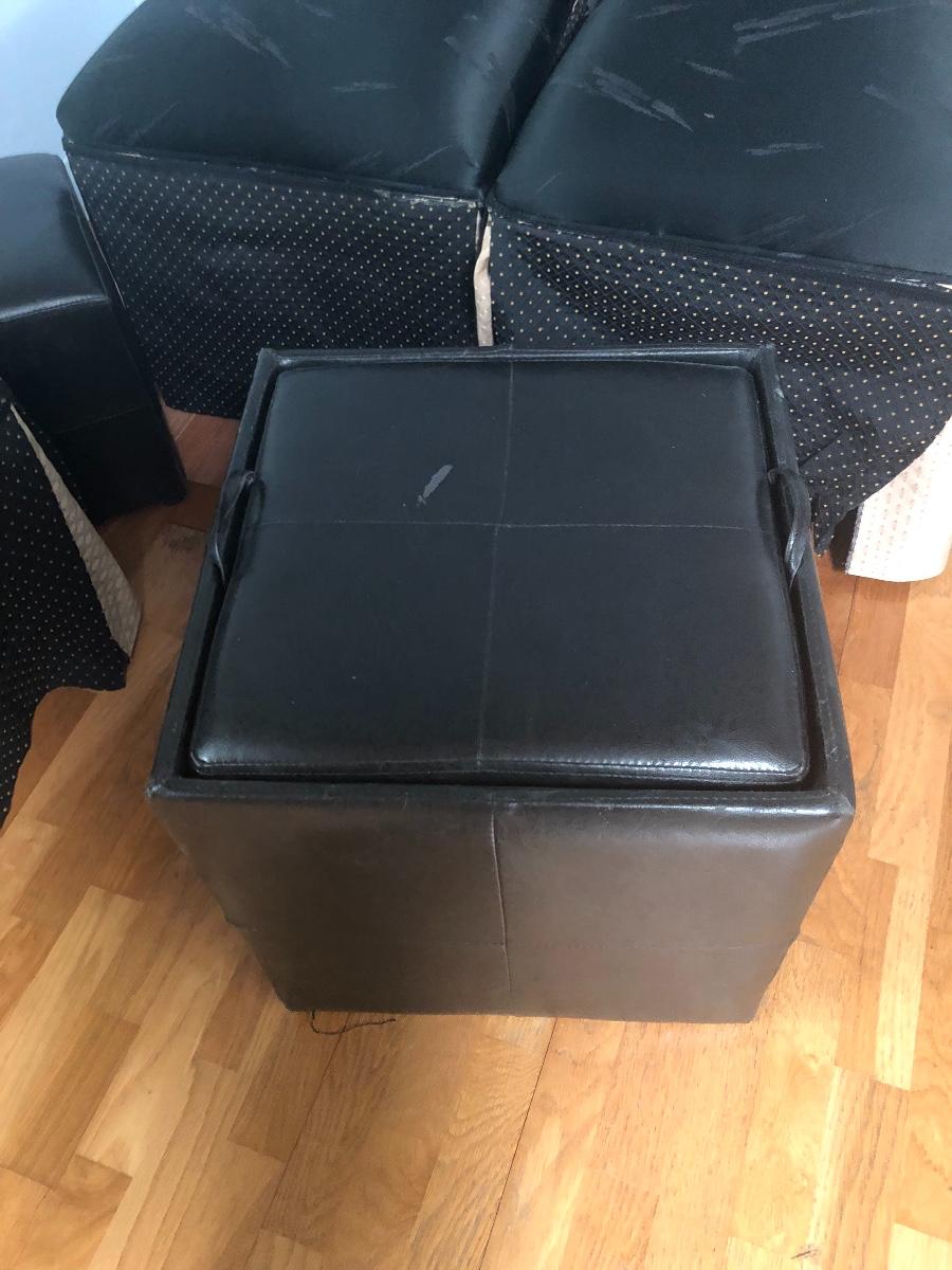 These are great leather pieces. Large piece has storage inside and measures 17 x 17. The smaller piece measures 14 x 13