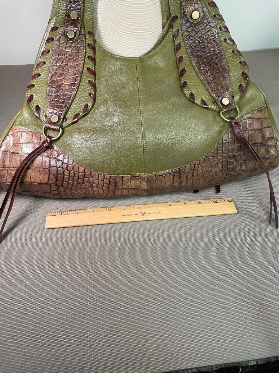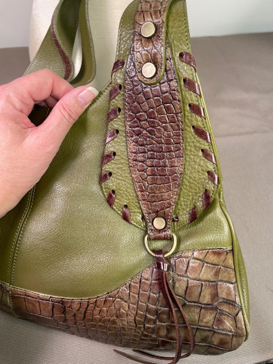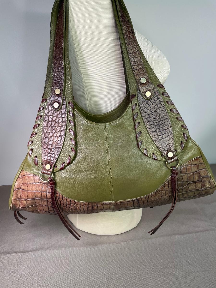 Olive green pebble leather with croc embossed brown leather panels. Whip stitching and antique gold tone hardware. Opens wide for easy access.