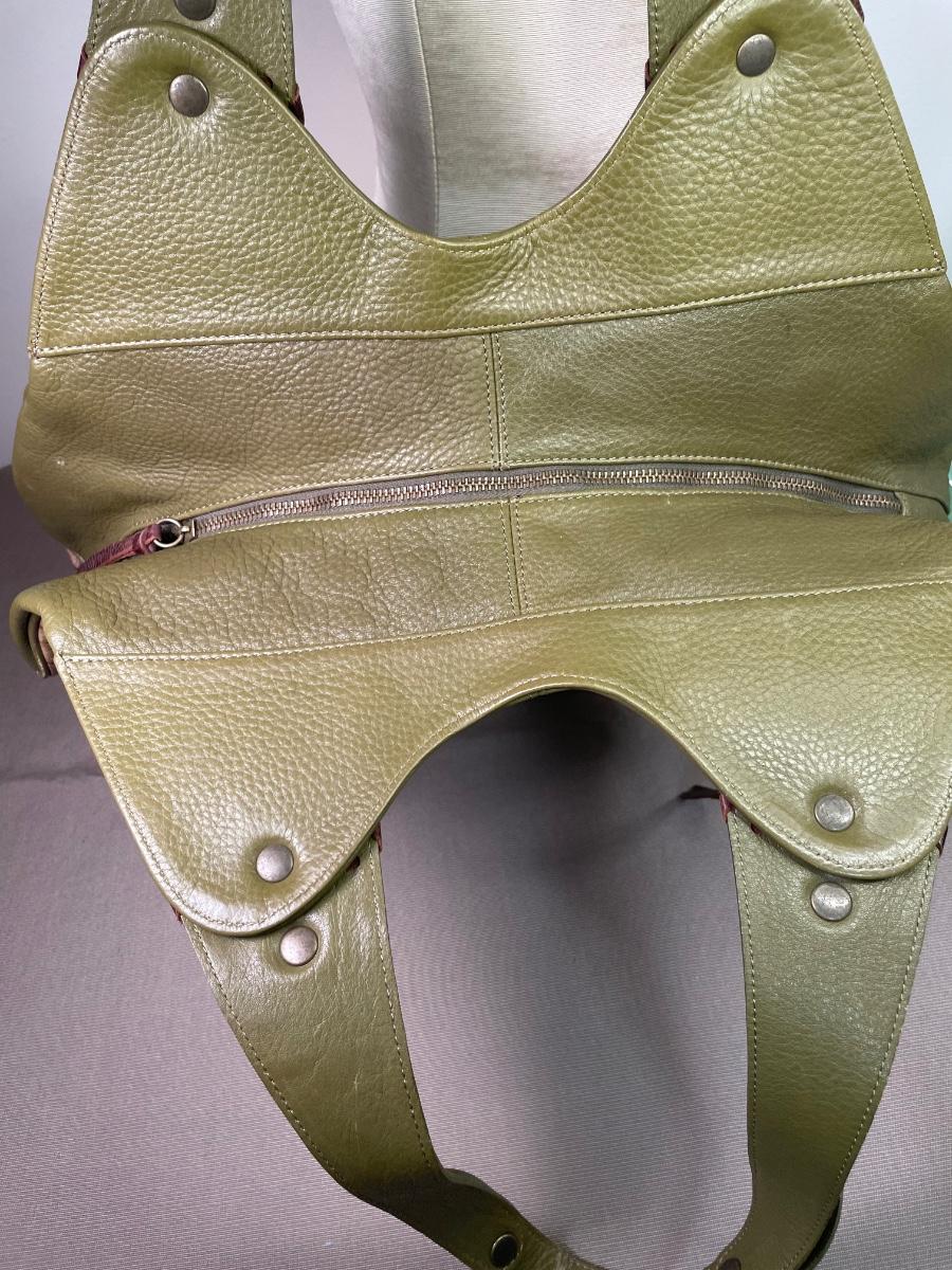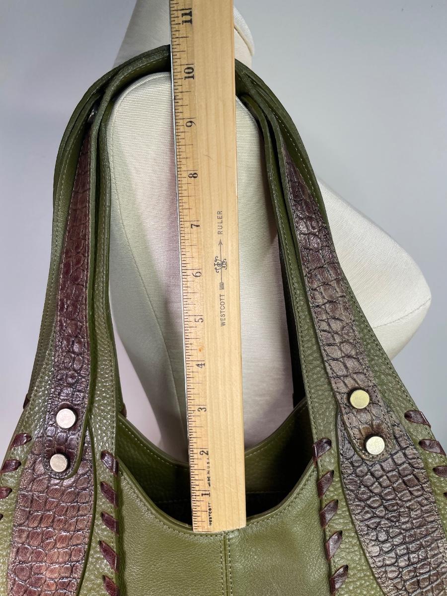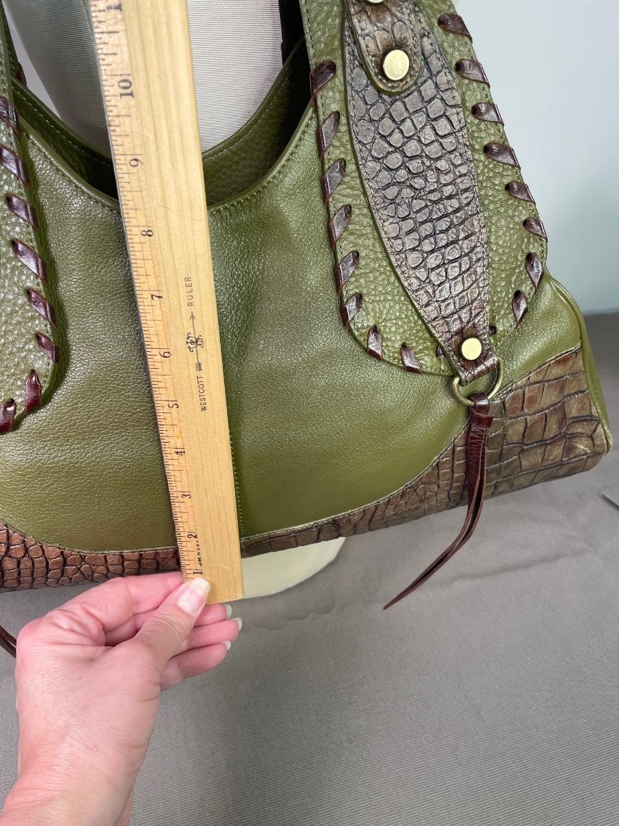 Olive green pebble leather with croc embossed brown leather panels. Whip stitching and antique gold tone hardware. Opens wide for easy access.