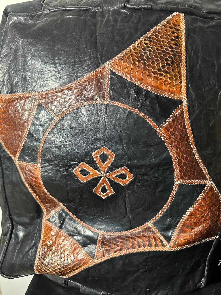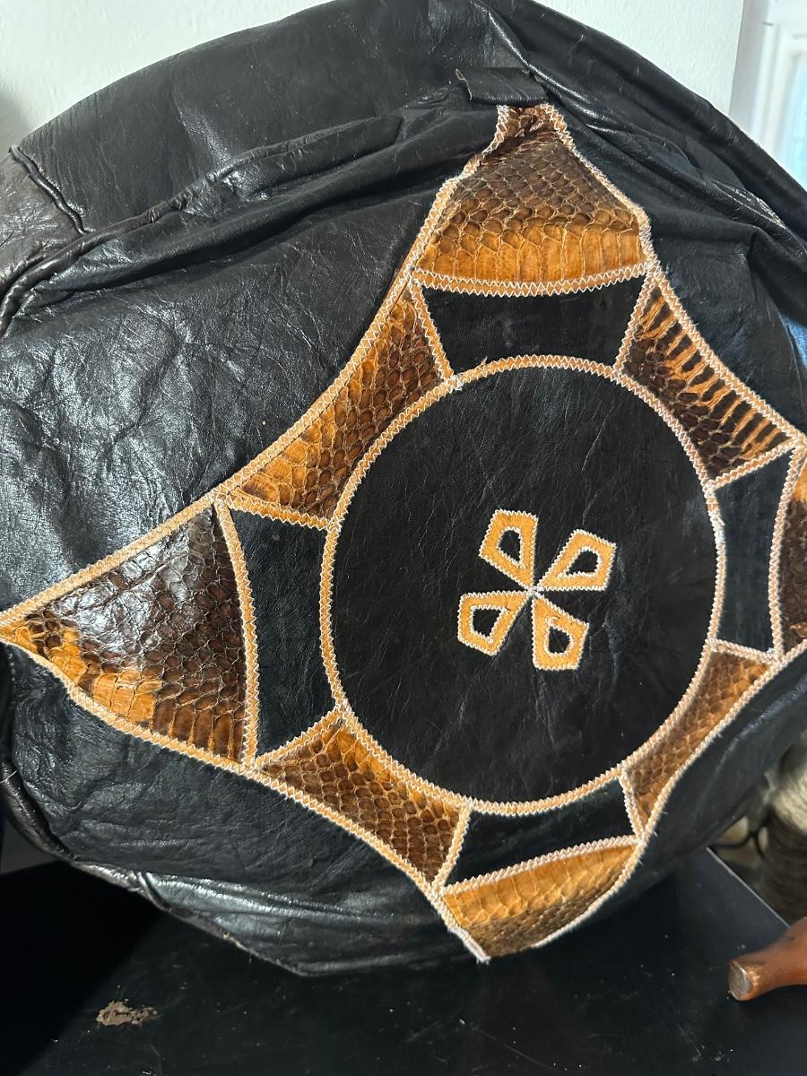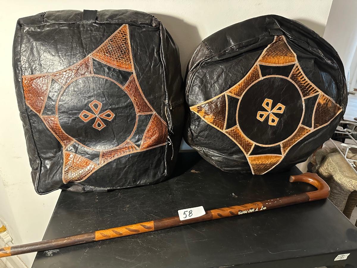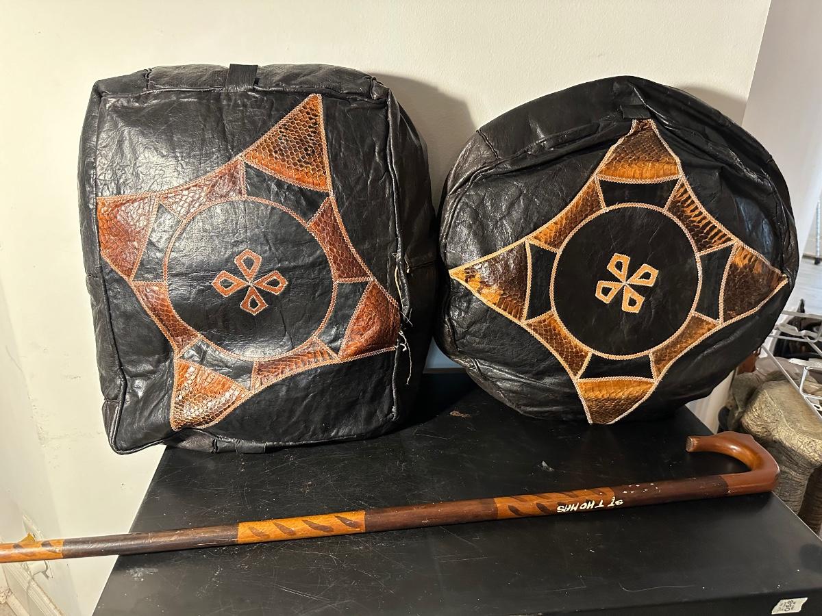 LEATHER POOF/ WALKING CANE LOT, ONE POOF NEEDS REPAIR - SEE PHOTOS