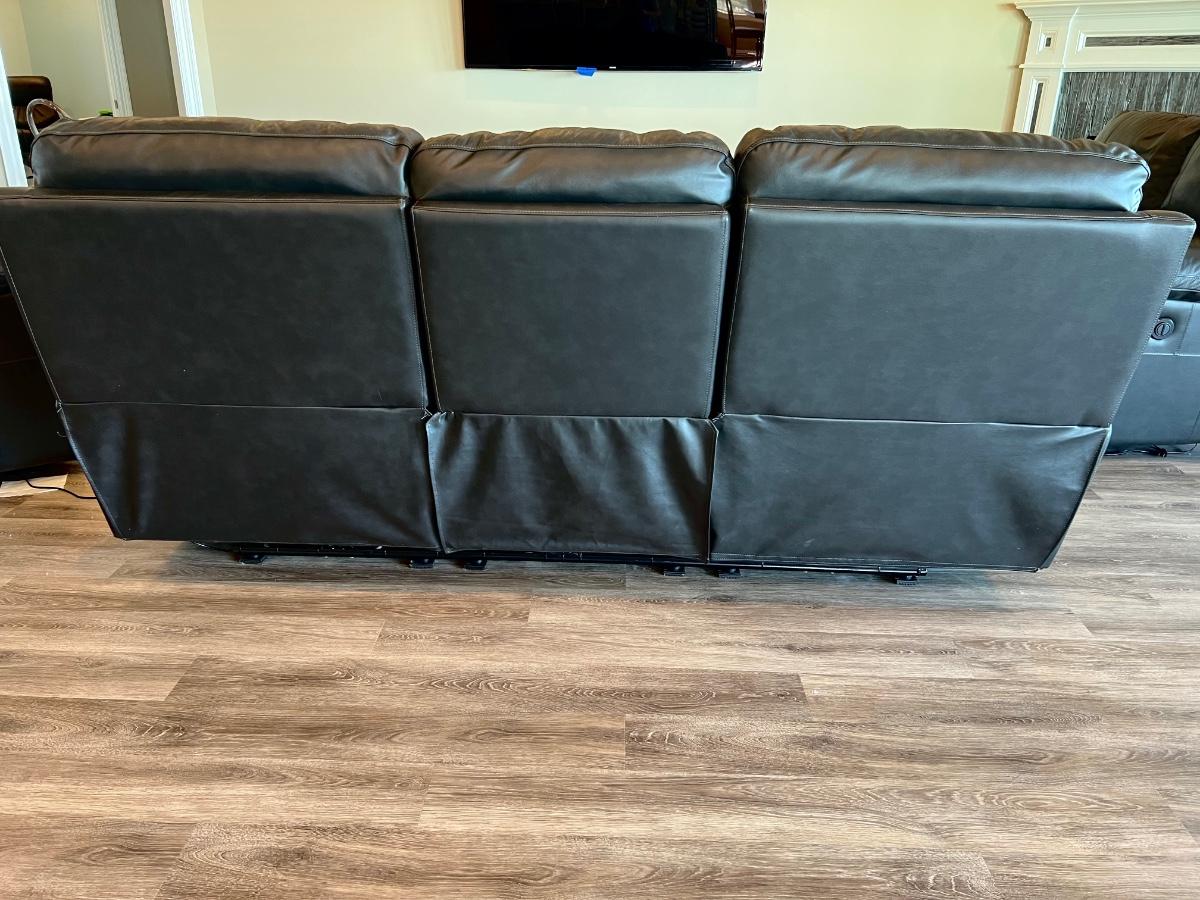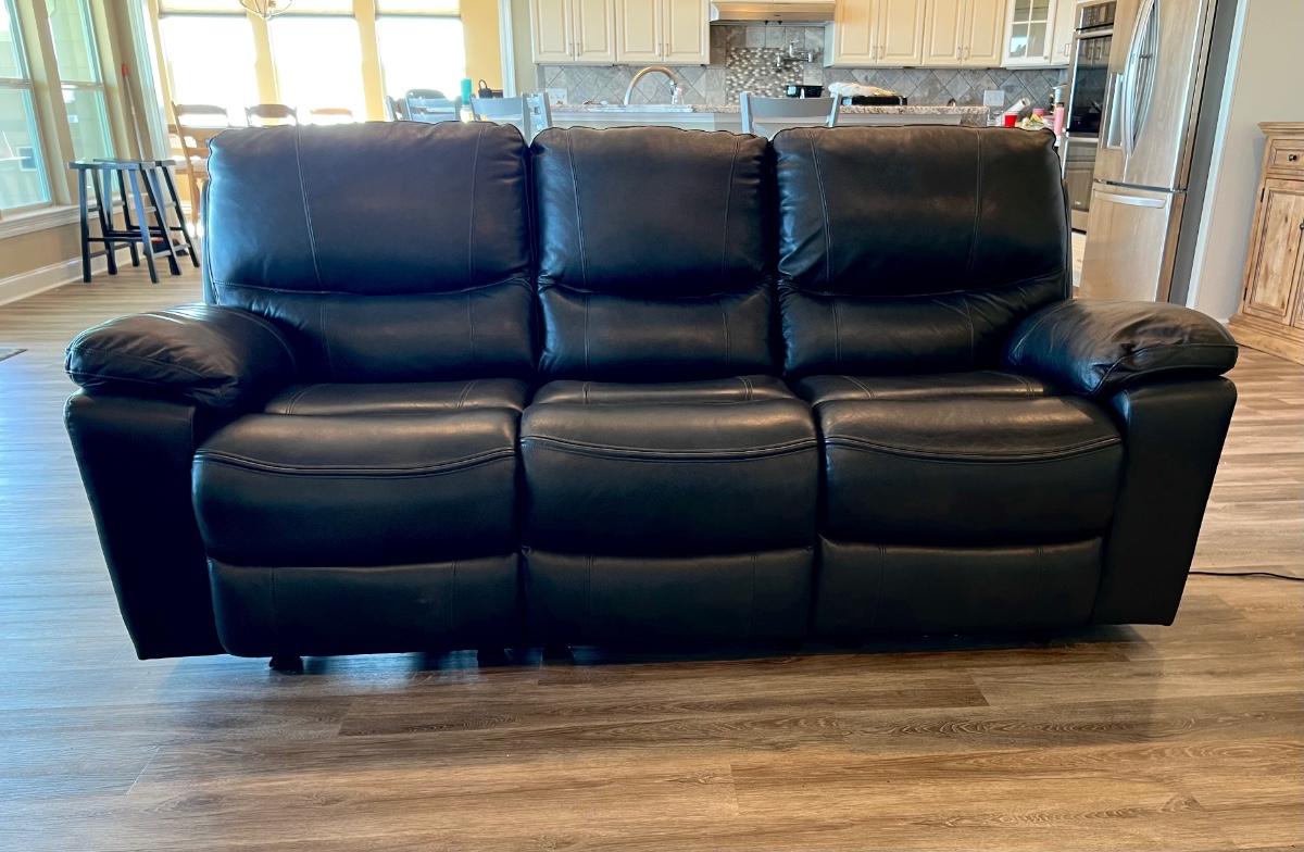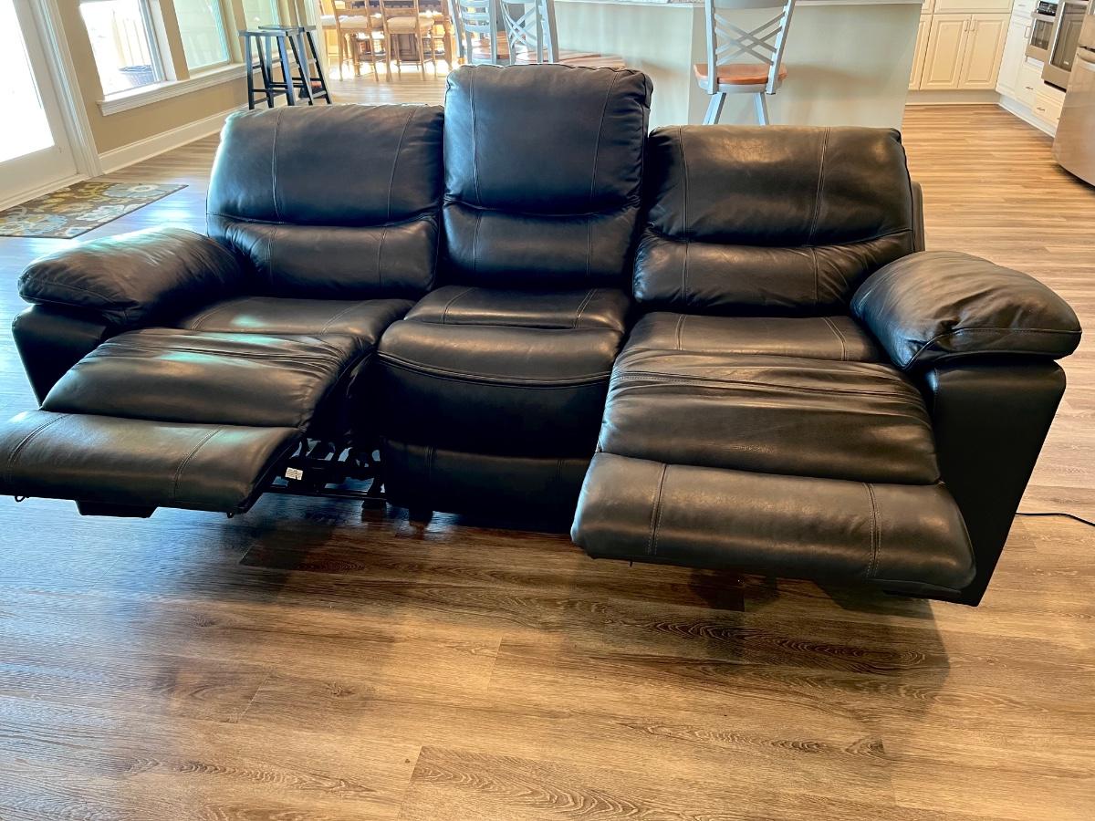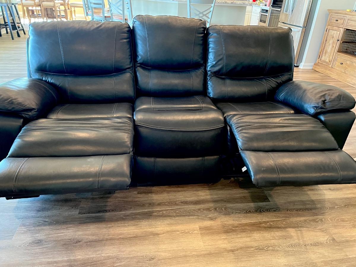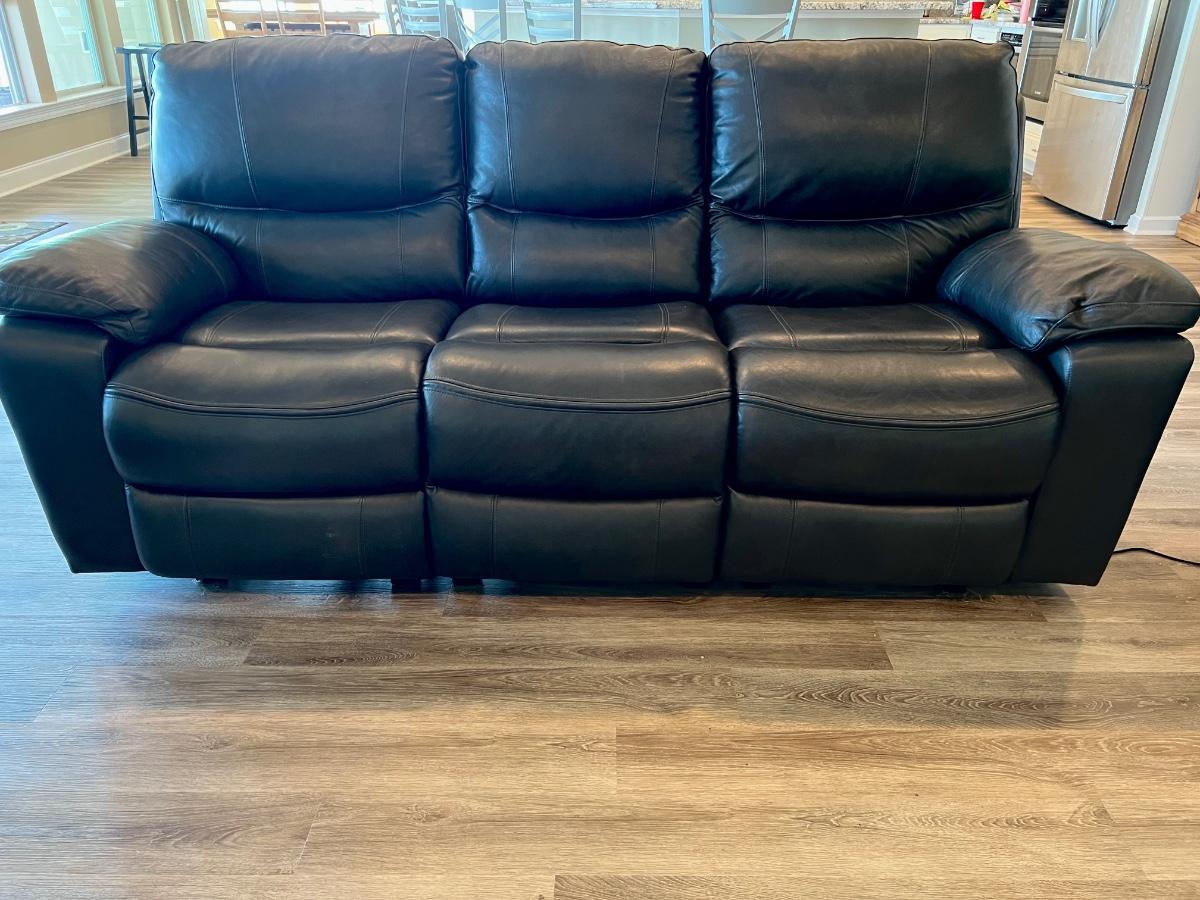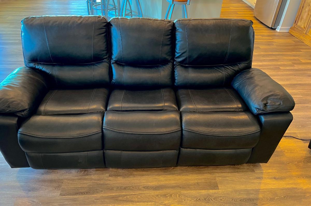 LIKE NEW, Black Leather, POWER Recliner SOFA. Reclines on both sides. Measures 83 inches long, 40 inches deep, 42 tall. 19 inches floor to seat.