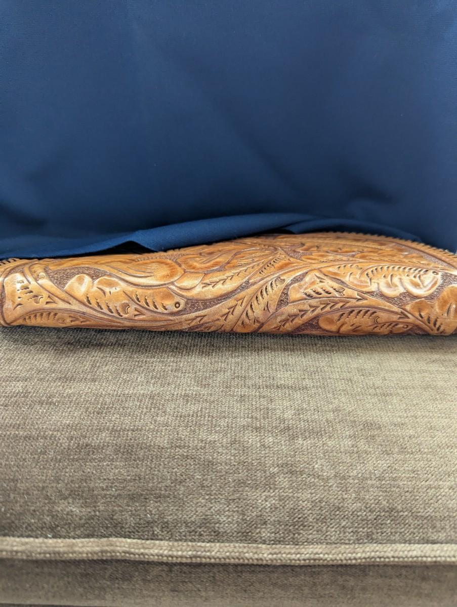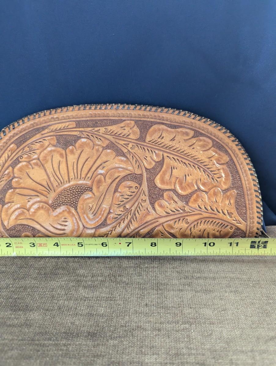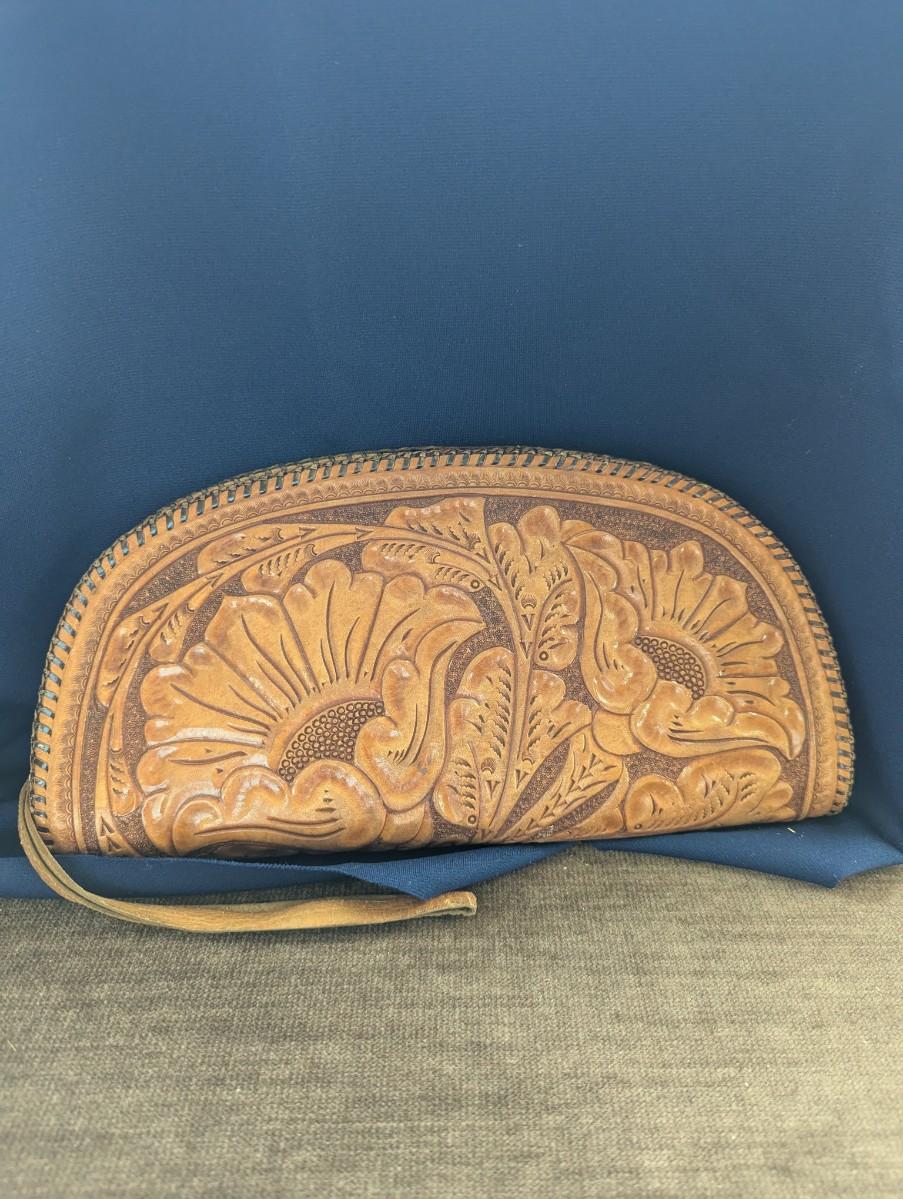 Vintage 1970's hand tooled leather clutch purse embossed with floral and leaf design with lacing.