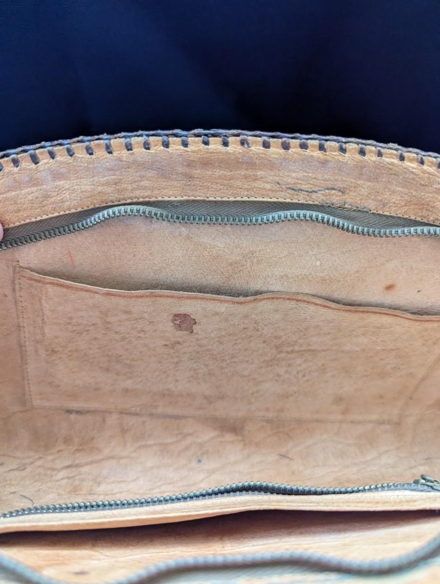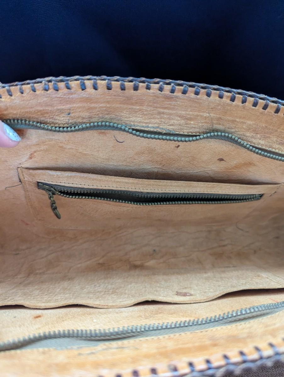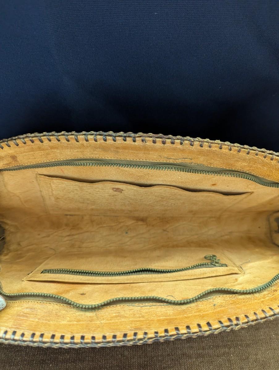 Vintage 1970's hand tooled leather clutch purse embossed with floral and leaf design with lacing.