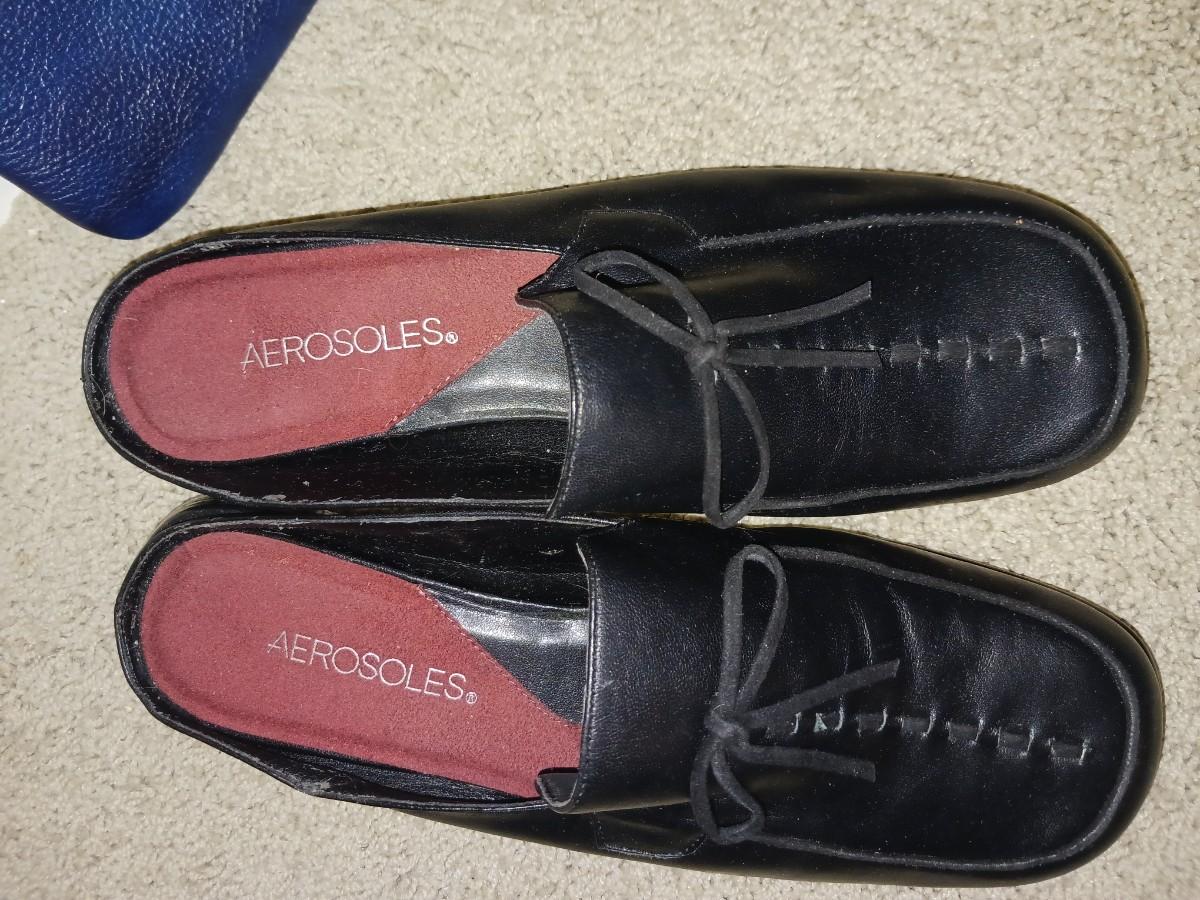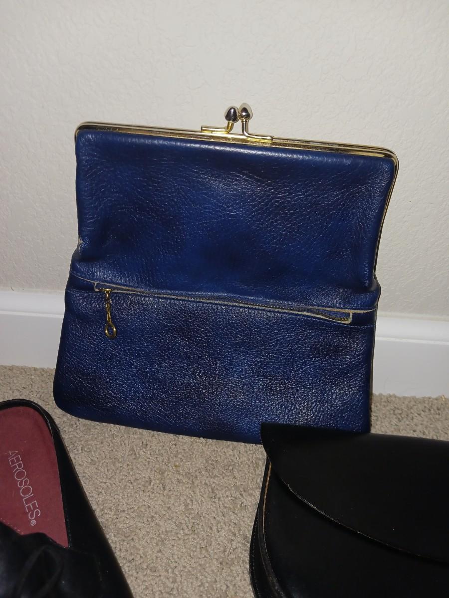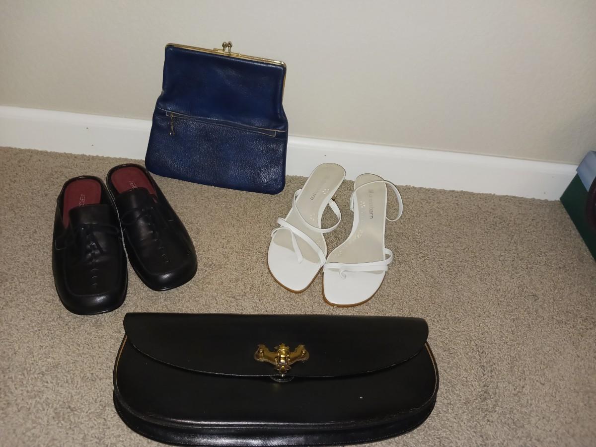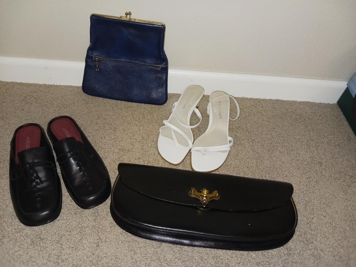 LEATHER PURSE BY NUESTETERS, 2 PAIRS OF SHOES (7) AND ANOTHER PURSE