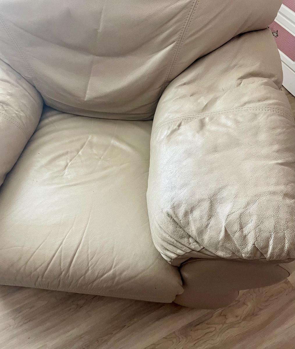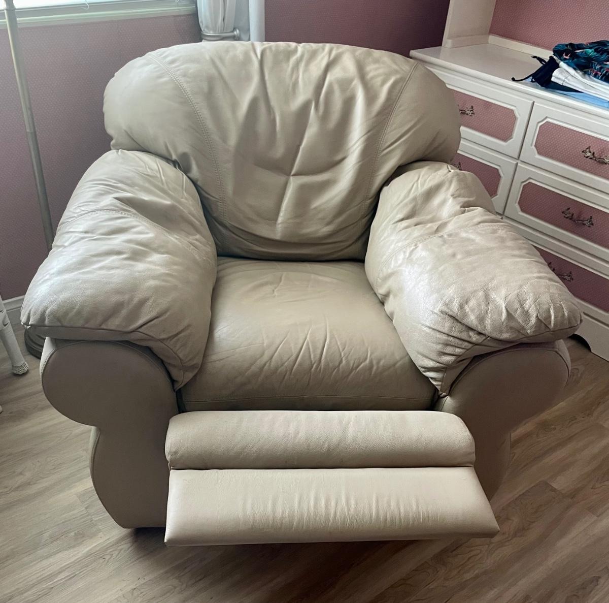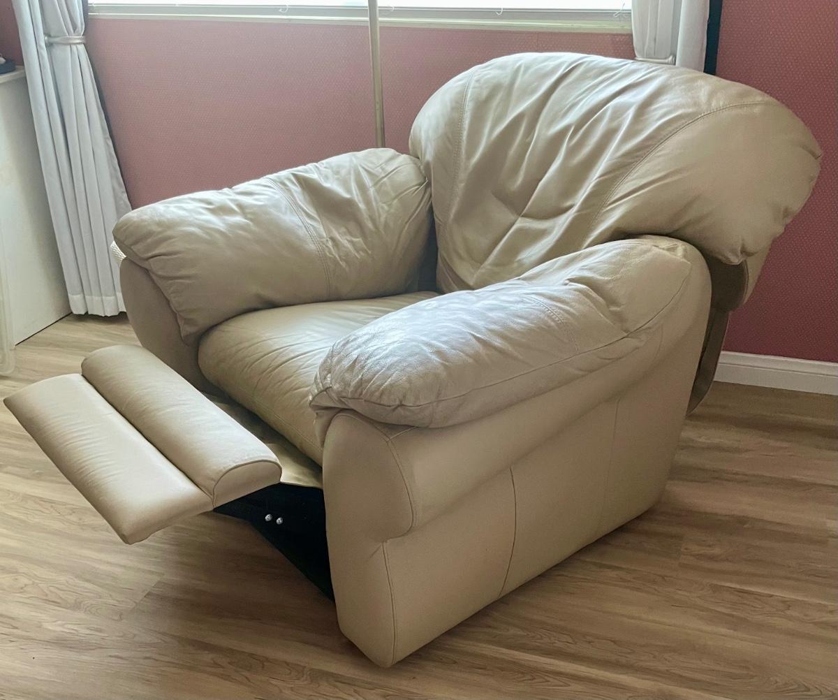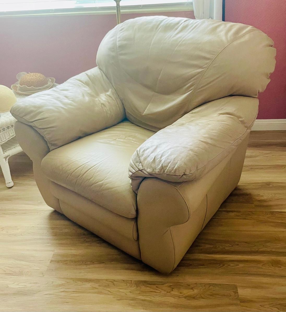Soft, overstuffed recliner covered with beige leather. Matches the loveseat available in this auction. 36” wide.