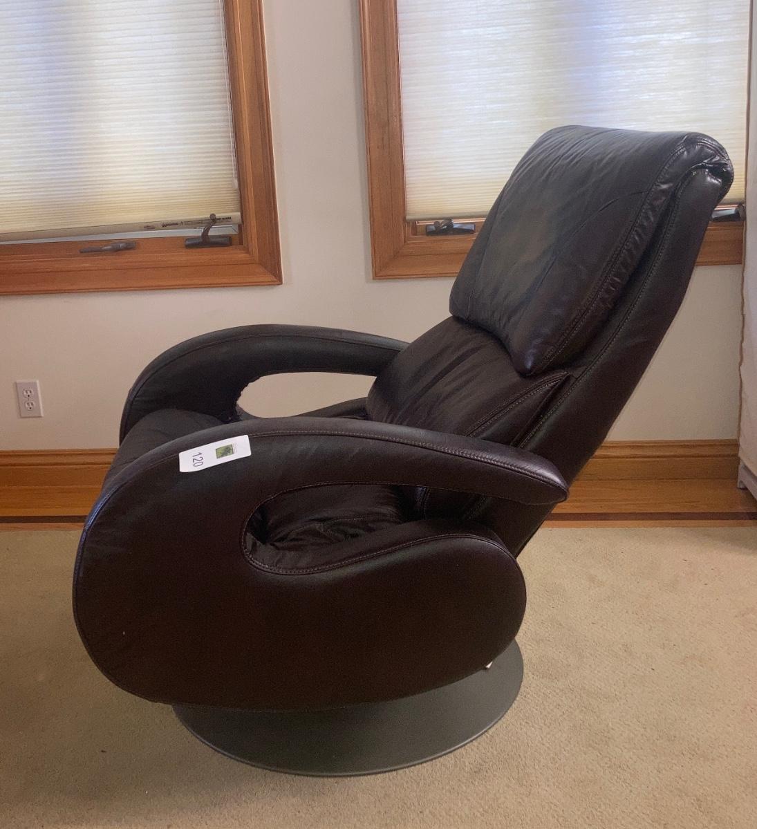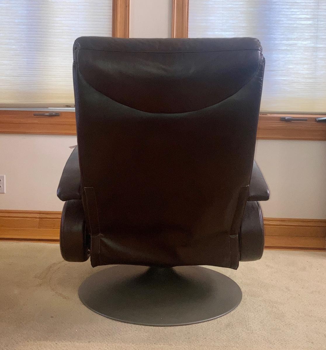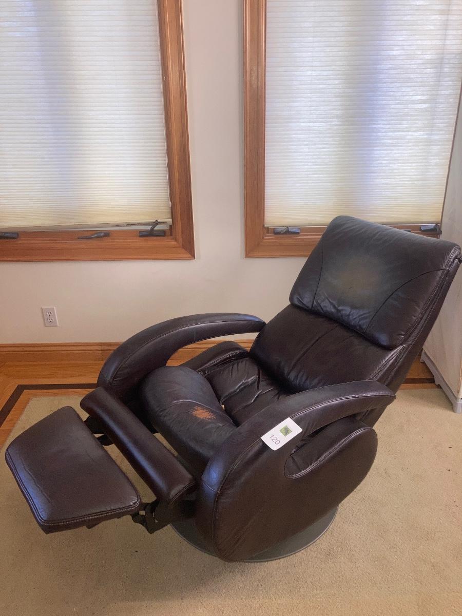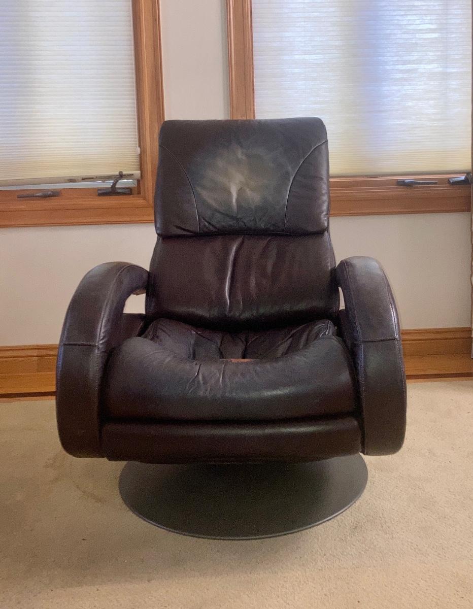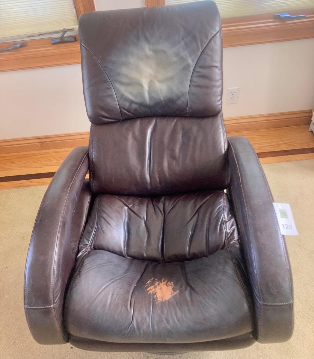 Well loved leather recliner, no tears or rips however head rest has some discoloration as well as the the front cushion (see photos)
