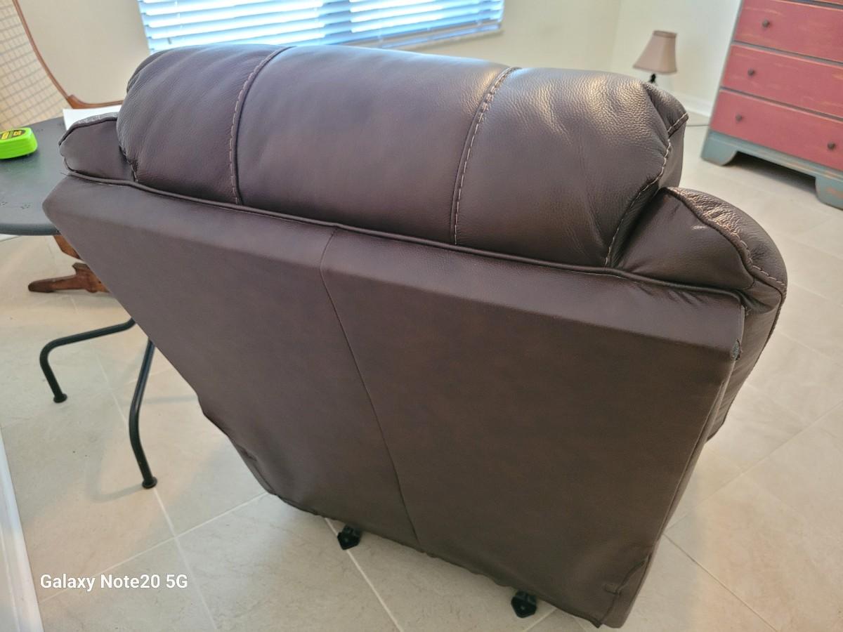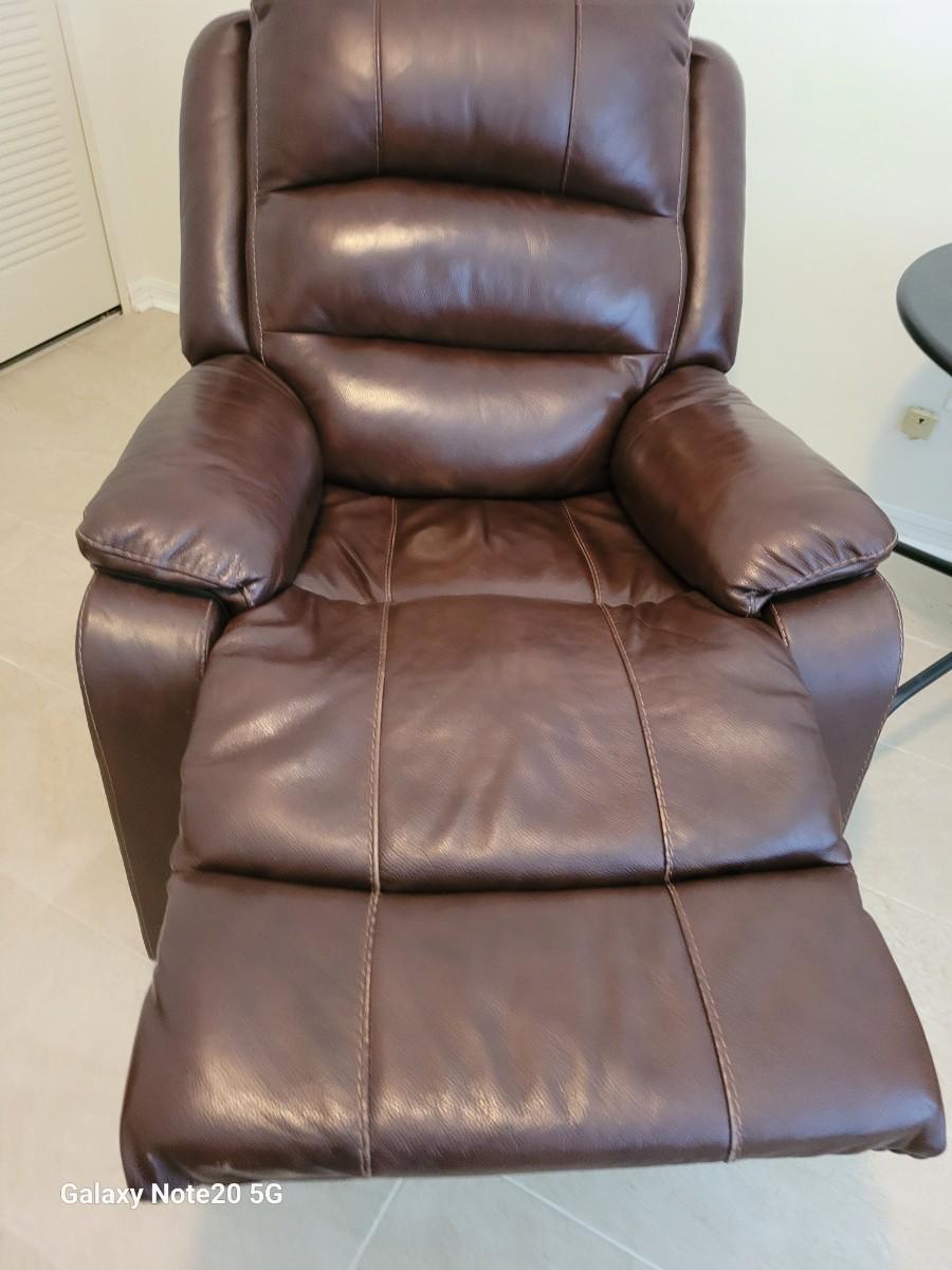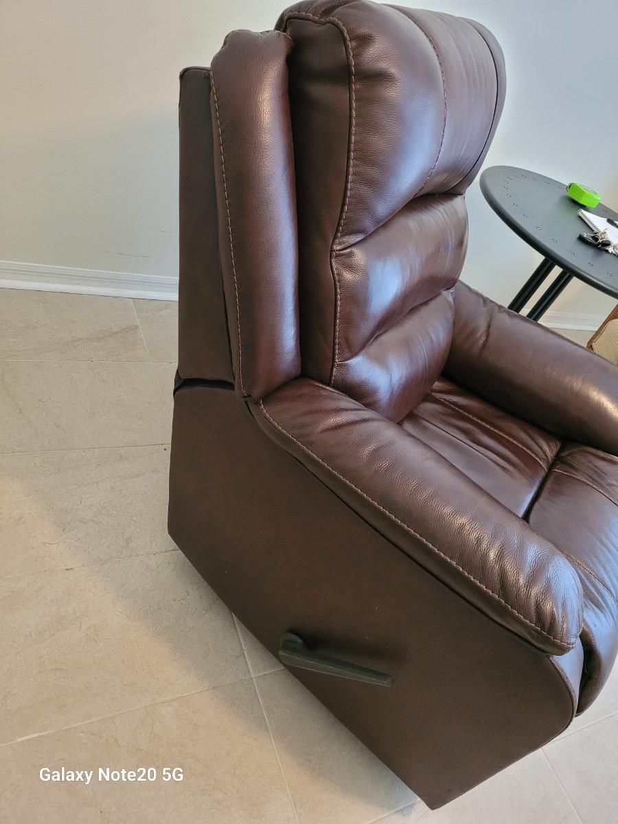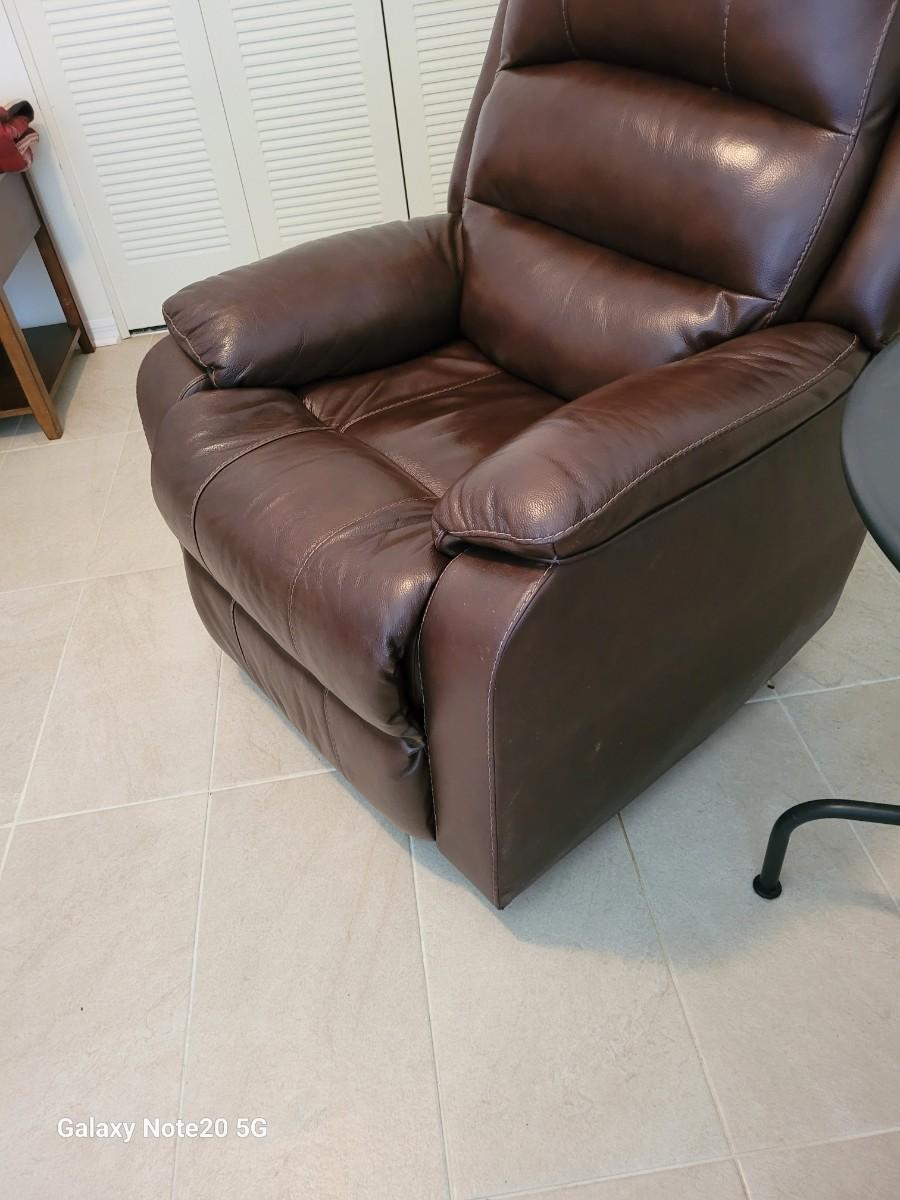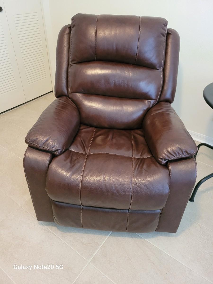 Brown Leather ( where it touches you) Manu recliner. Excellent condition. 33"x42"x33". Good size.