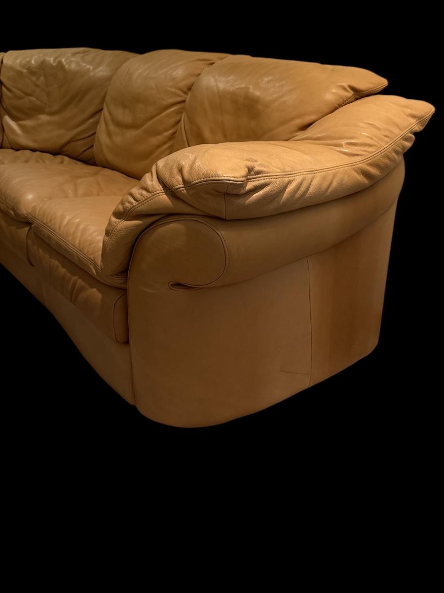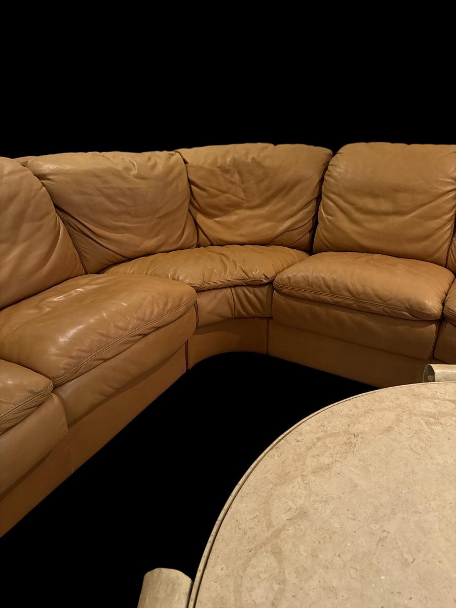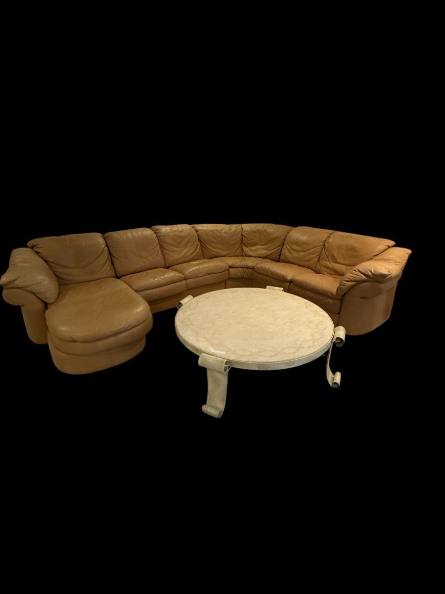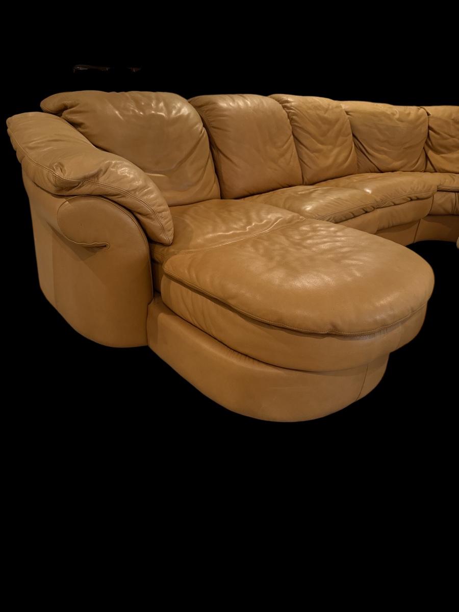 This is a large, curved sectional Italian leather sofa in a warm tan color. It features: