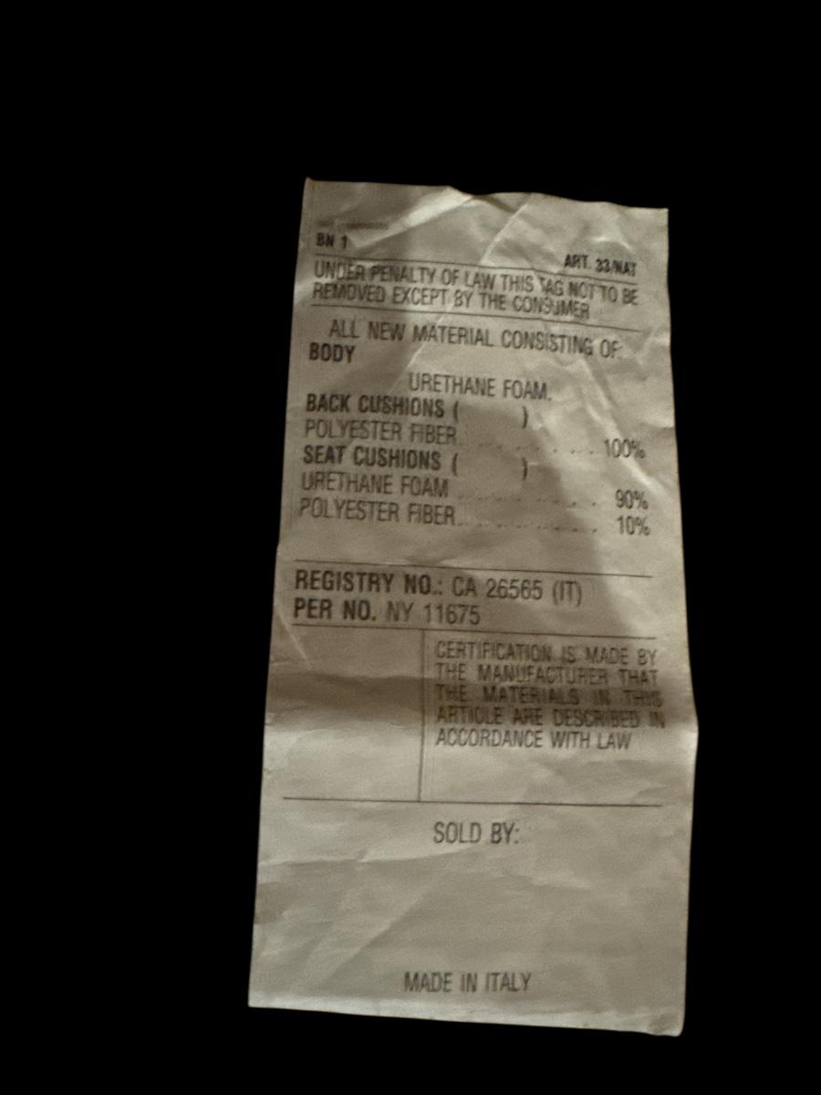 • Plush back and seat cushions filled with urethane foam and polyester fiber, as noted on the manufacturer tag.