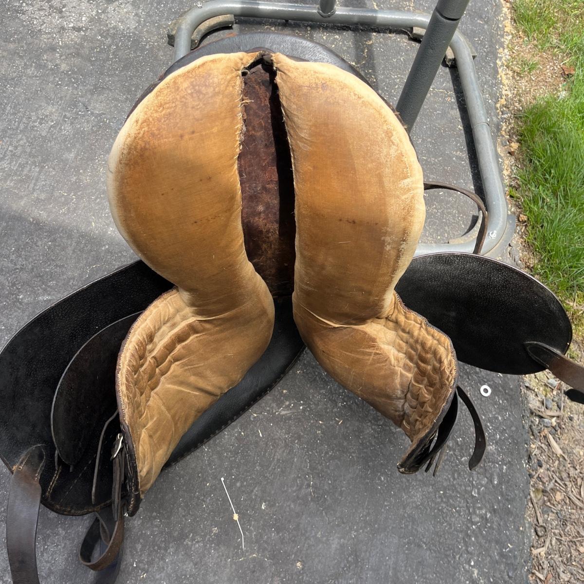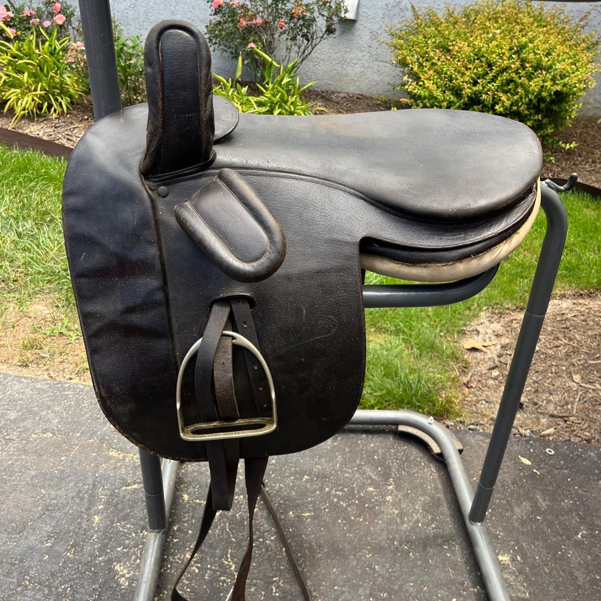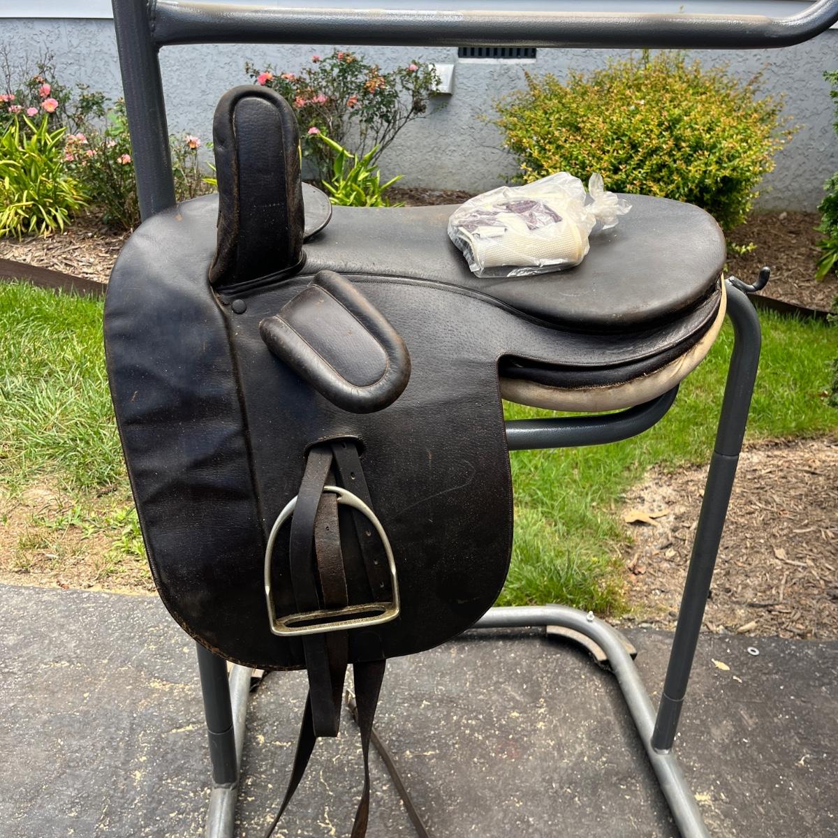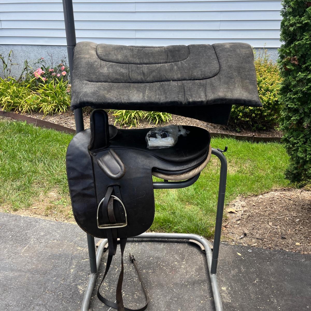 Lot includes a leather side saddle with girth and a Shneiders saddle pad. Saddle measures 21” long x 13” wide. Saddle rack not included but available in auction.