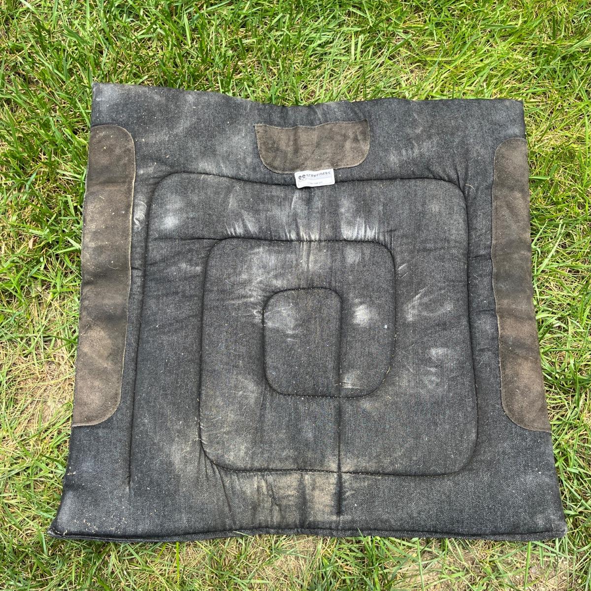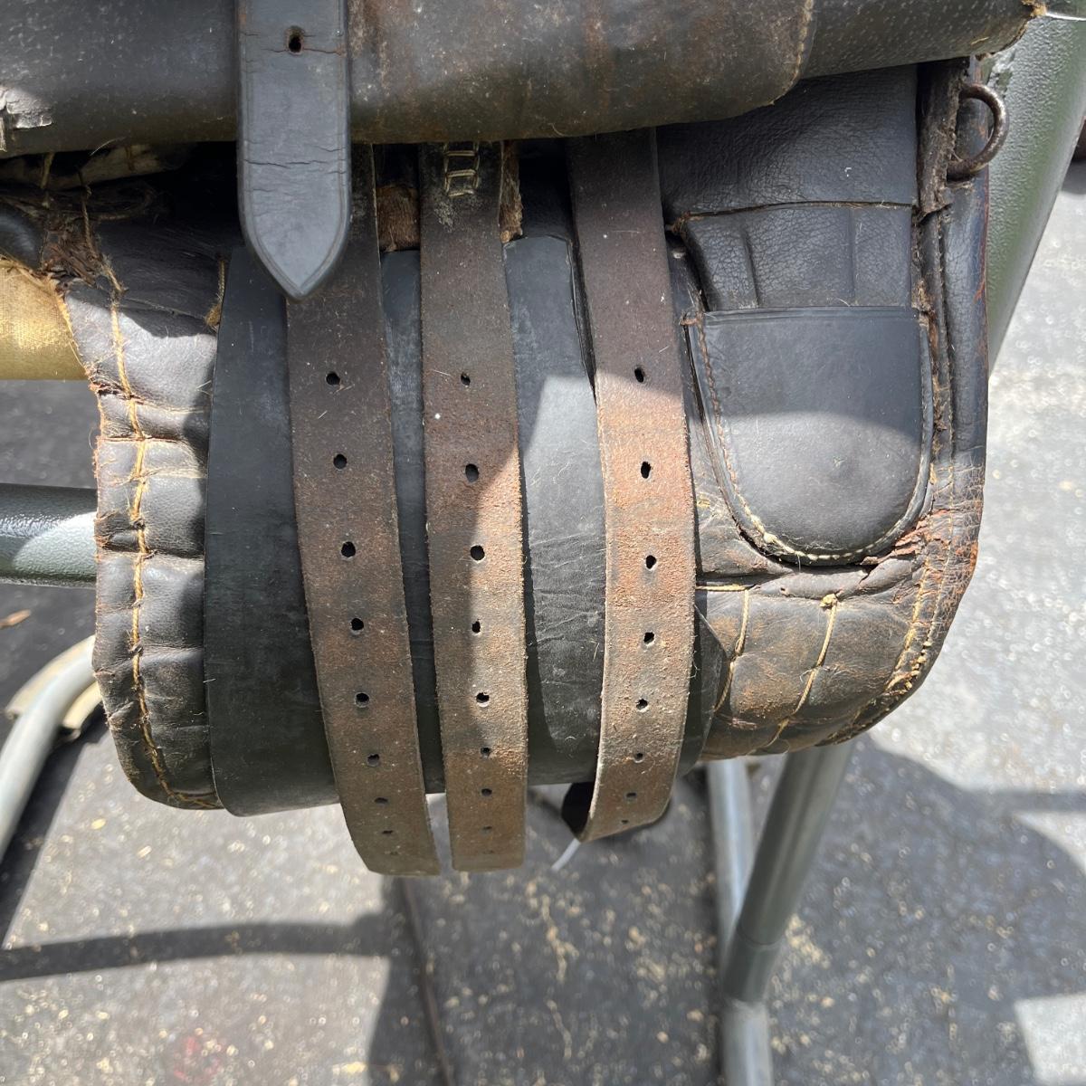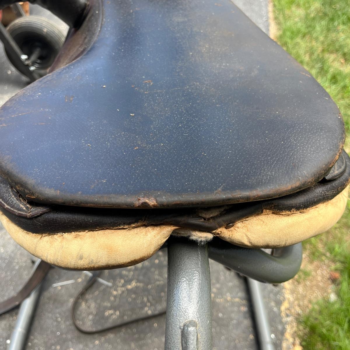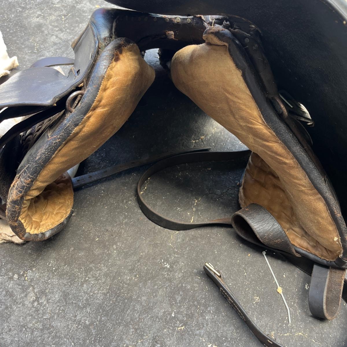 Lot includes a leather side saddle with girth and a Shneiders saddle pad. Saddle measures 21” long x 13” wide. Saddle rack not included but available in auction.