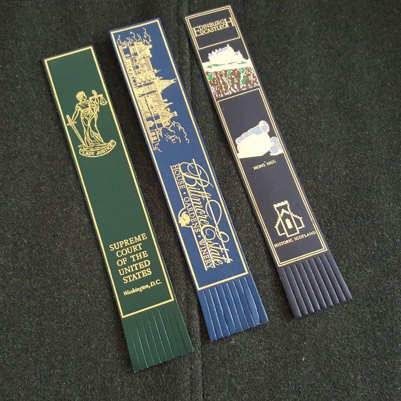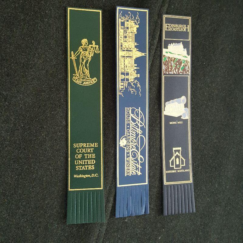 This lot is for 3 Leather Souvenir Bookmarks. One is from Edinburgh Castle showing Monds Meg, another is from America's largest home - The Biltmore Estate in North Carolina and the third is from the US Supreme Court in Washington, D.C.