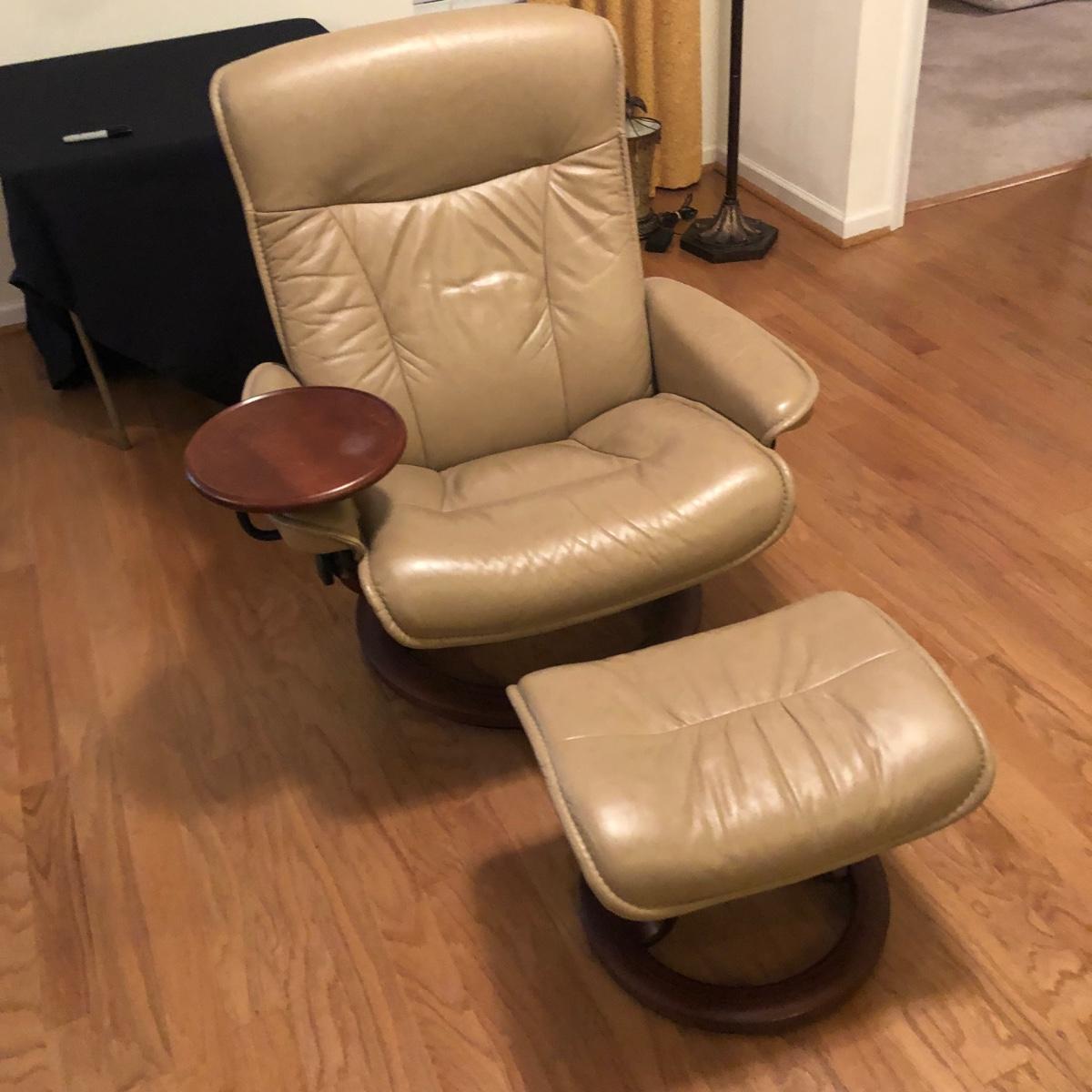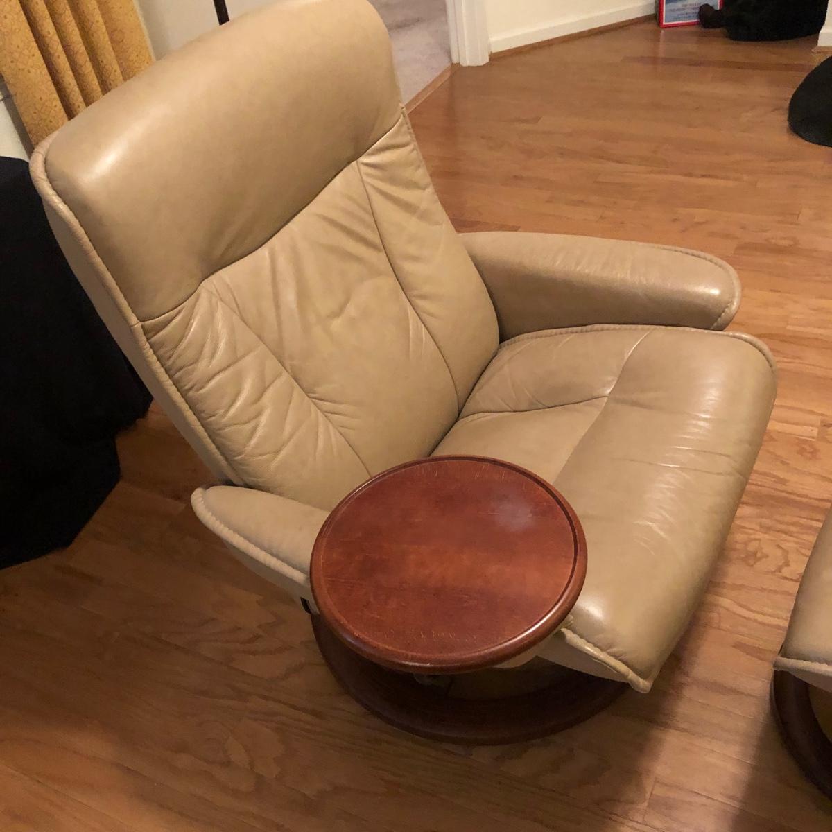 This is a leather swivel reclining chair with foot stool. The round wooden table swivels in and out and measures 12” in diameter. The chair measures 36” x 27” x 38”. The seat is about 17” high. The foot stool measures 20.5” x 15” x 16”. Both items appear to be made from leather. The foot stool also swivels just a bit. Local pick up only.
