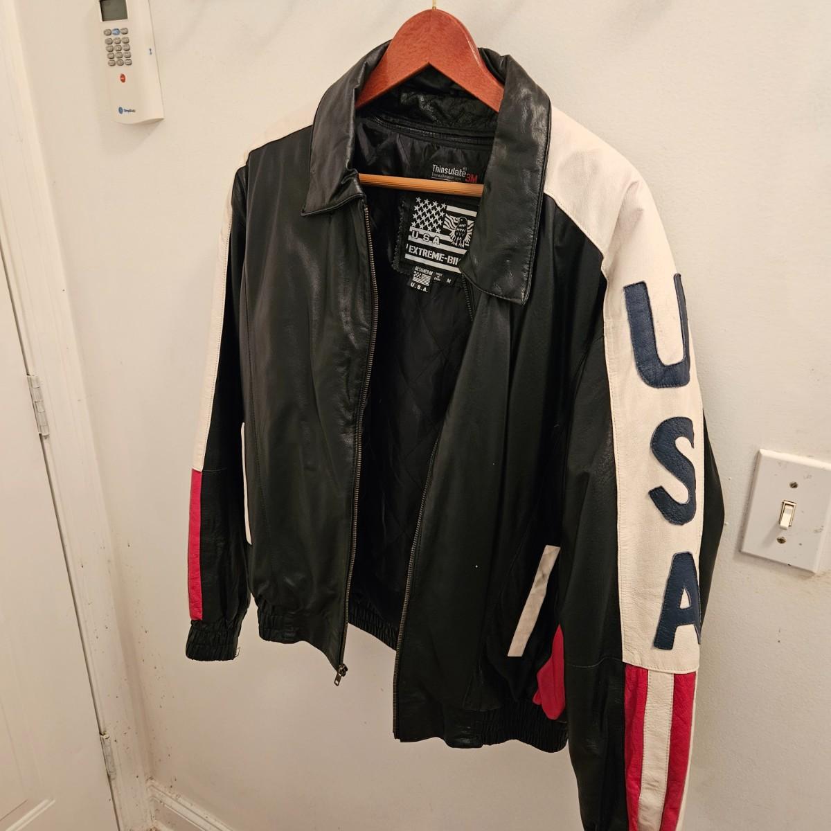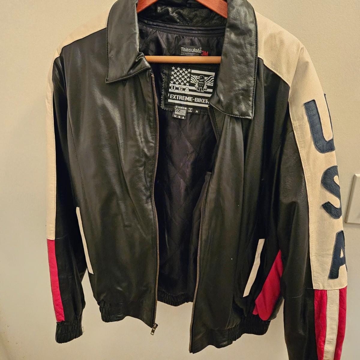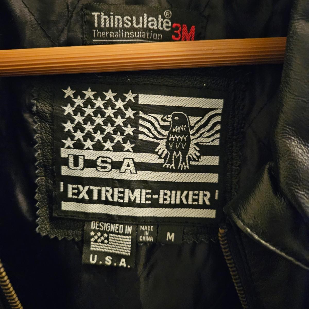 A size M leather jacket made by Extreme Biker that feature USA in the sleeves and an American flag on the back and a removable Thinsulate liner. There are some minor stains on one sleeve, which appears to be cleanable. Shipping available