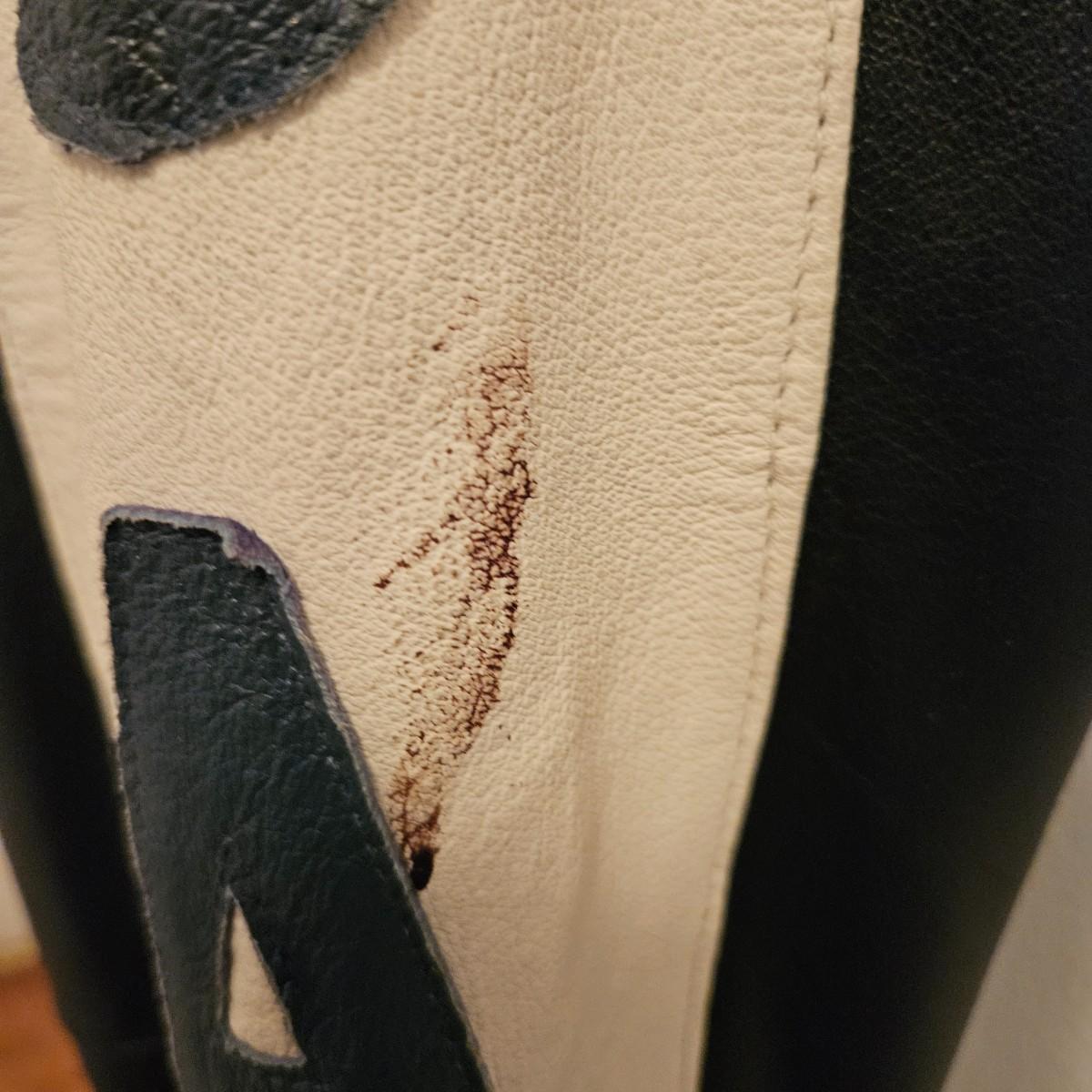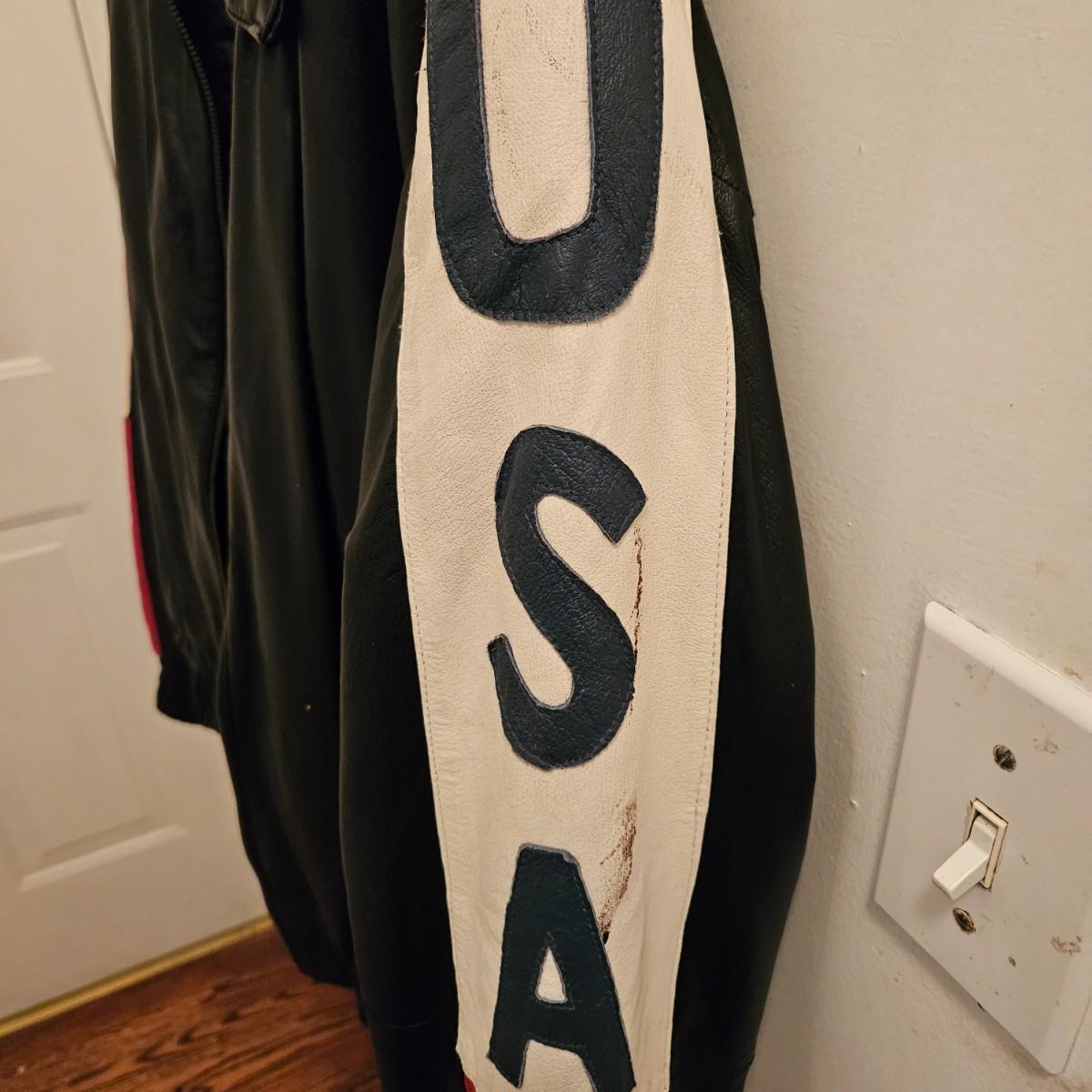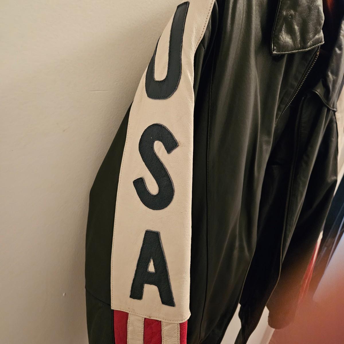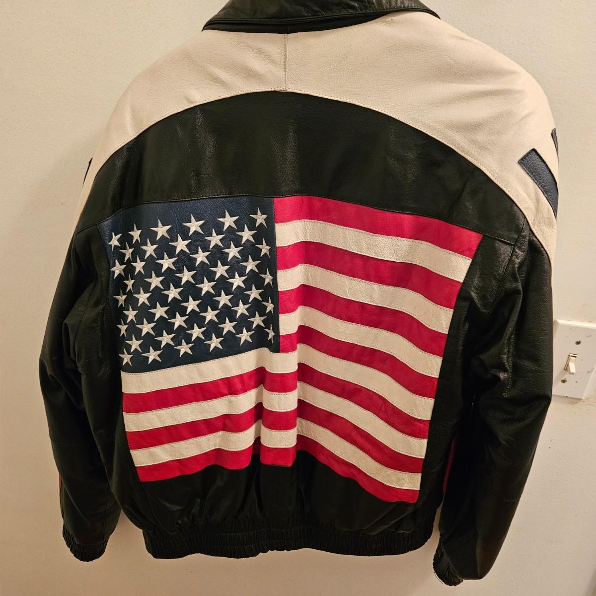 A size M leather jacket made by Extreme Biker that feature USA in the sleeves and an American flag on the back and a removable Thinsulate liner. There are some minor stains on one sleeve, which appears to be cleanable. Shipping available
