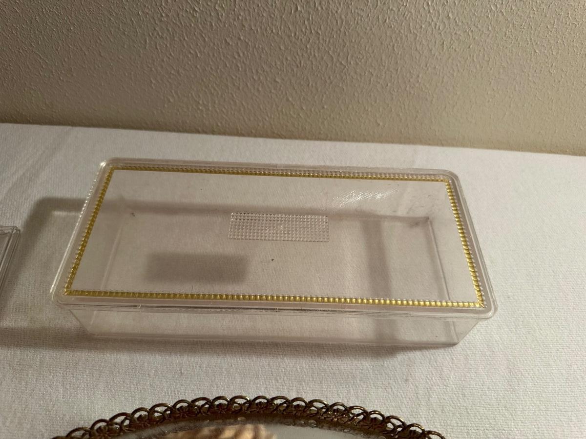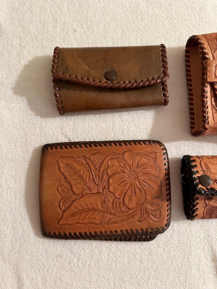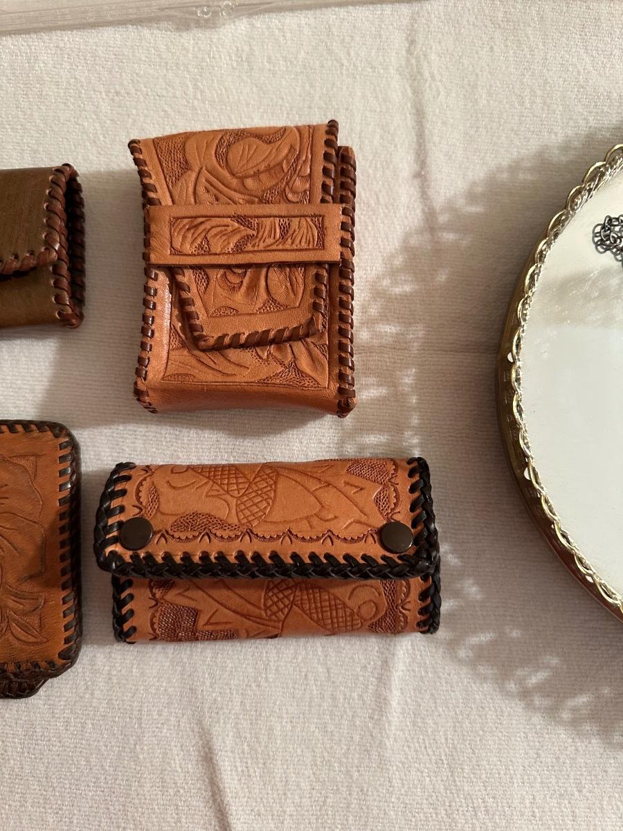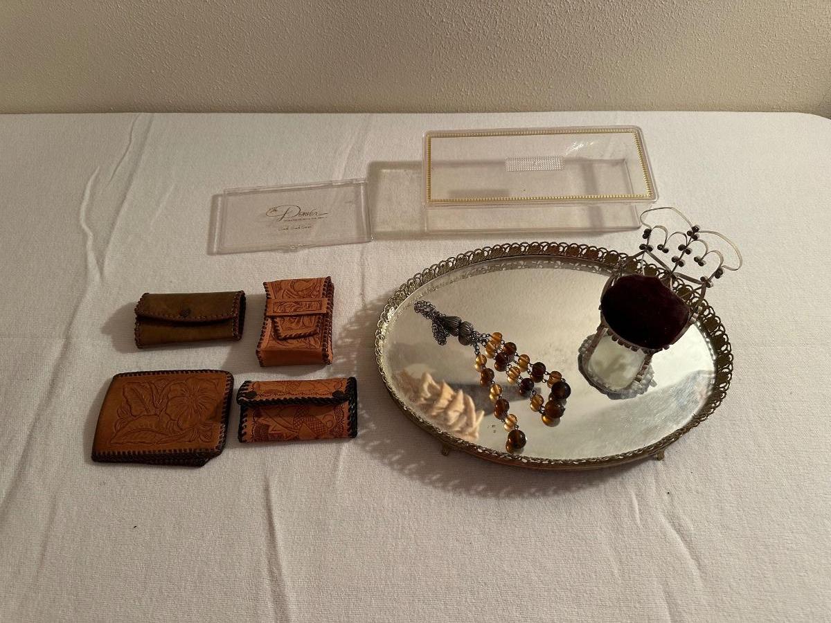 LEATHER TOOLED CASES, DRESSER TOP MIRROR, PIN CUSHION AND MORE