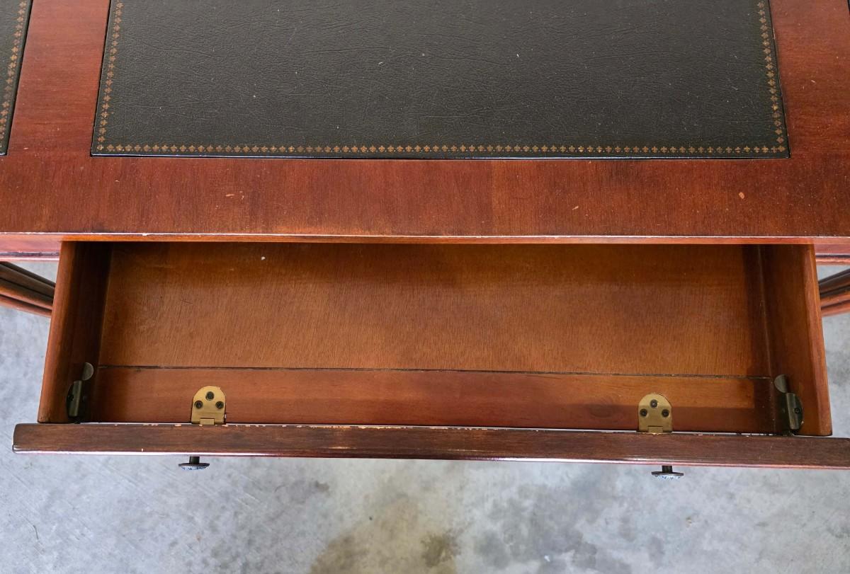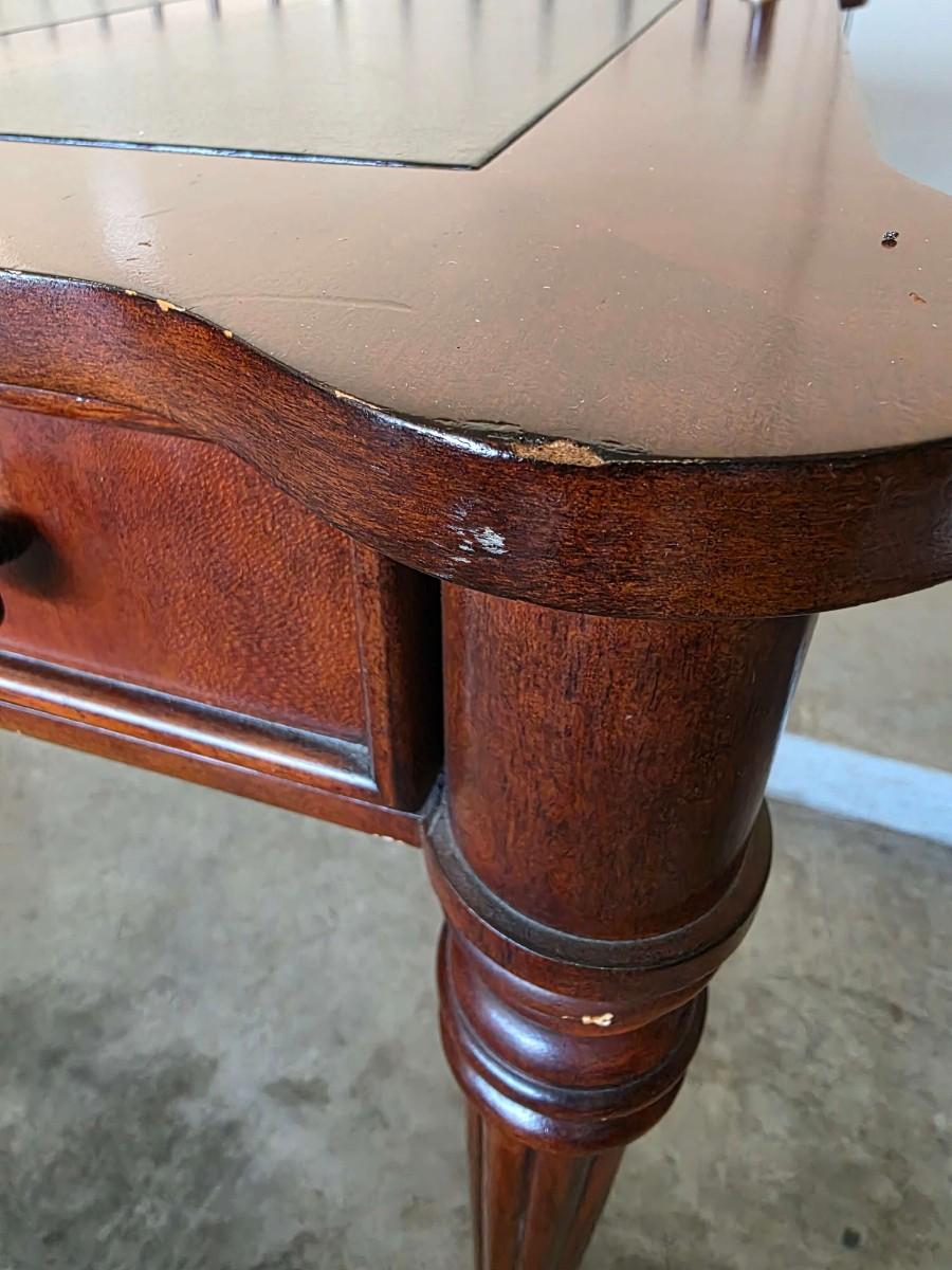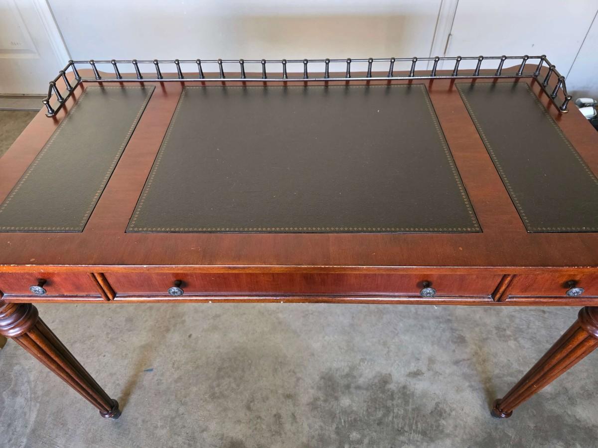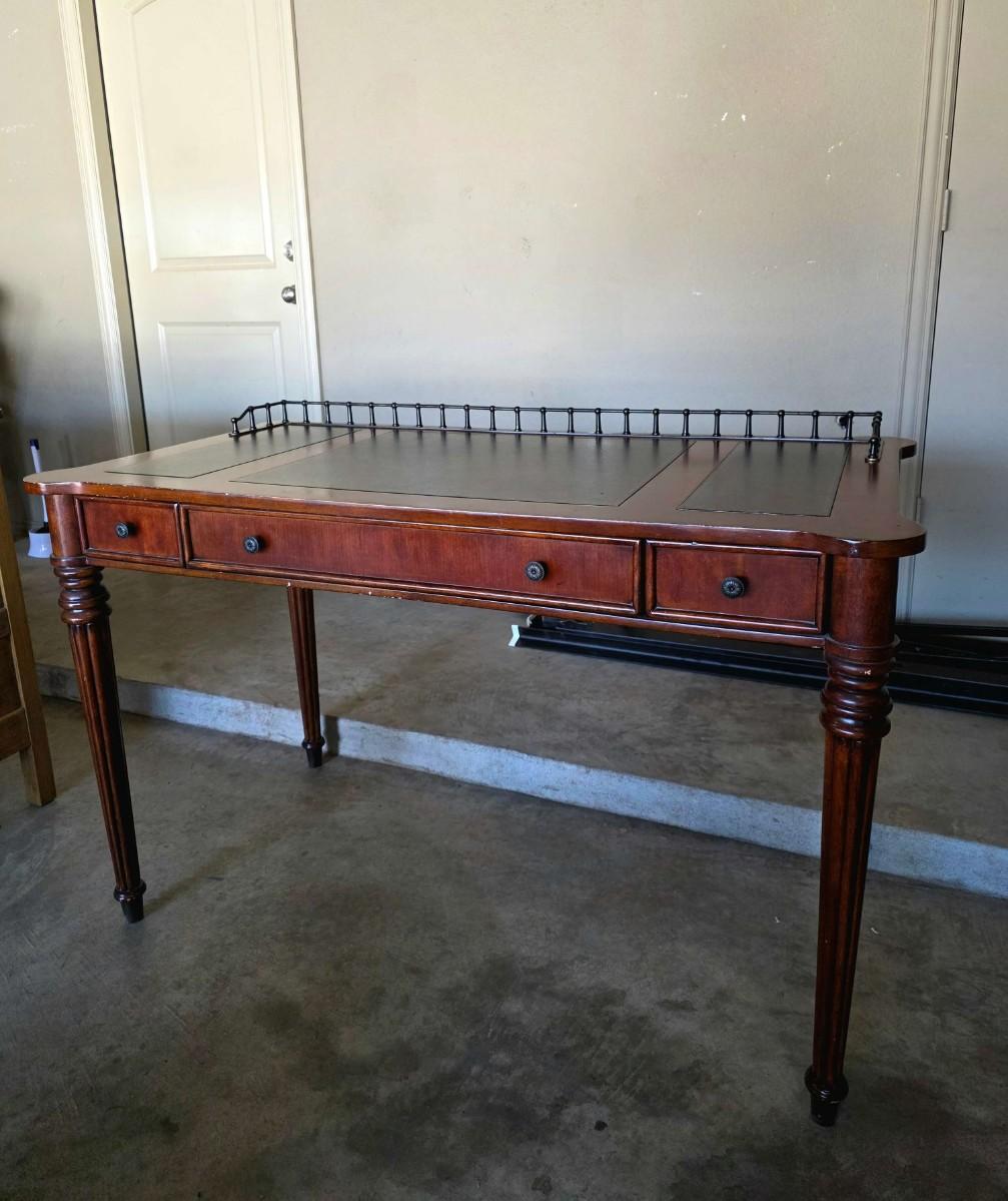 Vintage Leather Top Desk/writing table with 3 drawers. Does have some imperfections on the wood has pictured. 48"L x 26"W x 30.5"H.