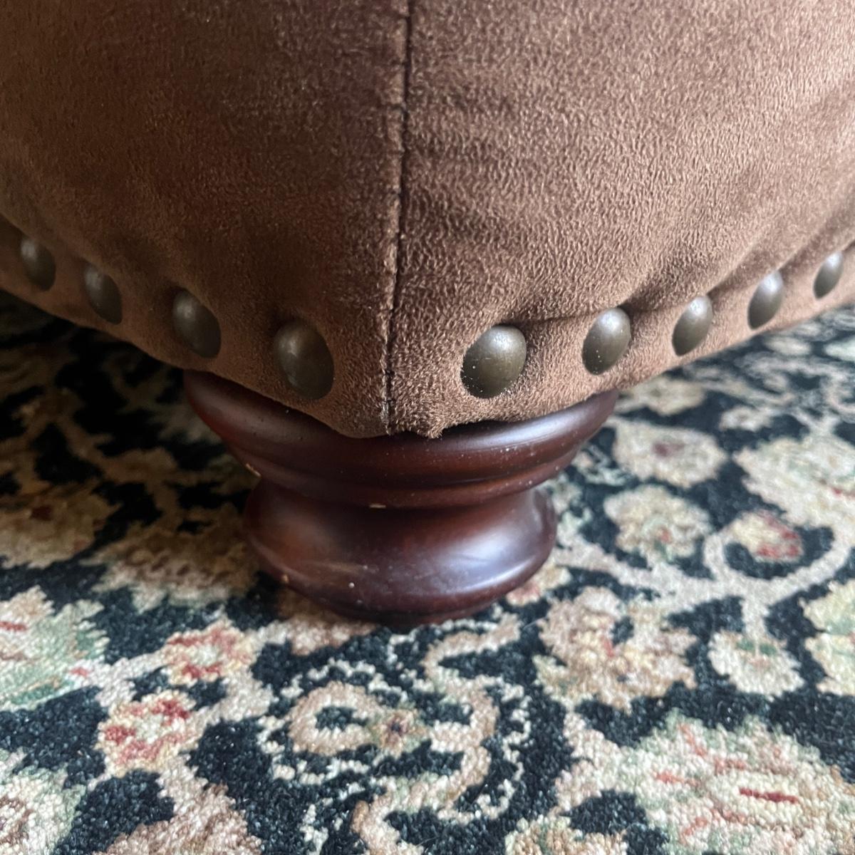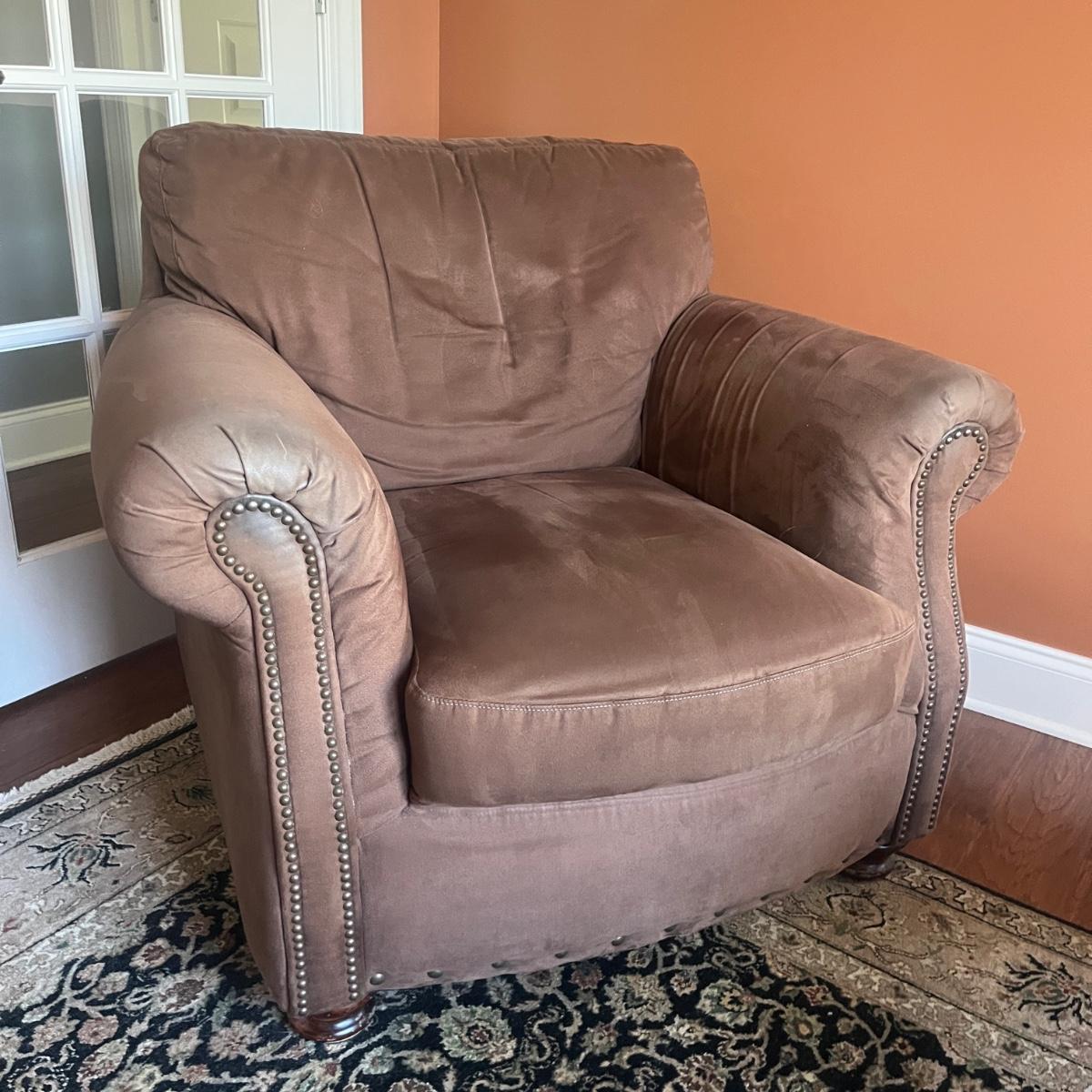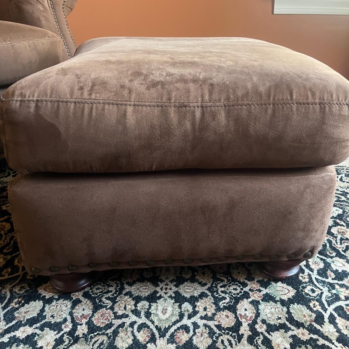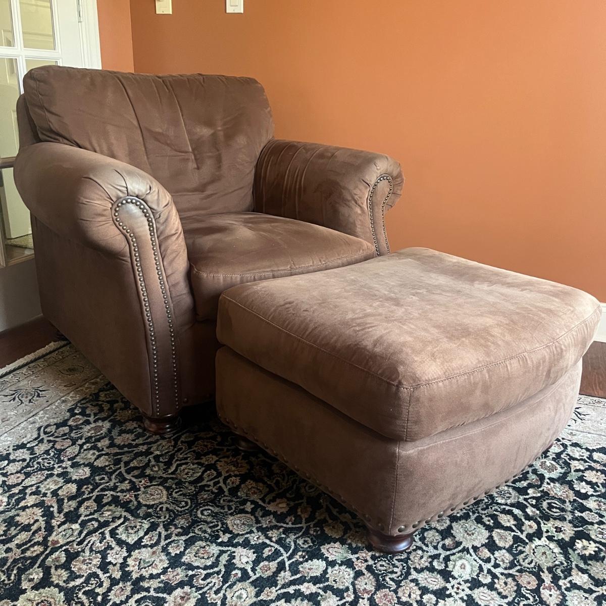 Lot includes a Leather Trend brand over-sized armchair and matching ottoman with brass tack trim and round wooden feet. Chair measures 42” x 37” x 33”H with a seat height of 19”H and ottoman measures 27” x 23” x 18”H. Appears to be made of microfiber or faux suede. See fabric care splotch for details.