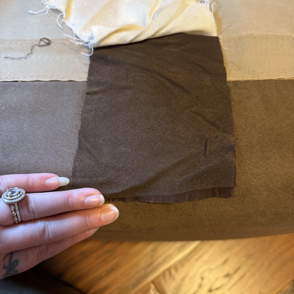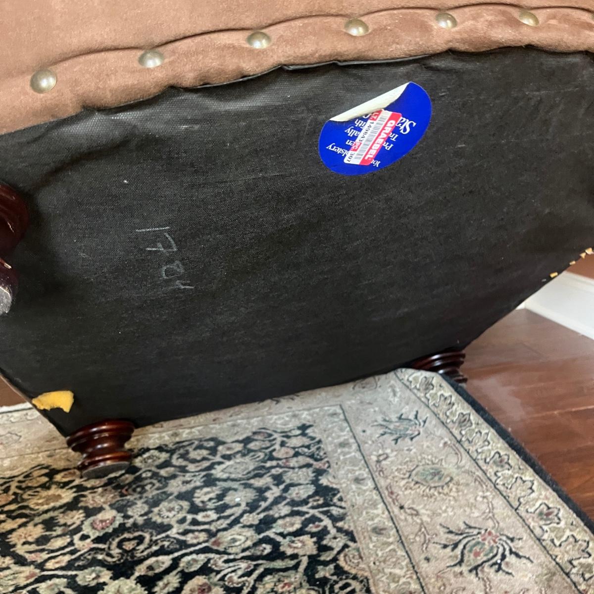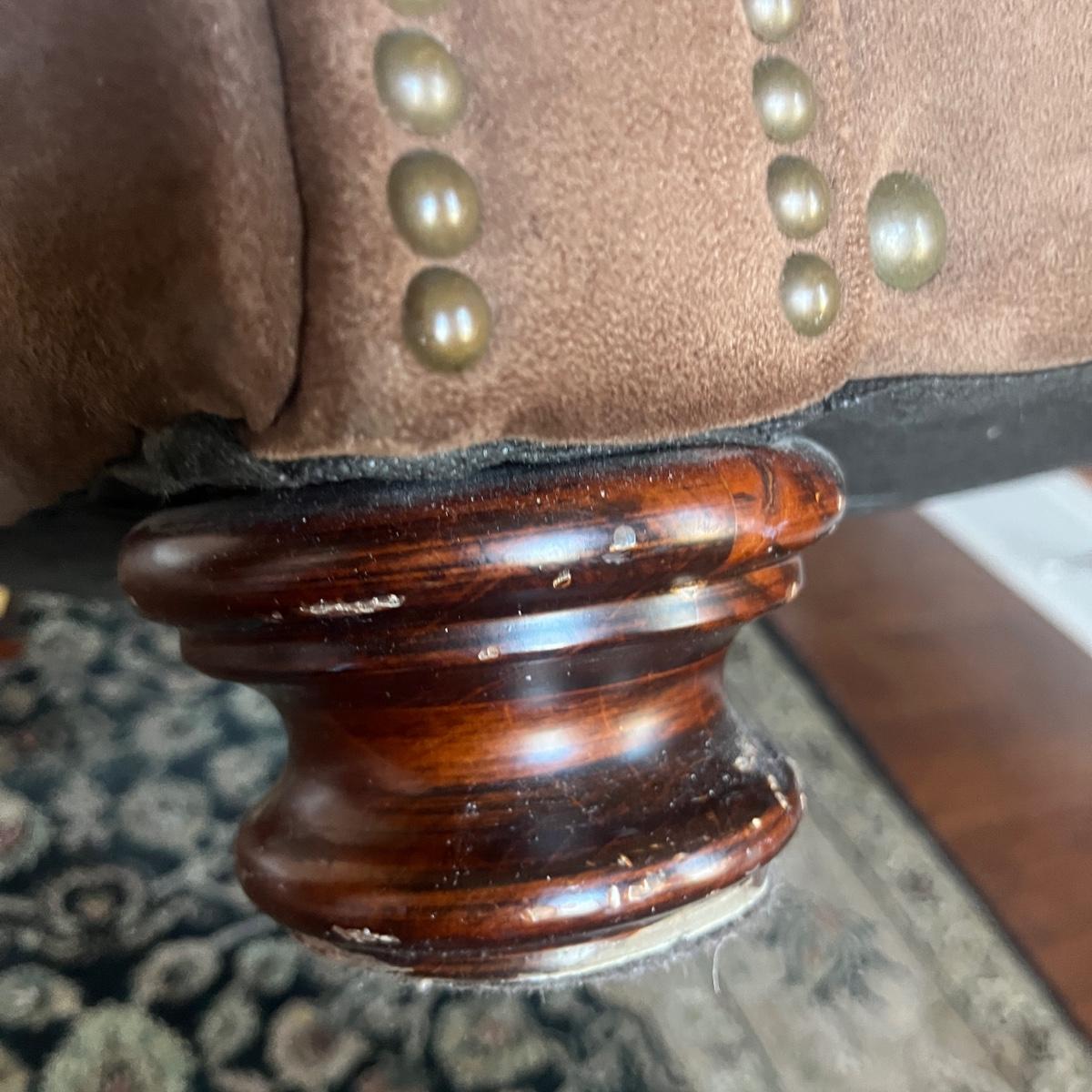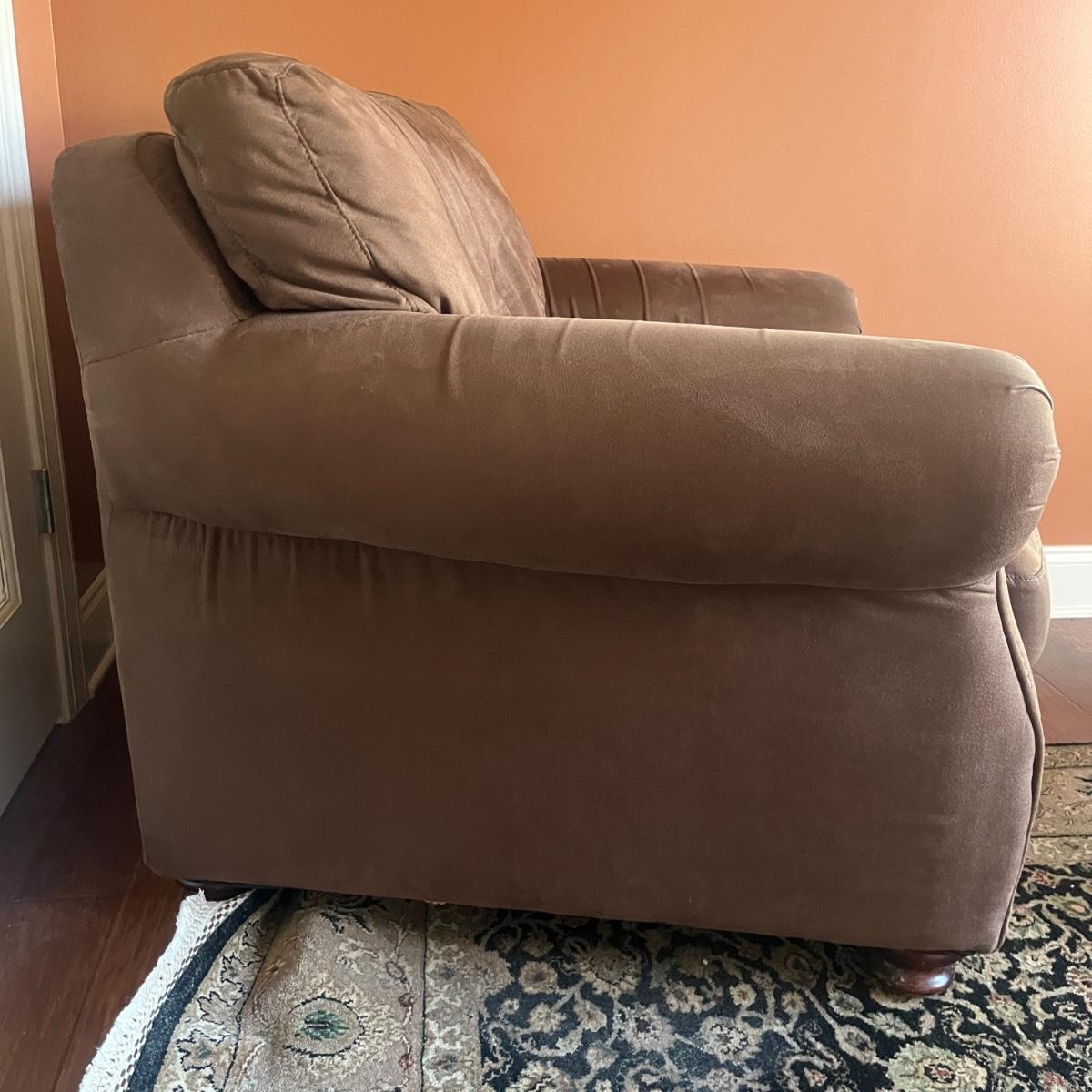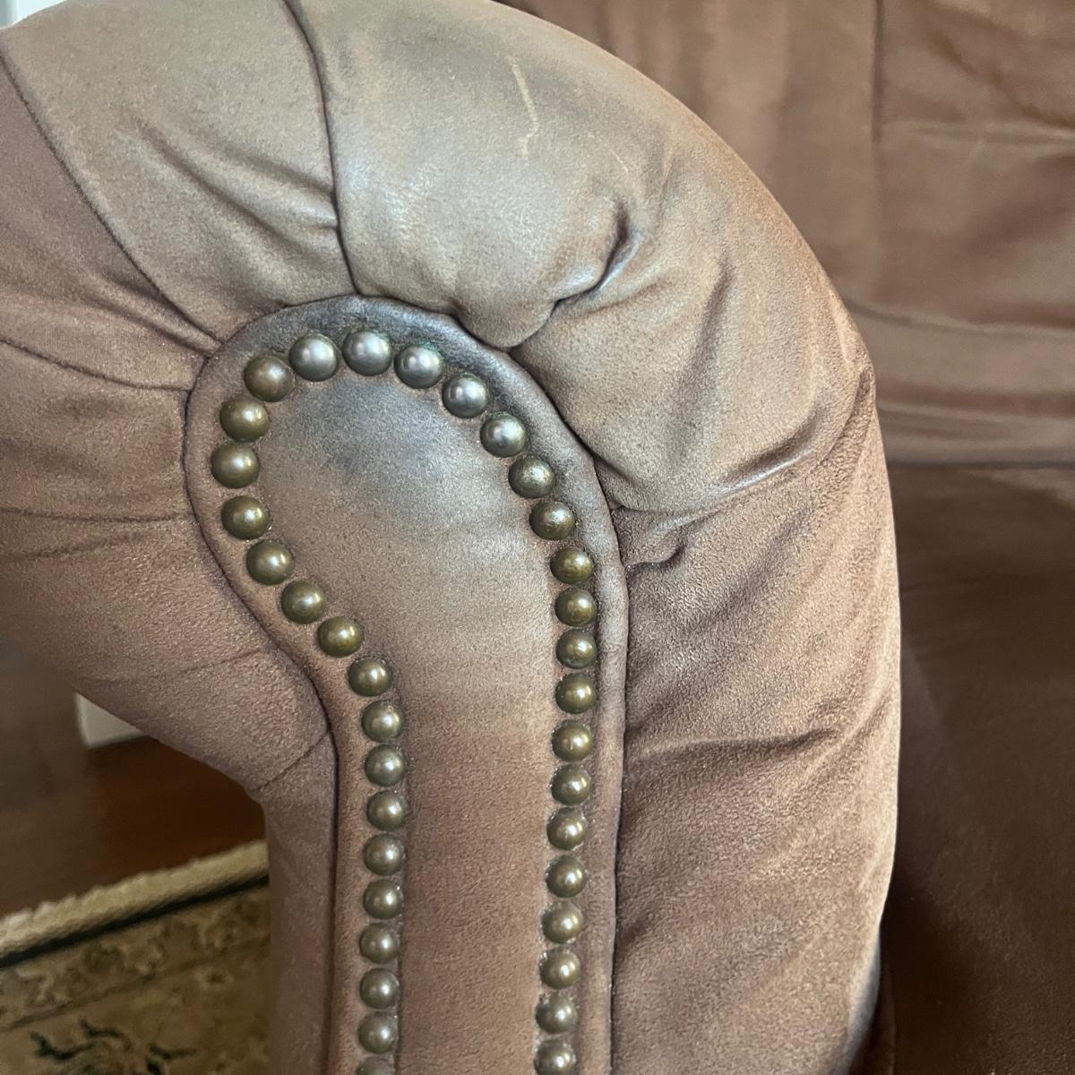 Lot includes a Leather Trend brand over-sized armchair and matching ottoman with brass tack trim and round wooden feet. Chair measures 42” x 37” x 33”H with a seat height of 19”H and ottoman measures 27” x 23” x 18”H. Appears to be made of microfiber or faux suede. See fabric care splotch for details.