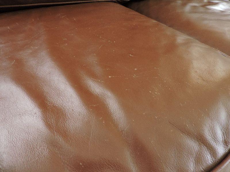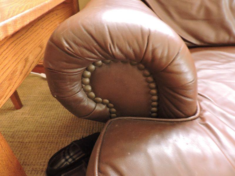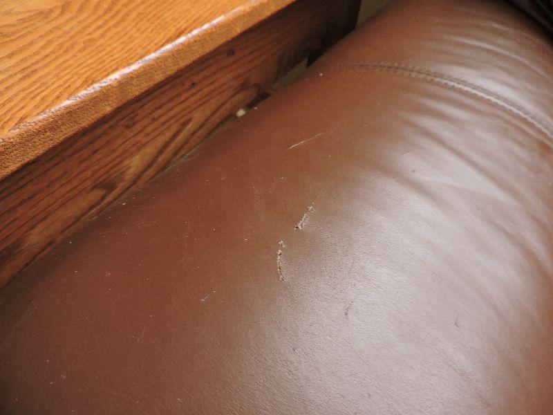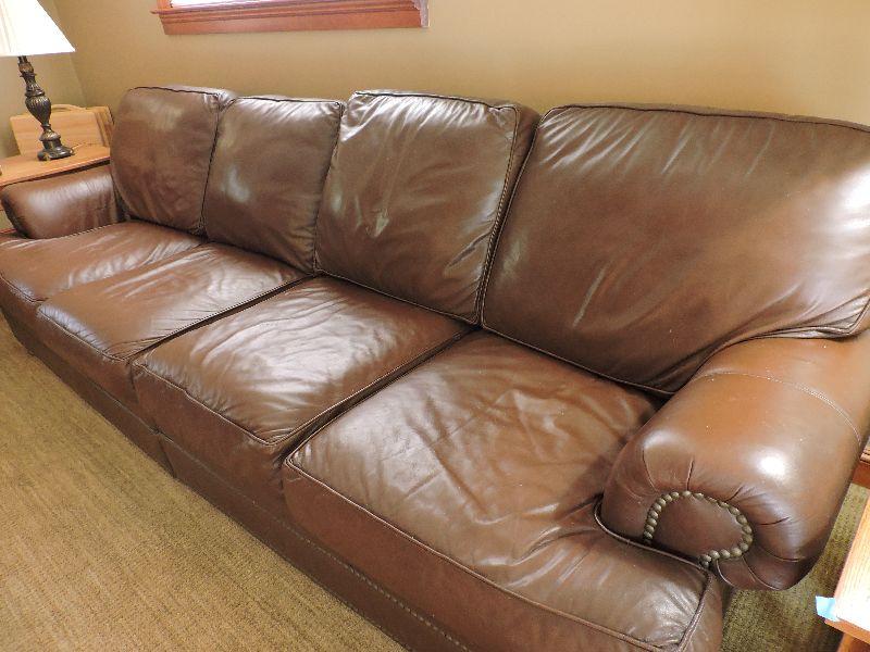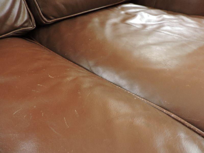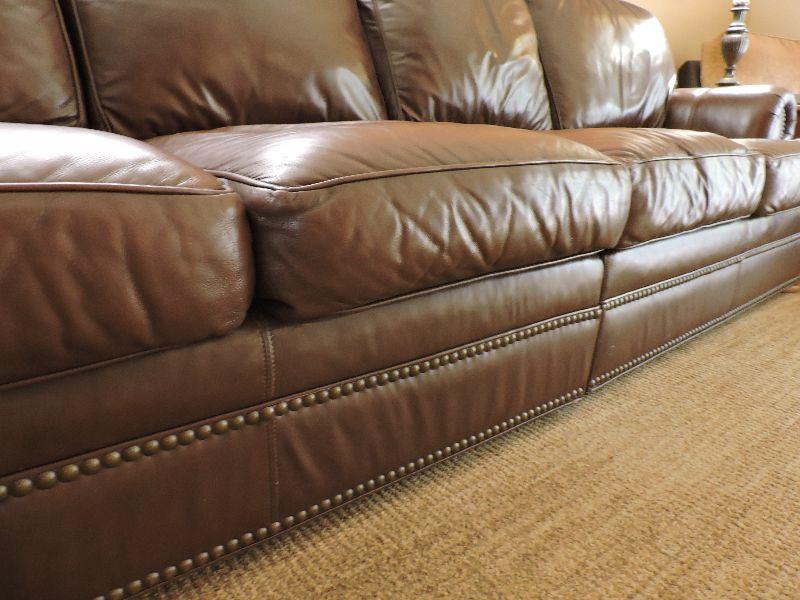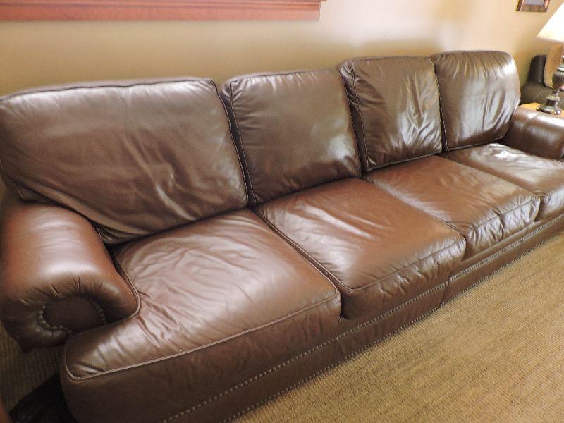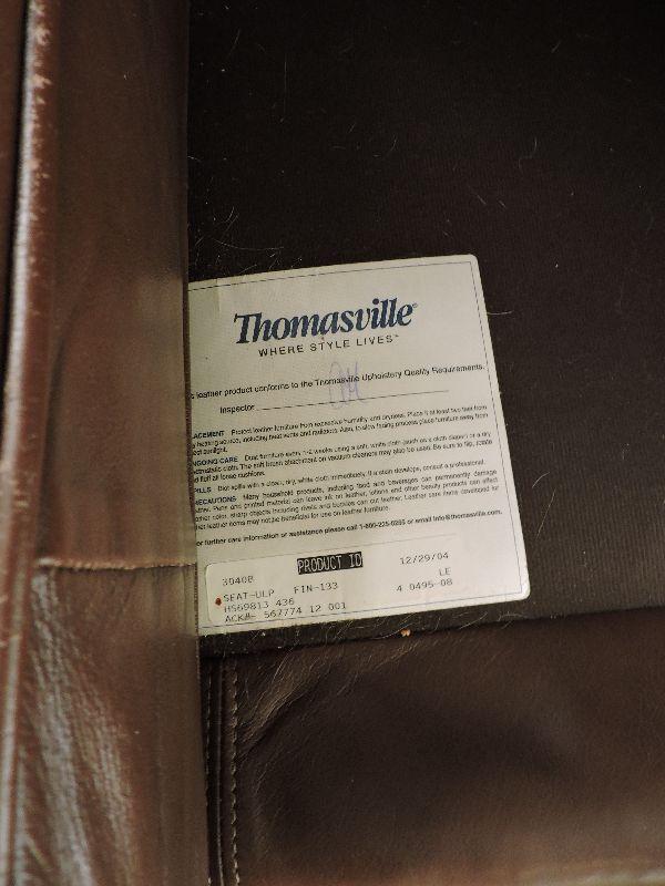 Thomasville leather sofa seats 4 or more when put together, can be divided into 2 sections. Very nice piece, but does have cat damage. Bring help to move. Please read Terms and Conditions before placing a bid. Pick up is Friday, October 25th between 4 and 7, and Saturday, October 26th between 9 and 1. Props included in photos are not included in listing. All measurements are approximate. Comes from home with cats.