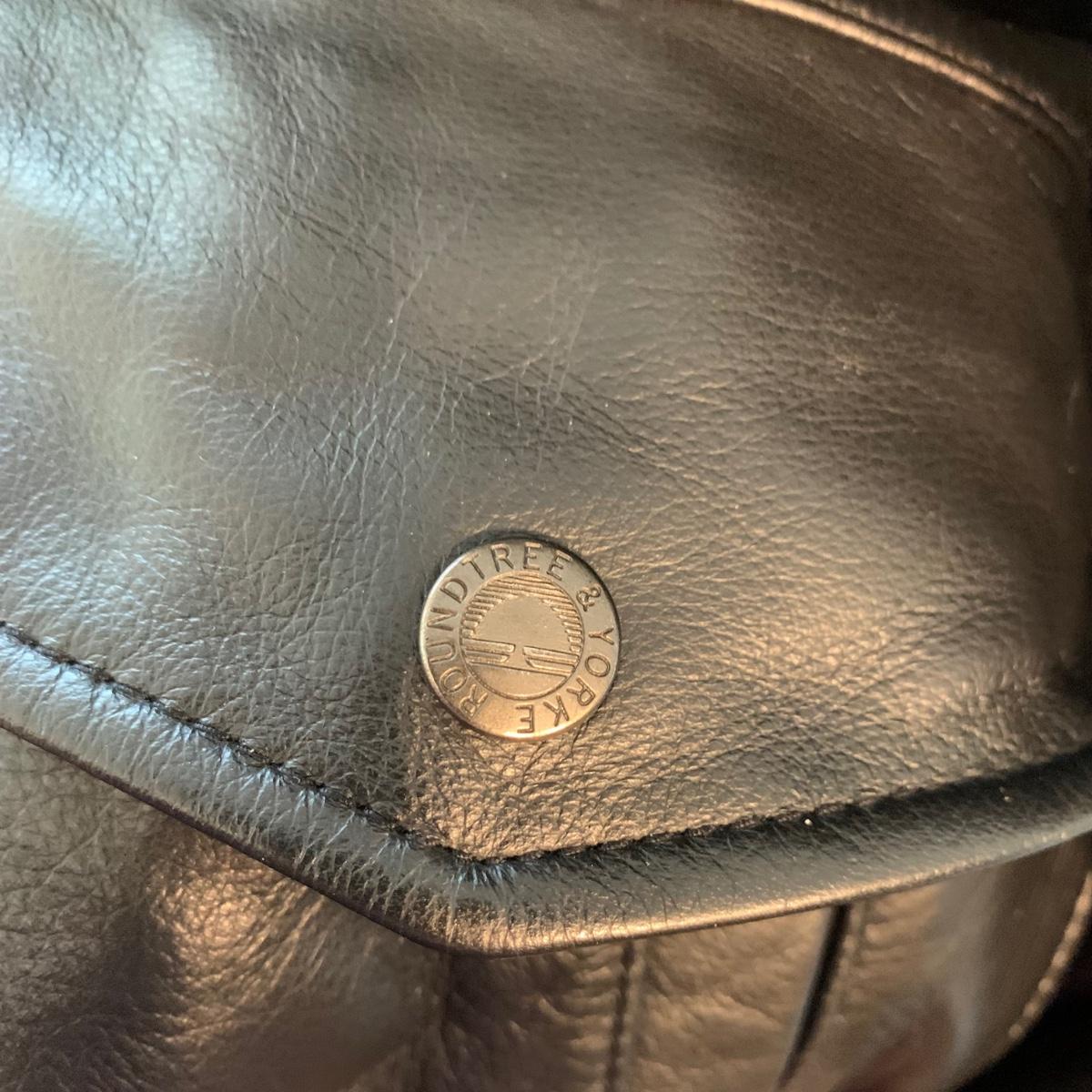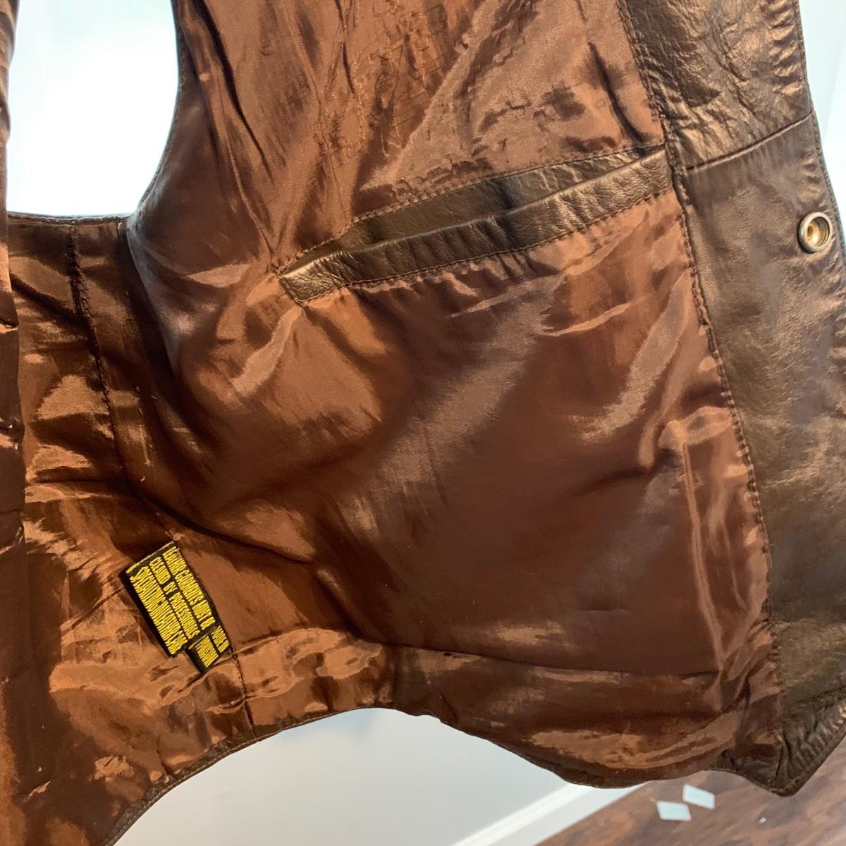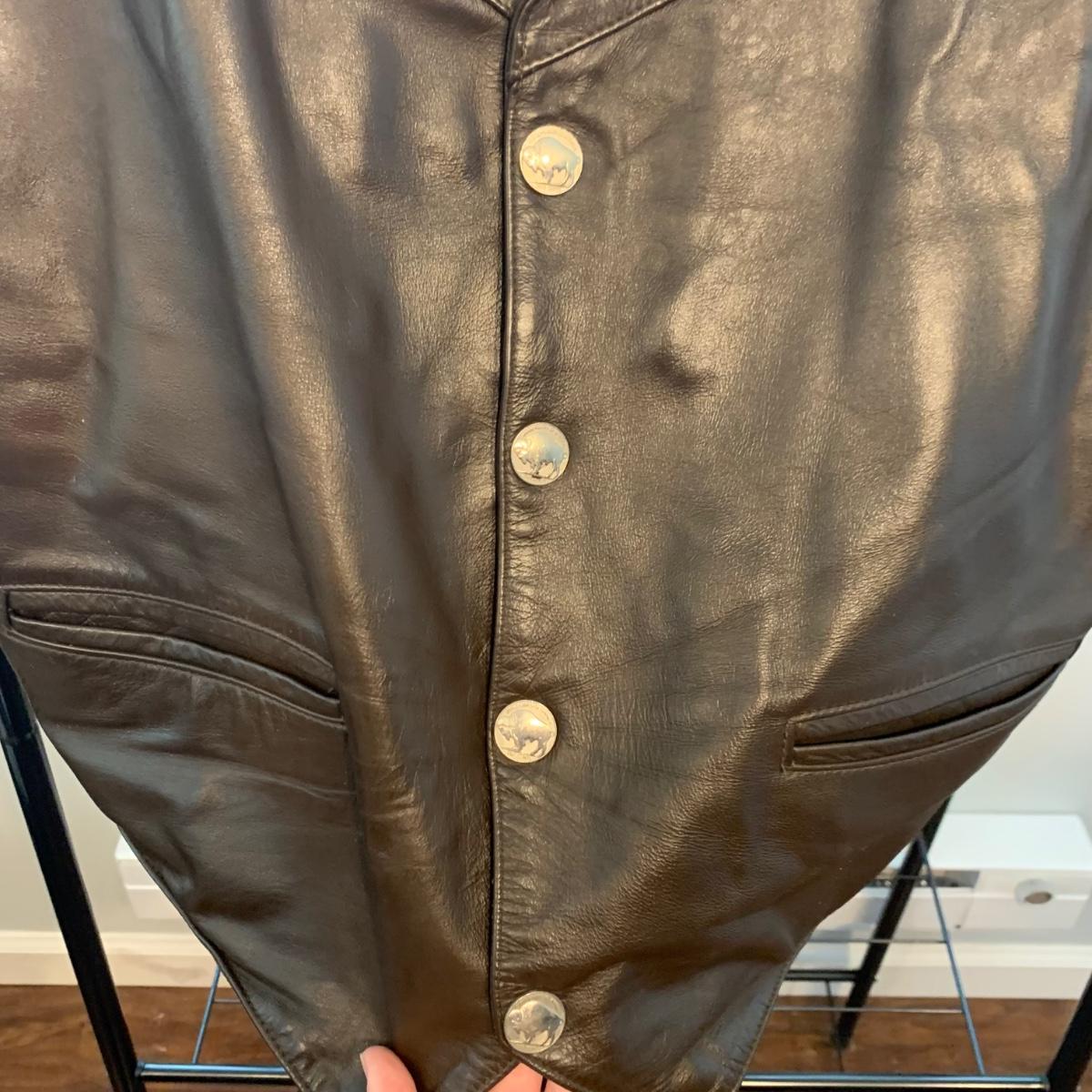 Three men’s leather garments. One brown Scully vest with buffalo nickel buttons, a black Roundtree & Yorke jacket, and a dark brown IZOD jacket. All are size XL. The IZOD has a few scuffs; see photos. Hangers are not included.