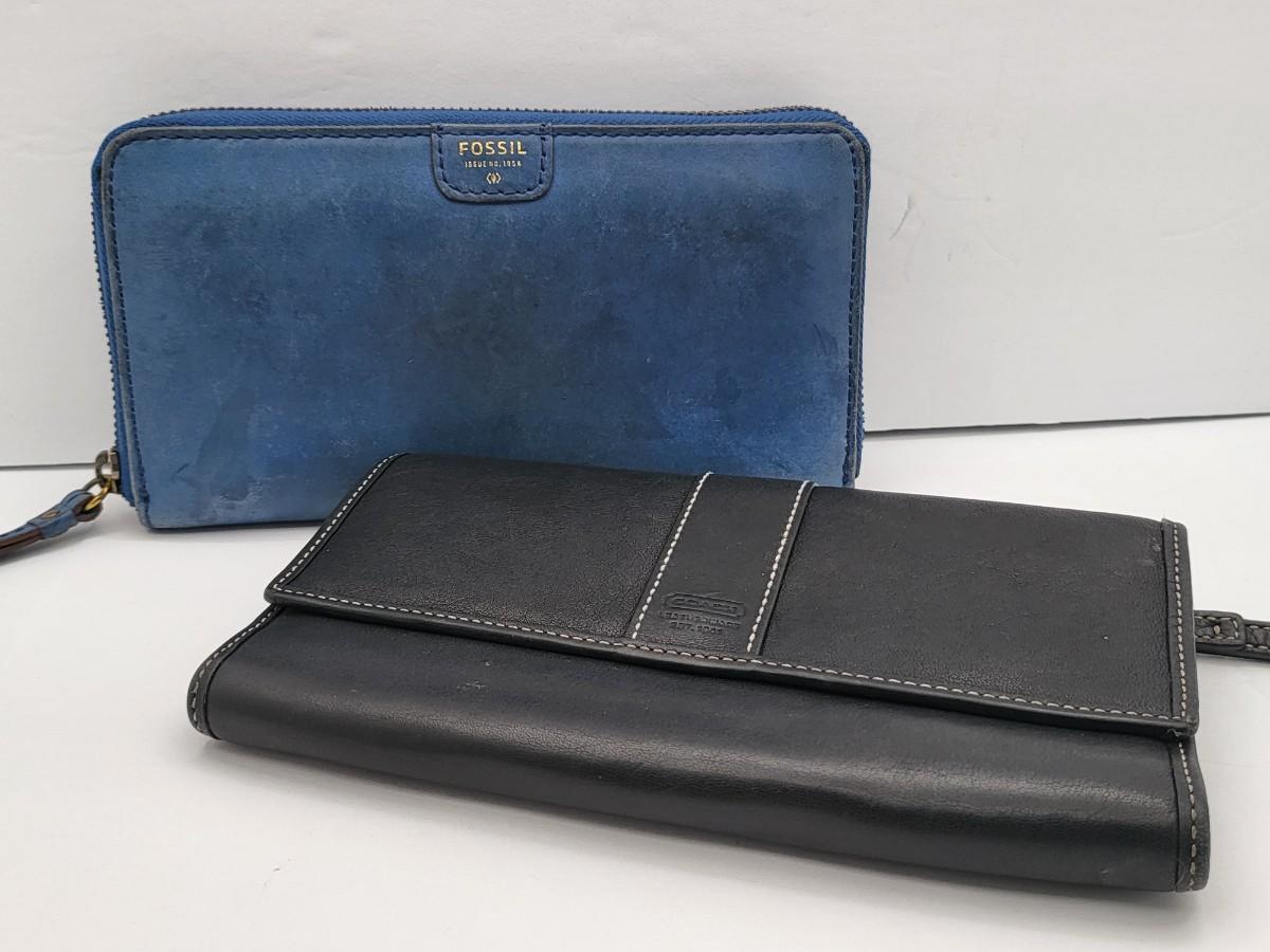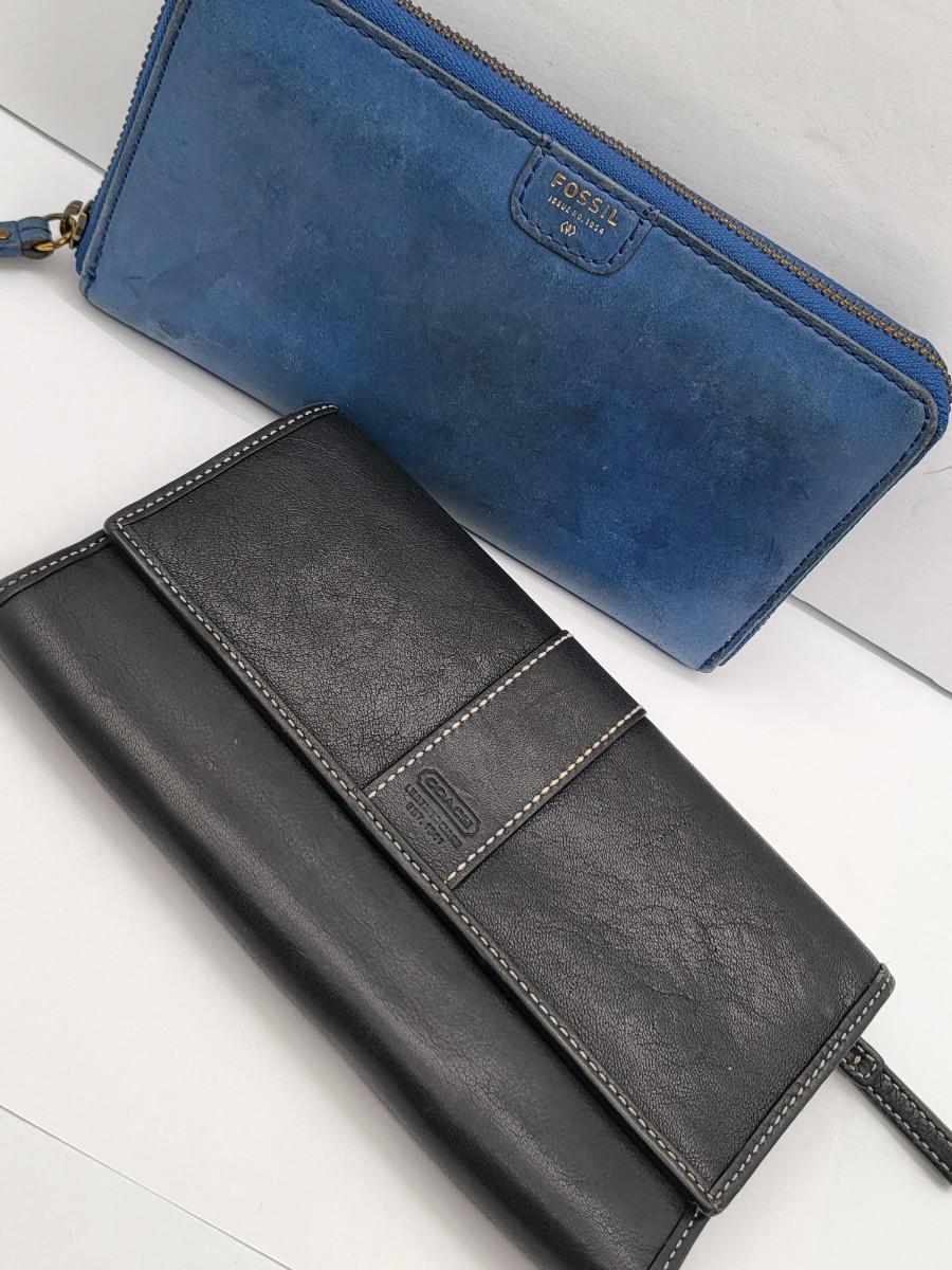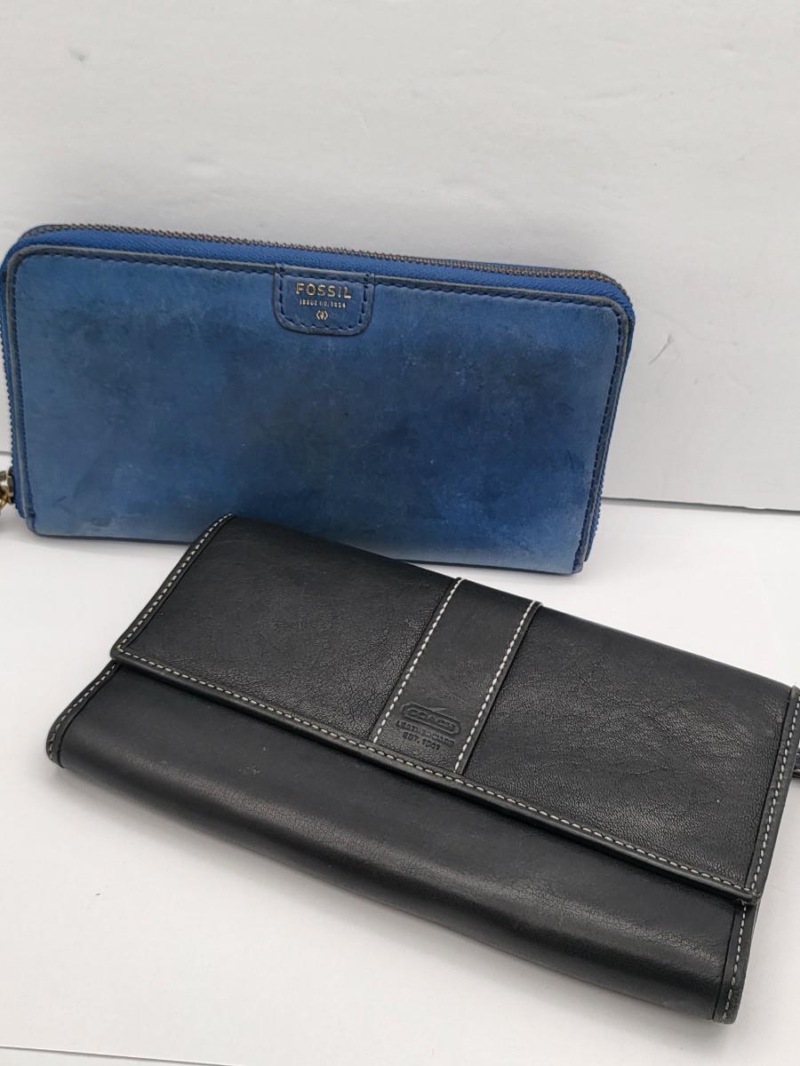 Black leather, trifold, Coach wallet and blue leather zip around Fossil brand wallet, measure 7.5" x 4.5".